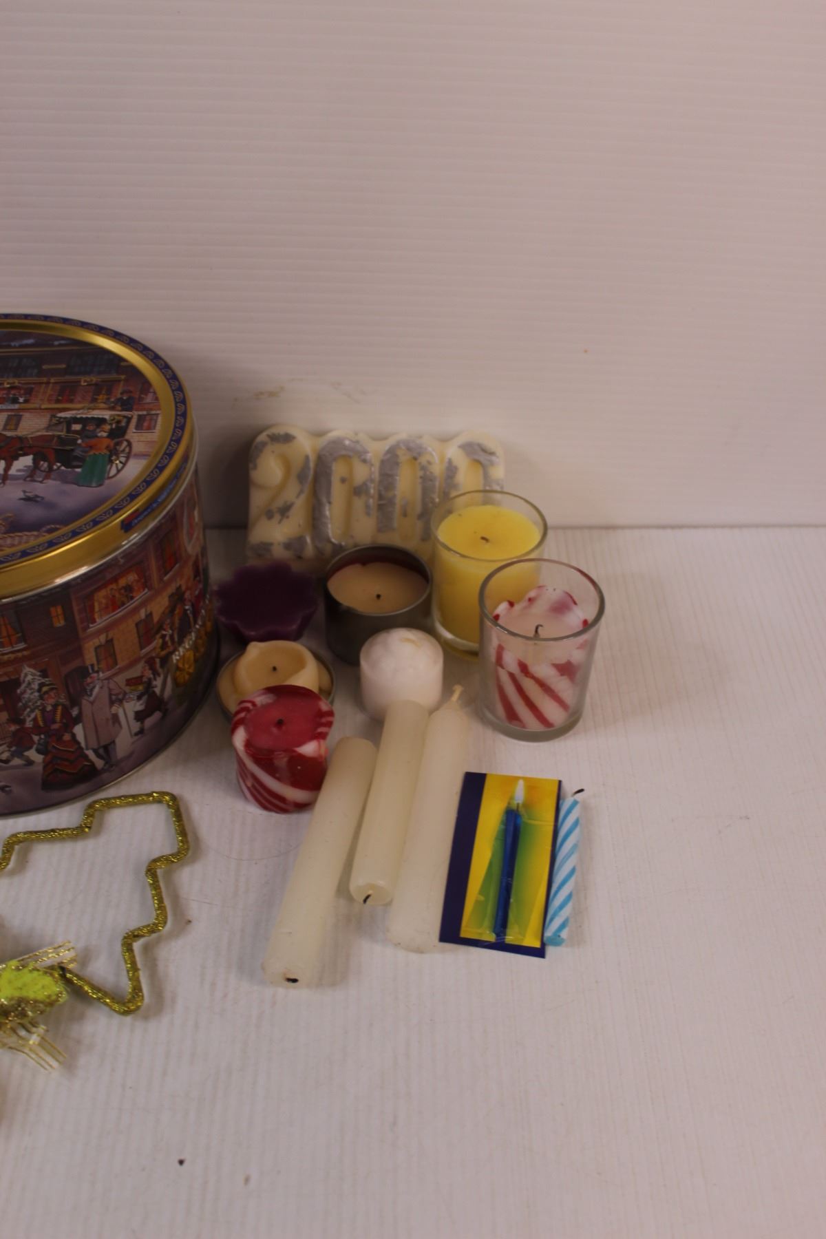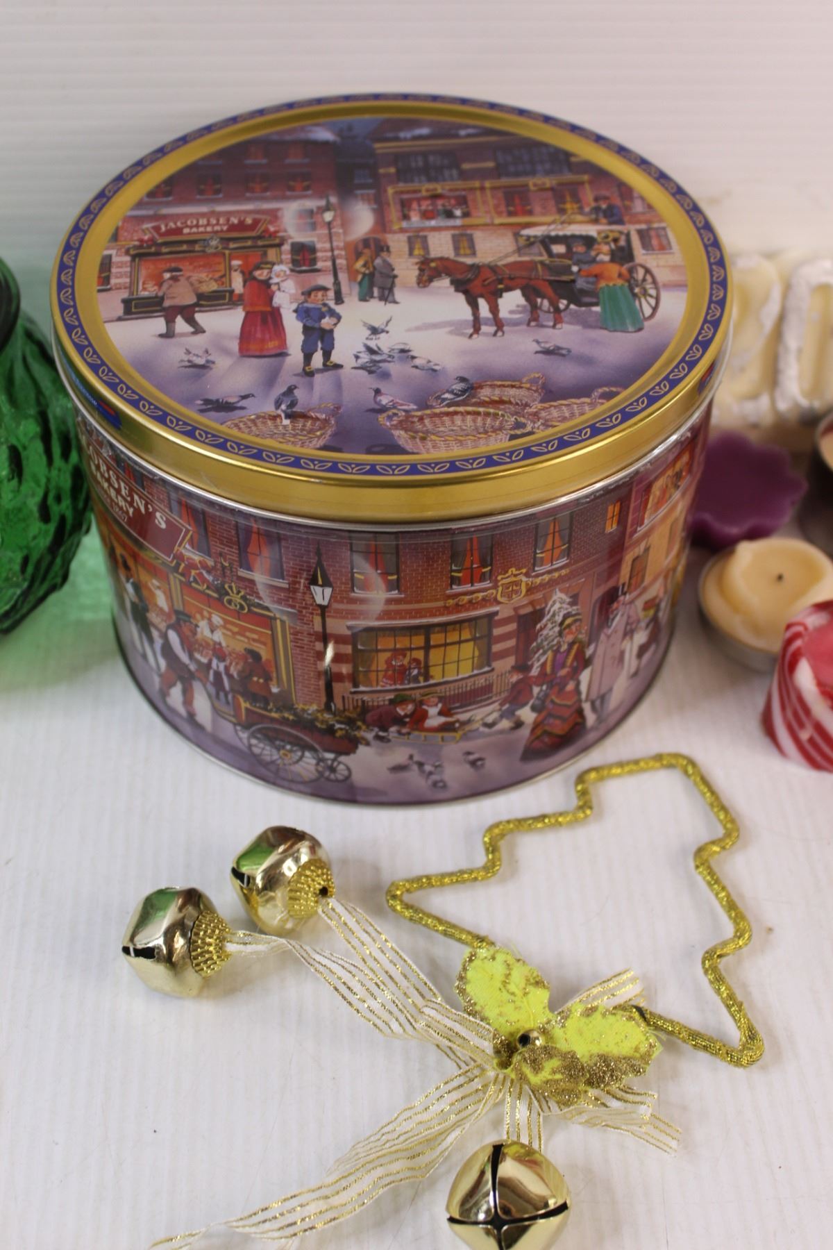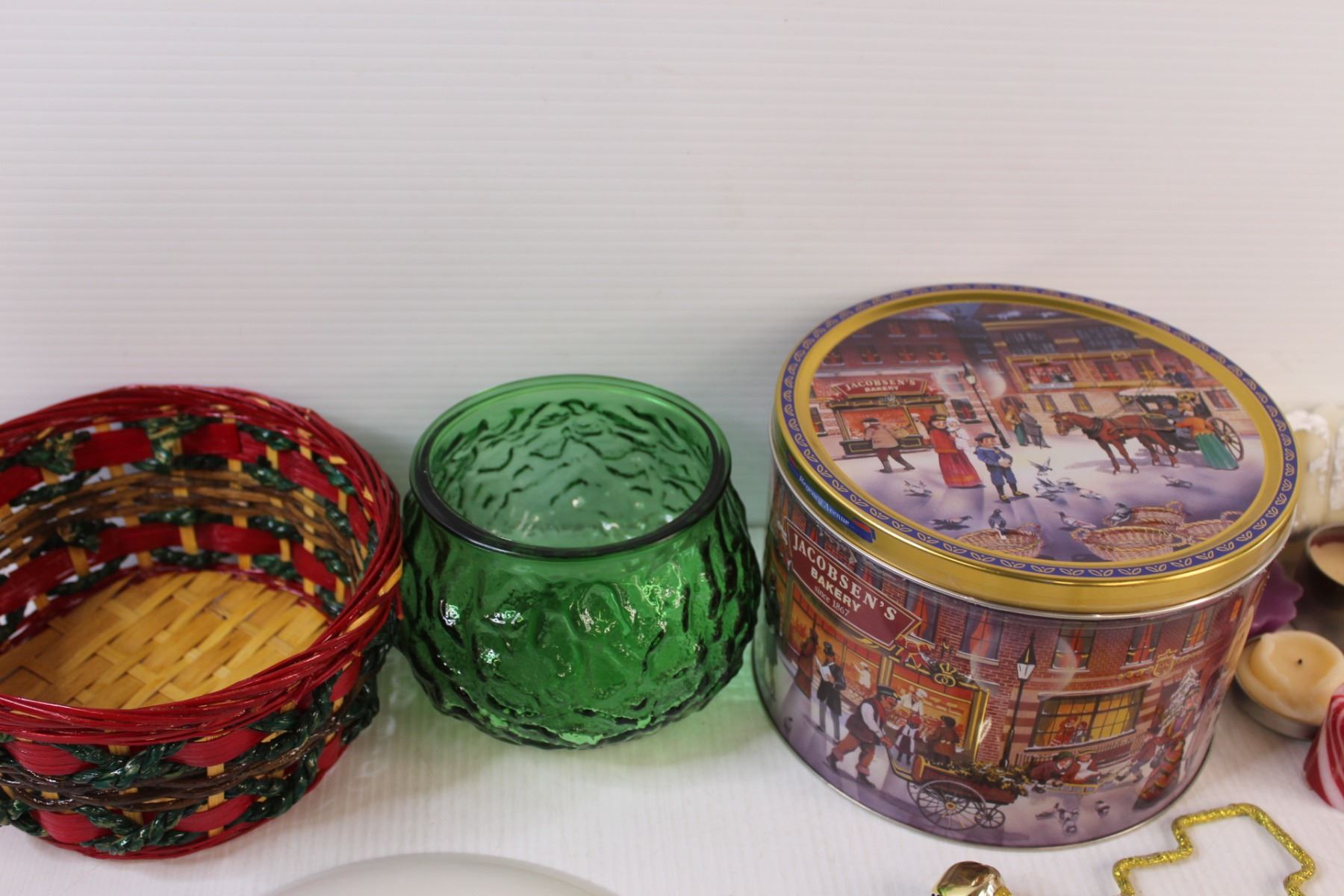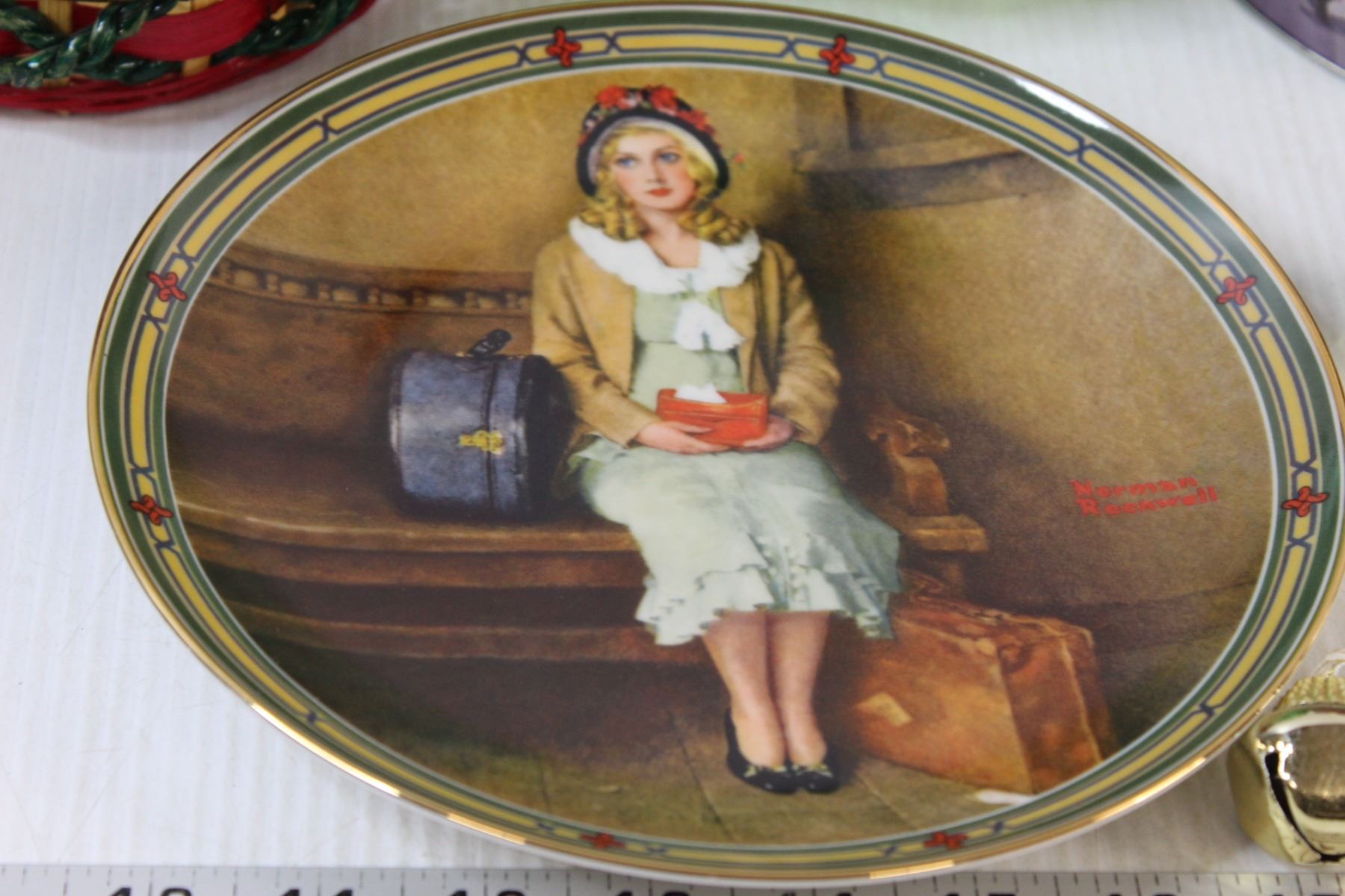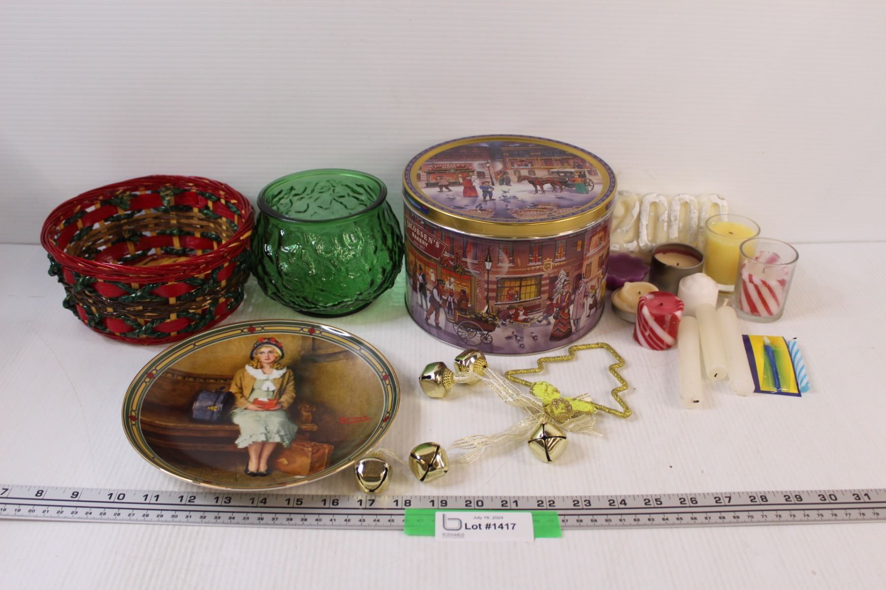 Norman Rockwell Plate, Collectors Tin w/Candles, Wicker Basket, Green Glass Bowl