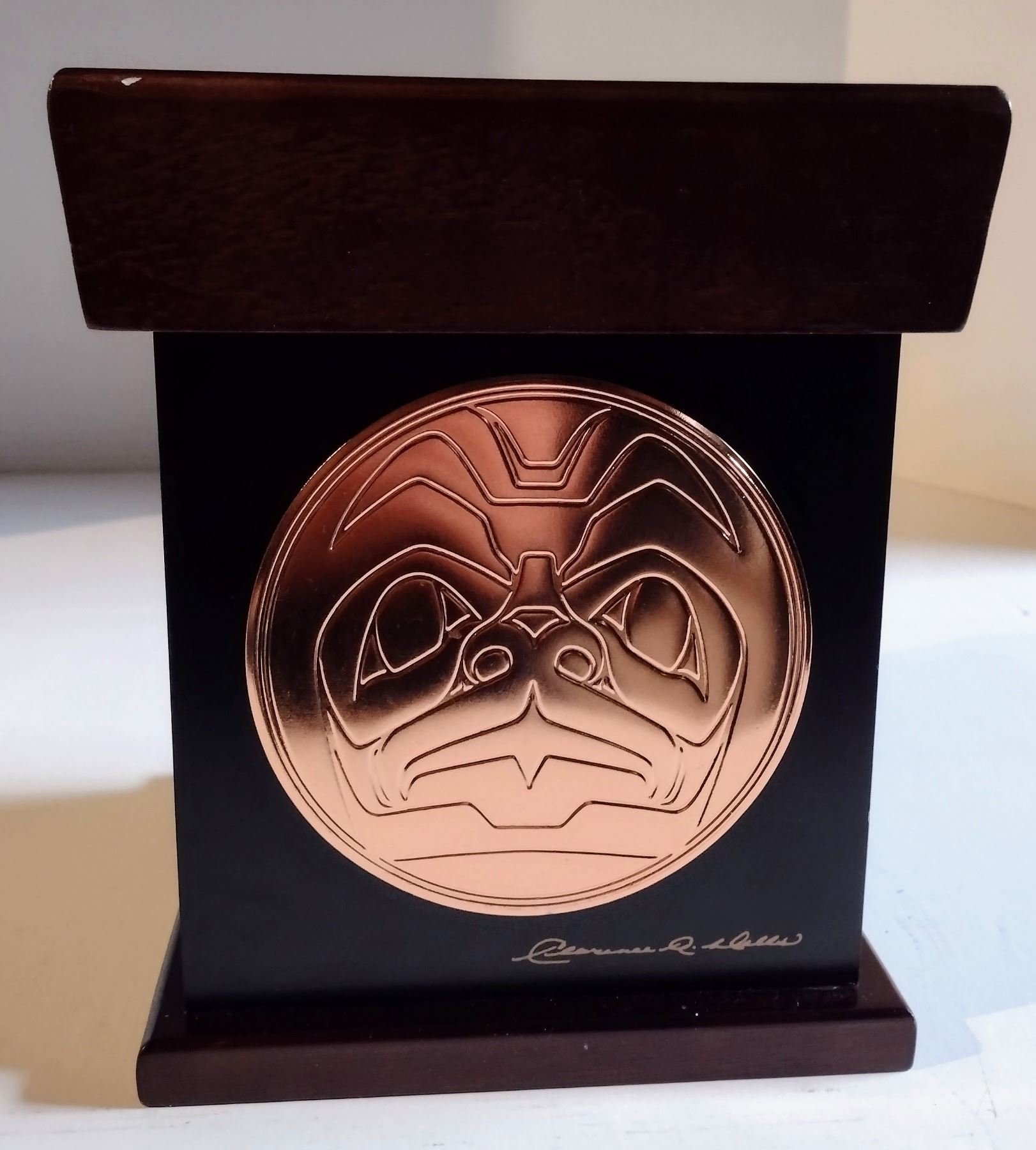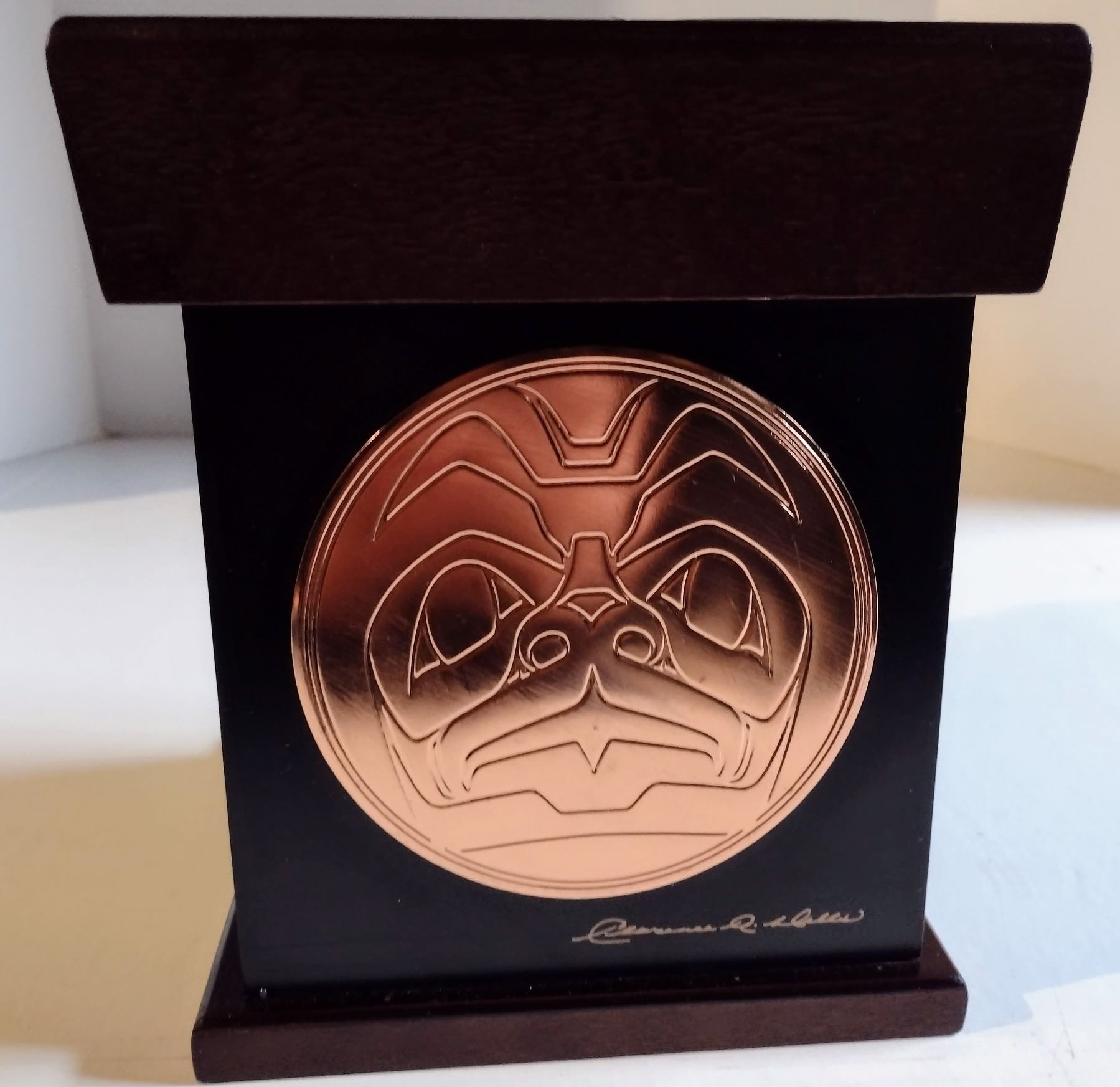 North West Coast First Nation Bentwood box. (reproduction) Stunning copper design on the box, 9 inches in height, 6 inches at the base. Artist Clarence A. Wells.