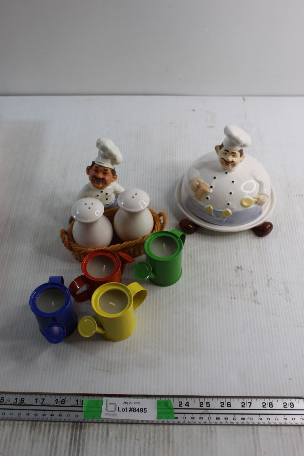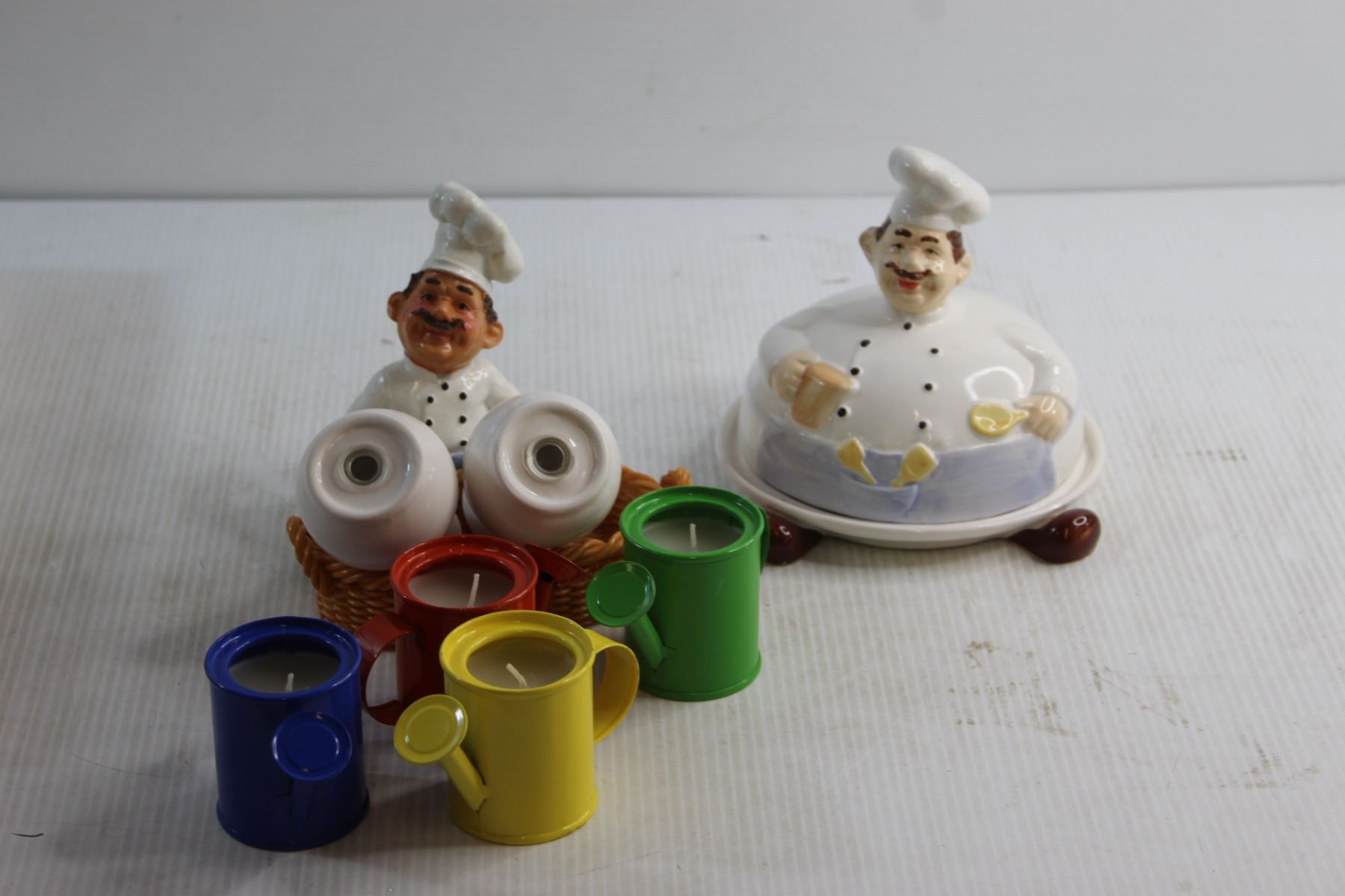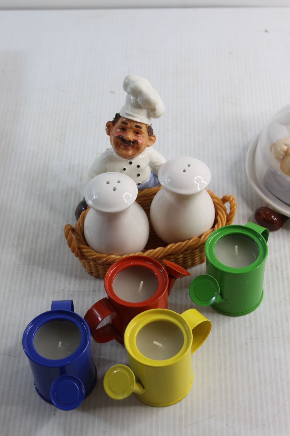 Novelty Butter Dish, (4) Watering Can Shaped Candle Holder and Salt and Pepper Shakers
