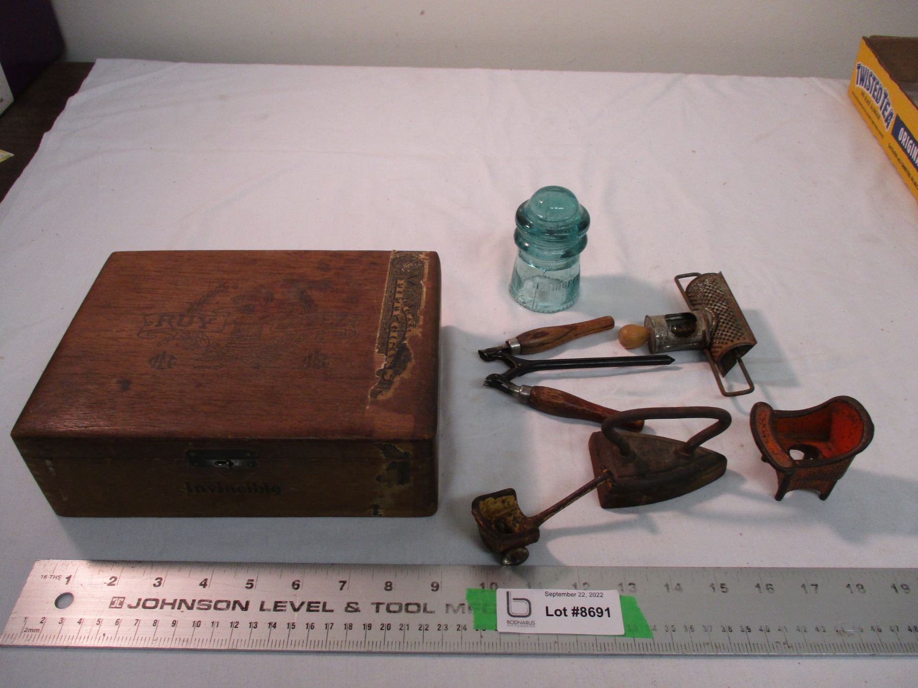 Old cigar box, sad iron, misc
