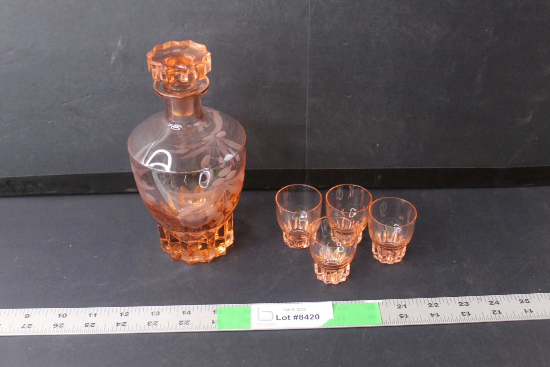 Orange Etched Glass Decanter 7.75" Tall & (4) Shot Glasses