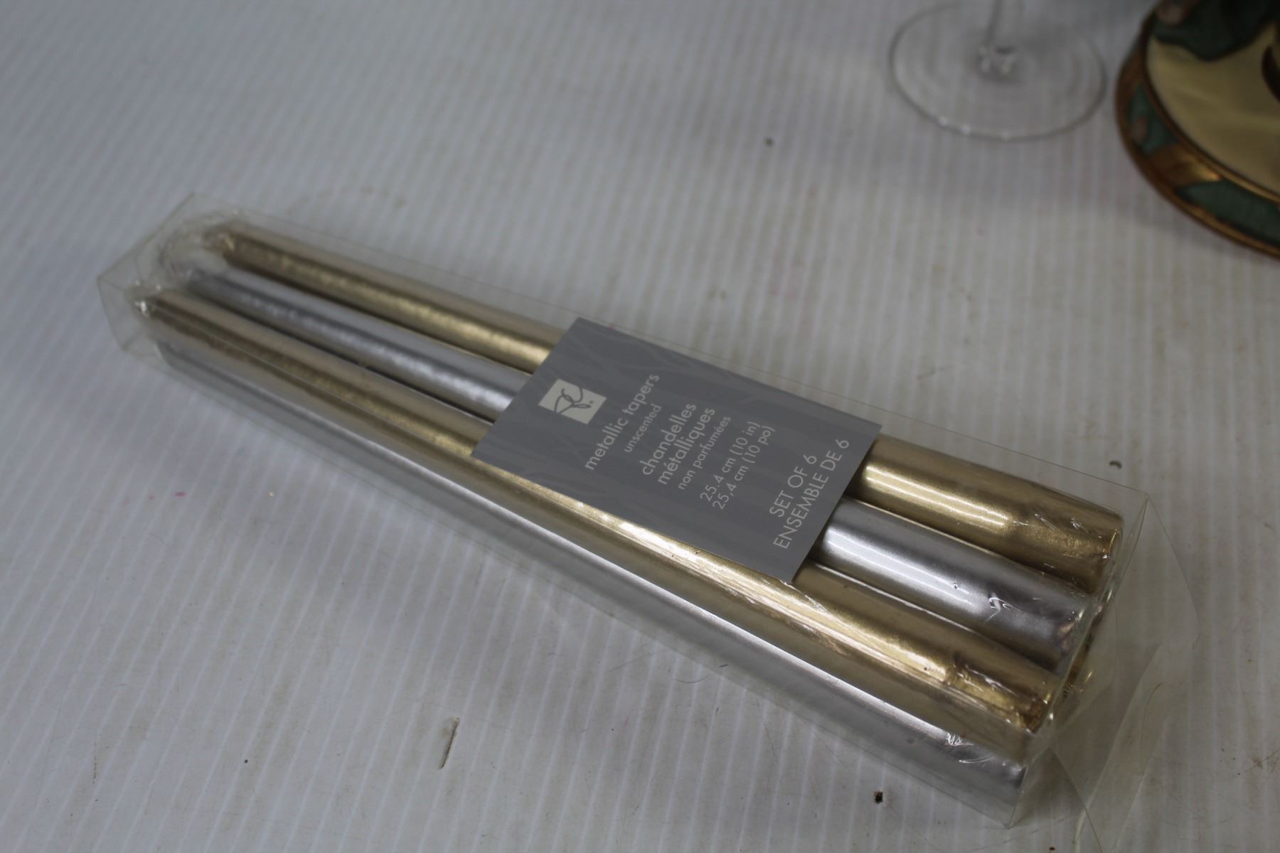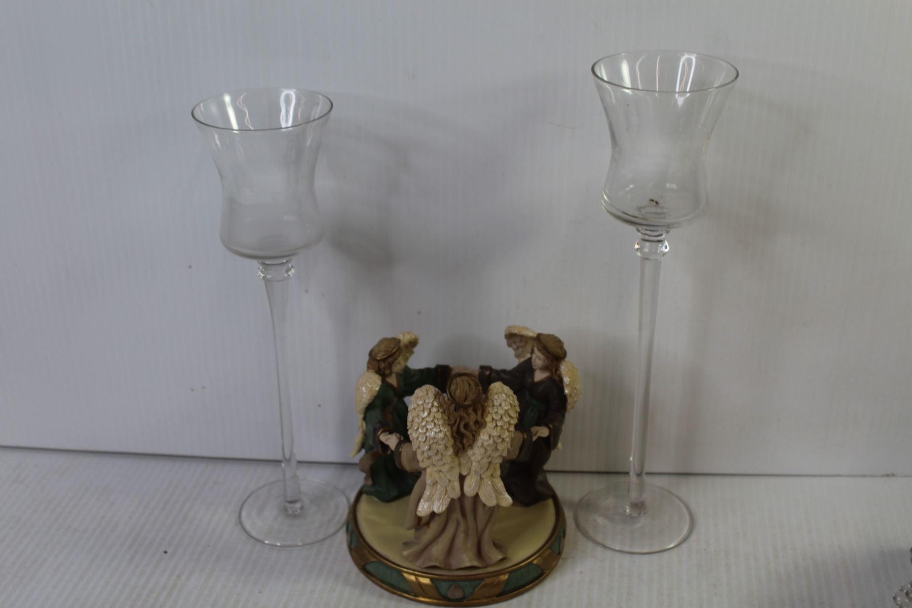 Oregon Plate - Assortment of Glass & Ceramic - Amber Glass Dish - Angel Candle Holder - (2) Long Stemmed Glasses - (6) Pack of Candles