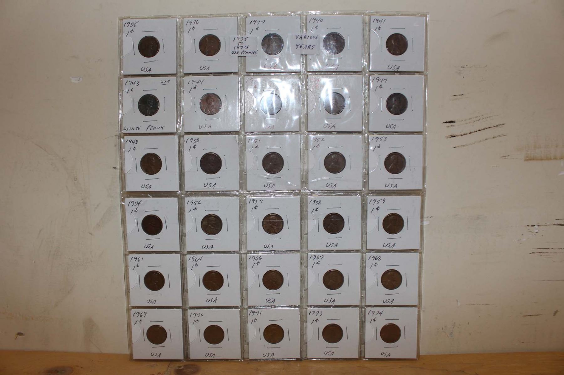 Page of USA Pennies- 1935 to 1974 (Various Years)