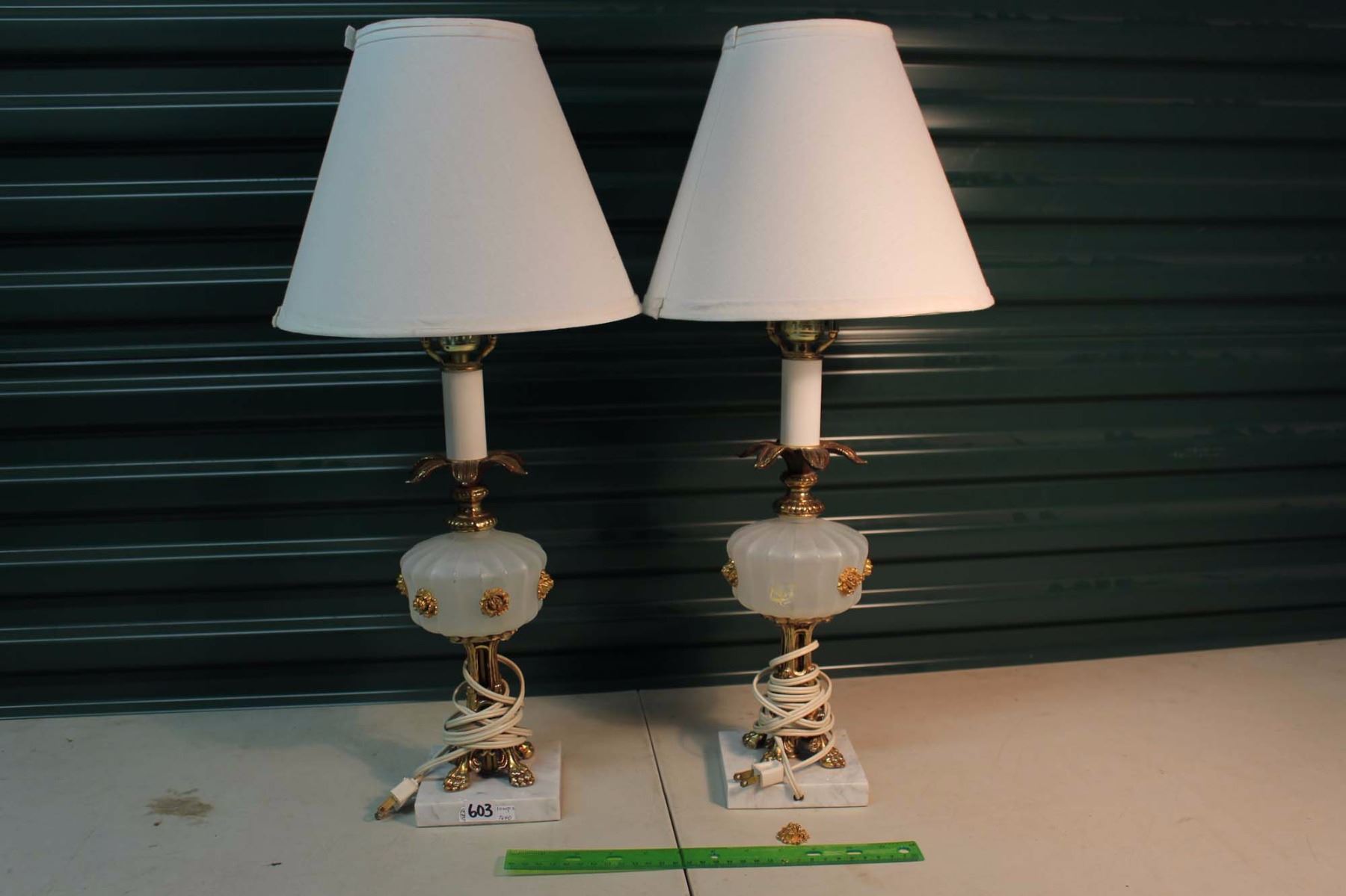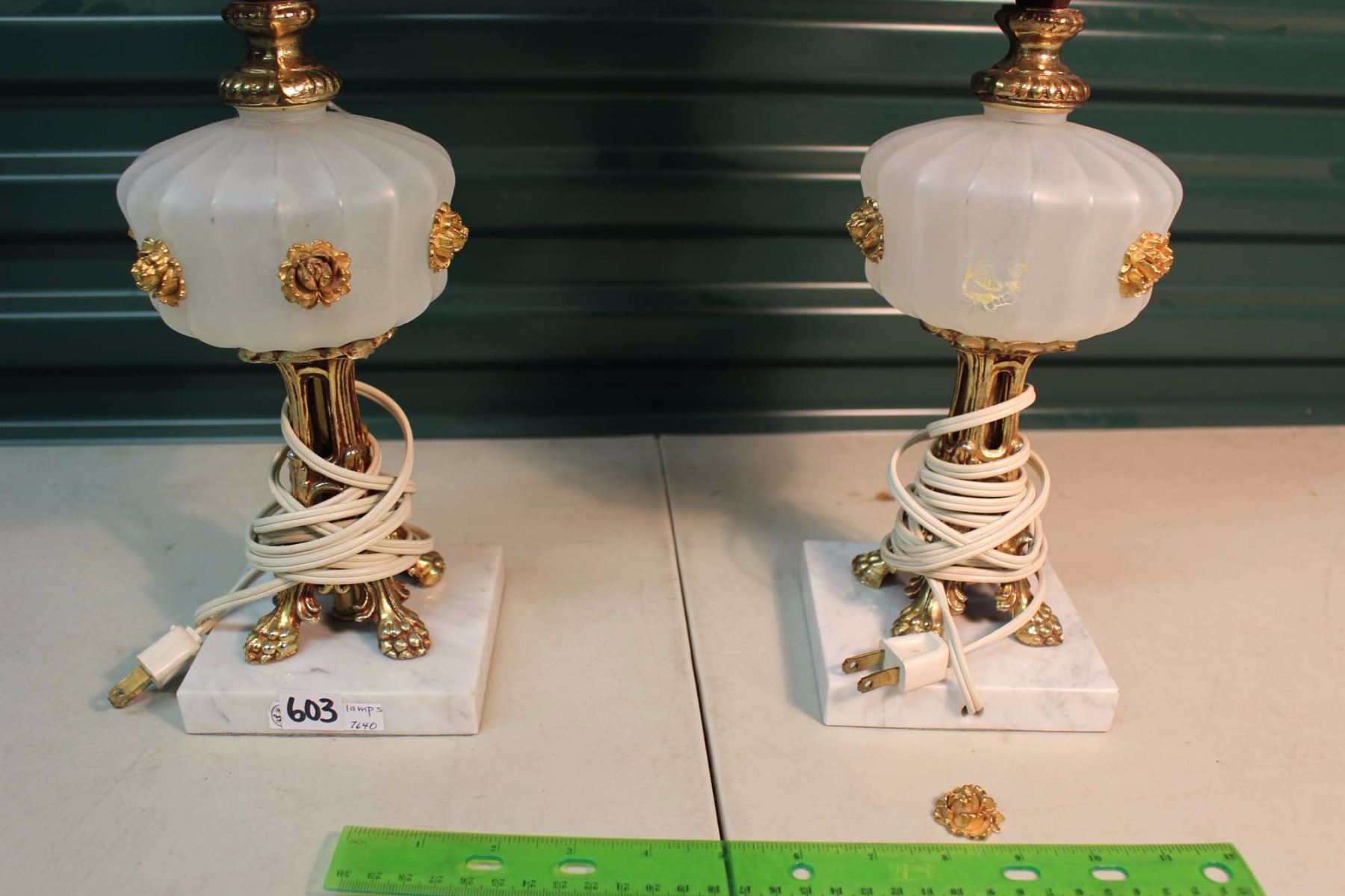 Pair of Marble Based & Brass Lamps W/Shades (Broken Off Flower, Easy Fix)
