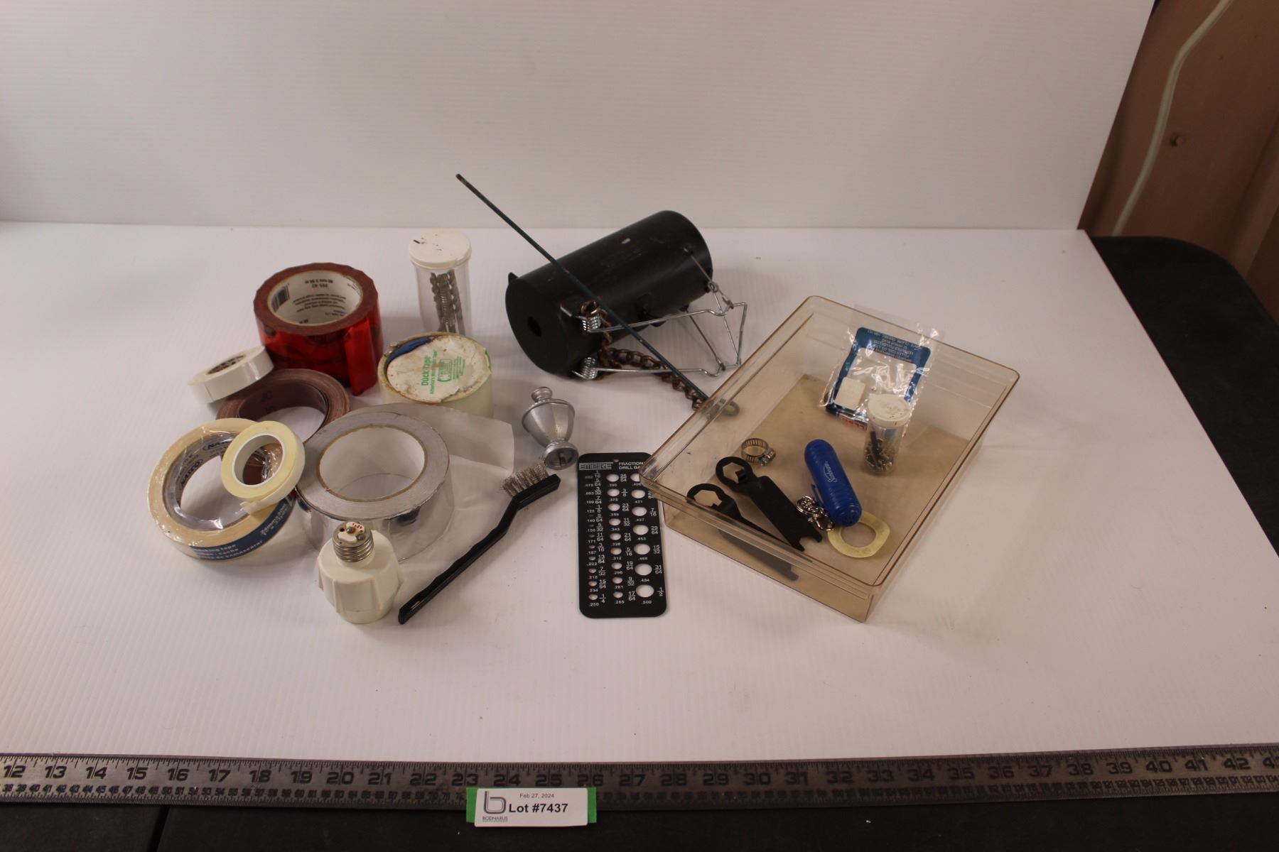 Part Rolls of Tape (Tuck Tape, Duck Tape, Tin Tape, Masking Tape), Emery Cloth, Mole Trap, Drill Gauge, Masonry Drill Bits & Various