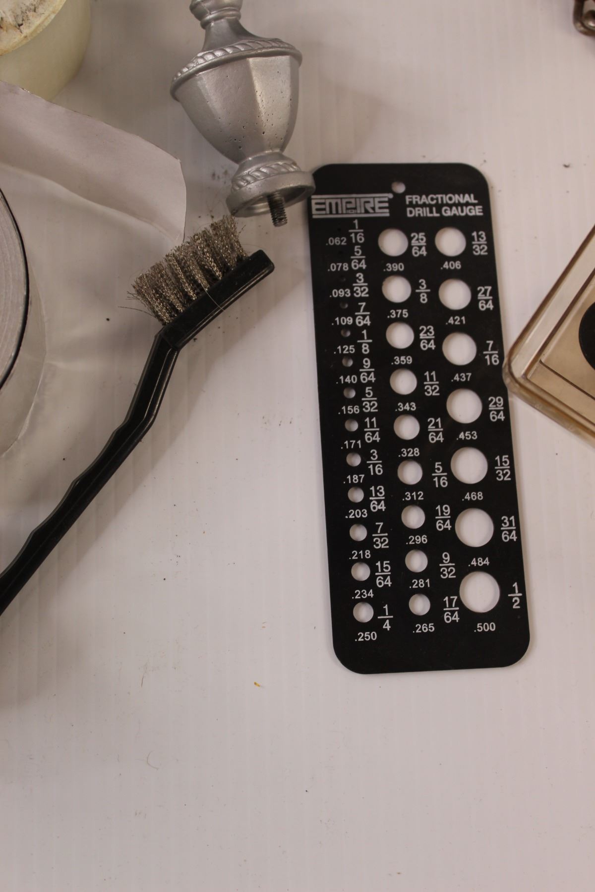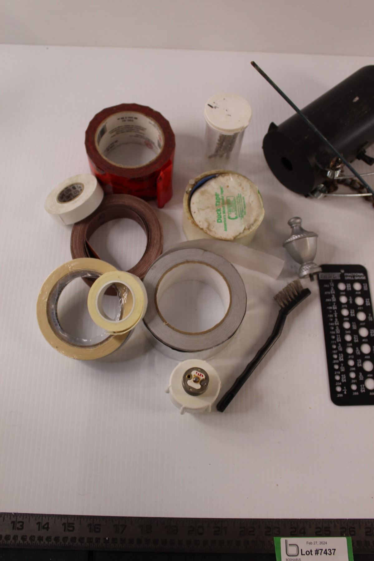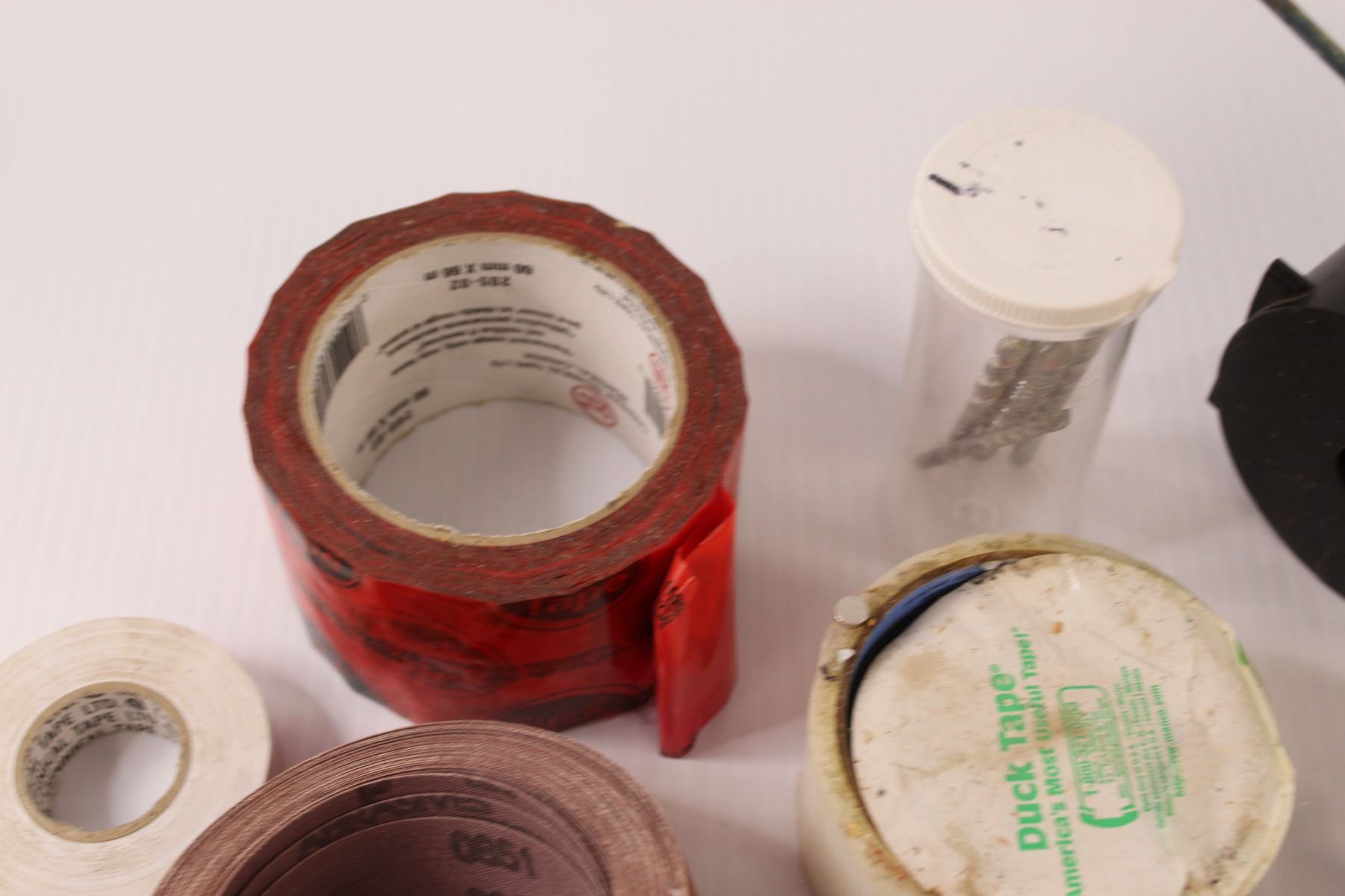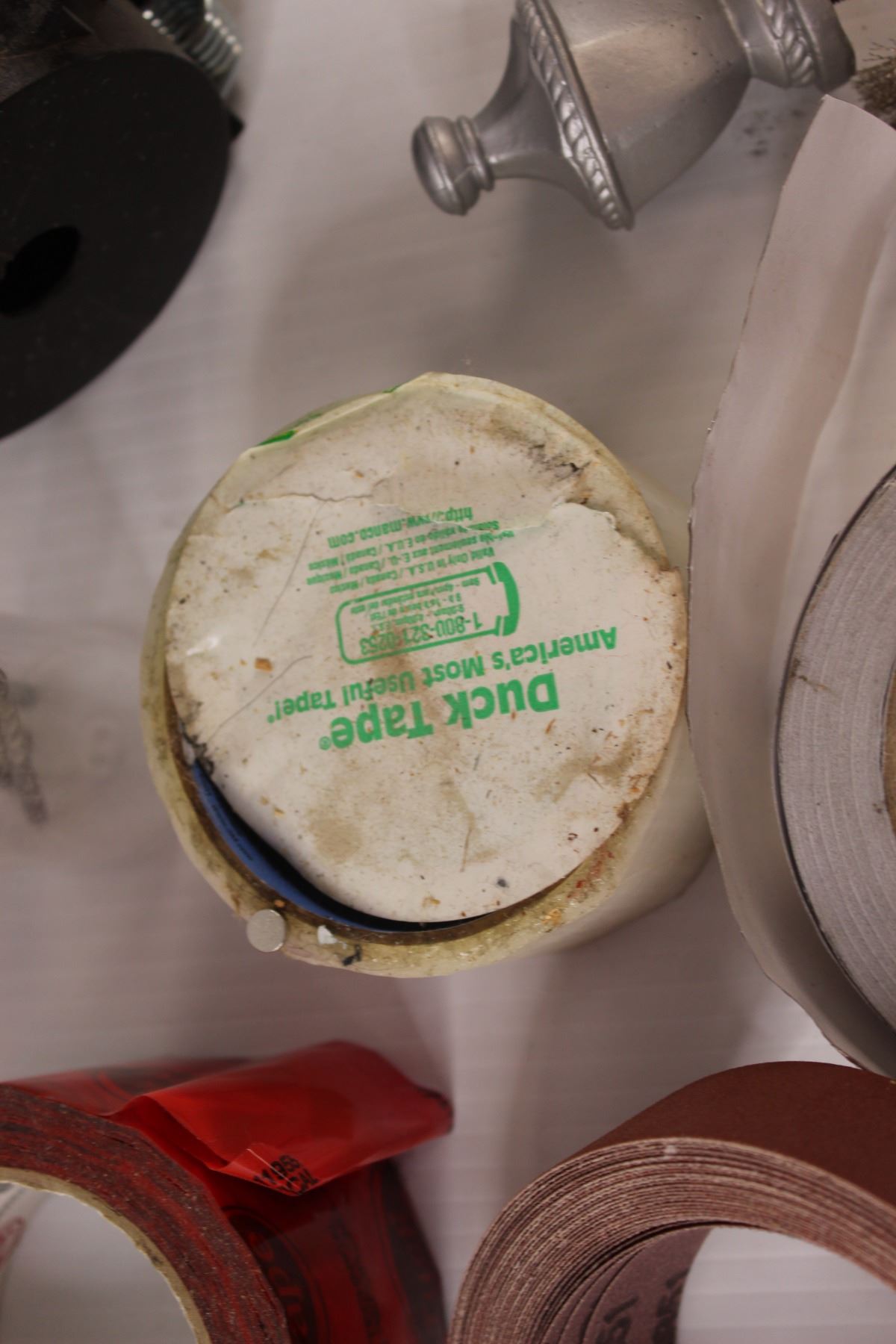 Part Rolls of Tape (Tuck Tape, Duck Tape, Tin Tape, Masking Tape), Emery Cloth, Mole Trap, Drill Gau
