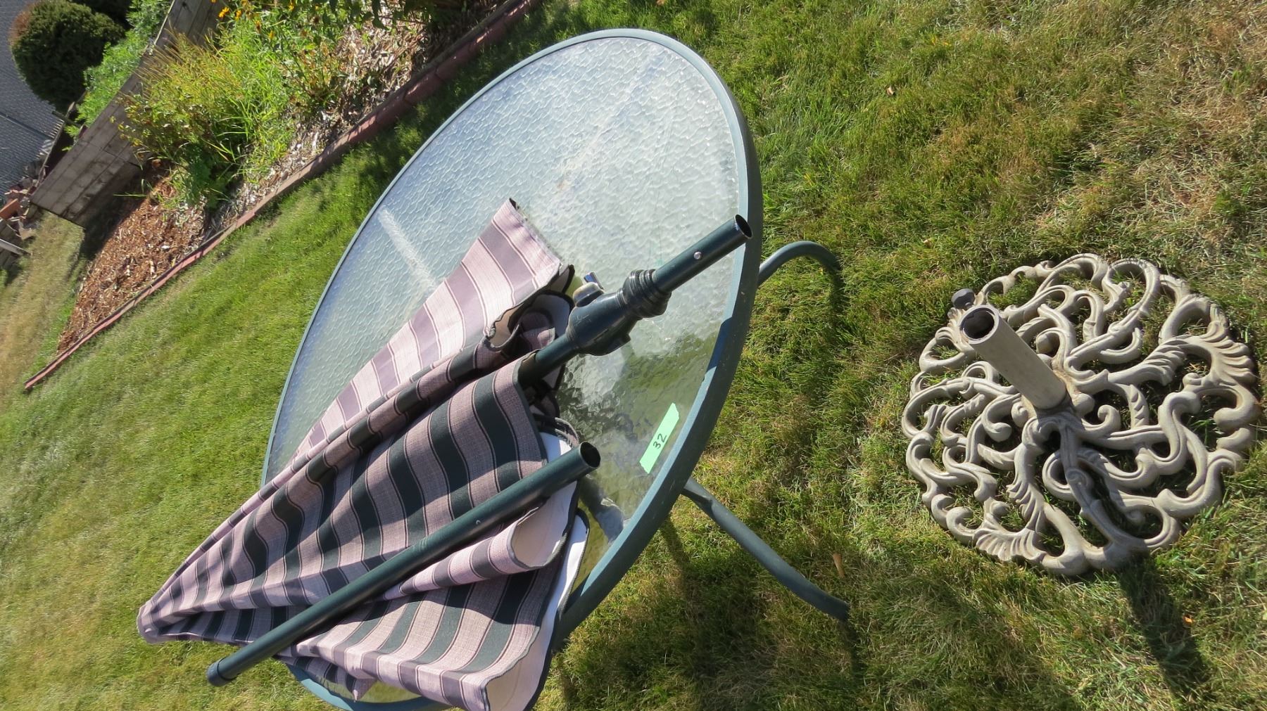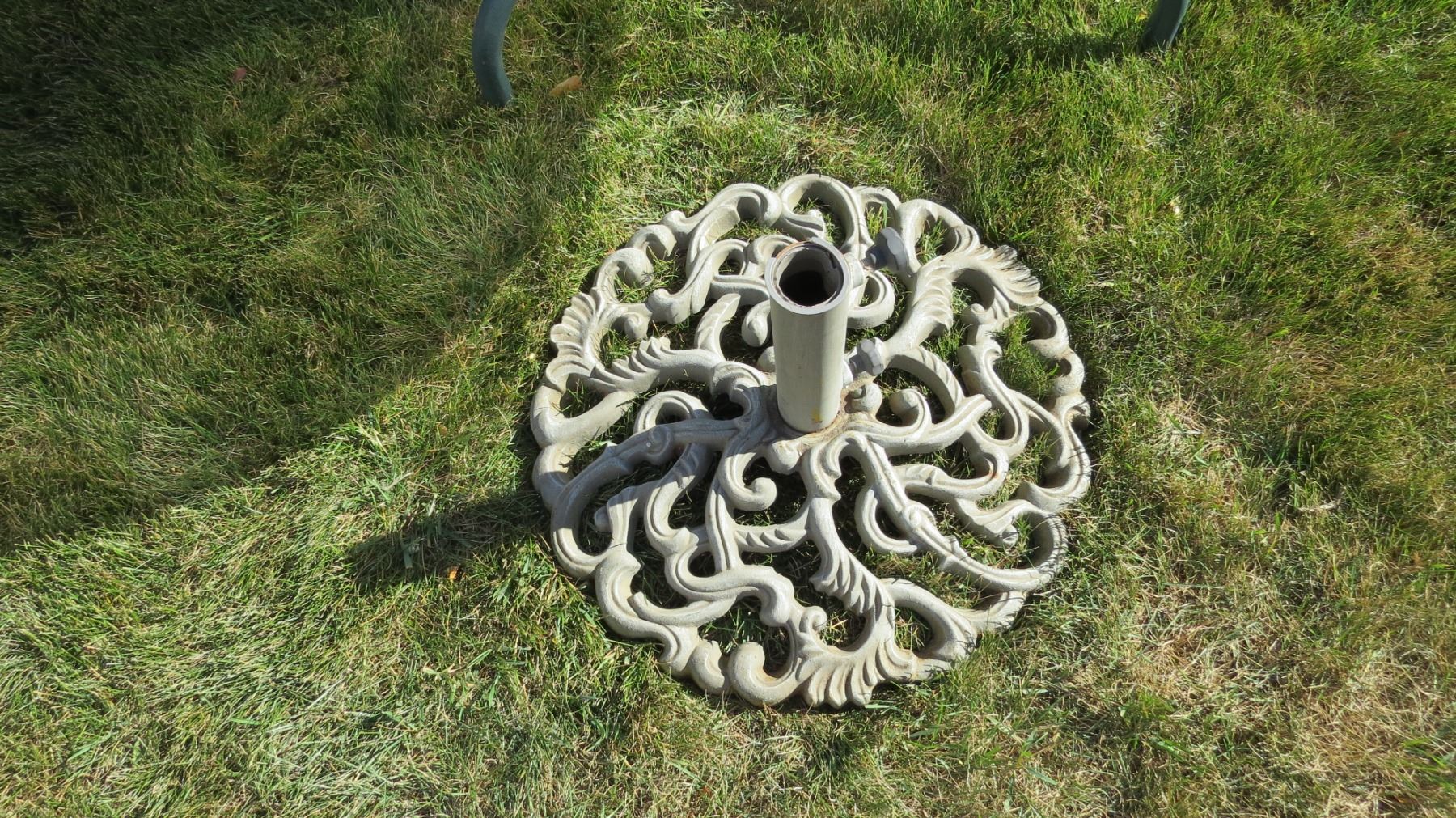 Patio table (48" round) + Umbrella with cast iron stand (22" round)