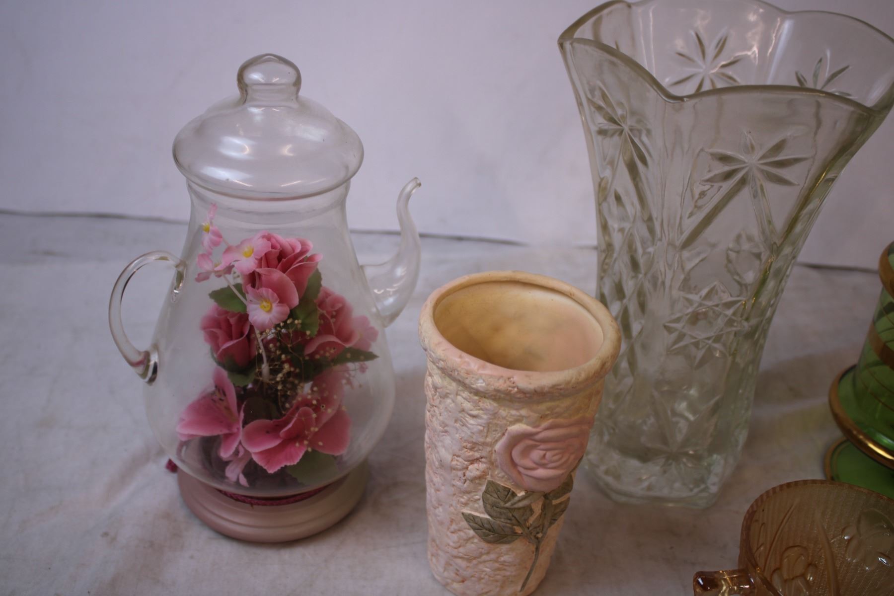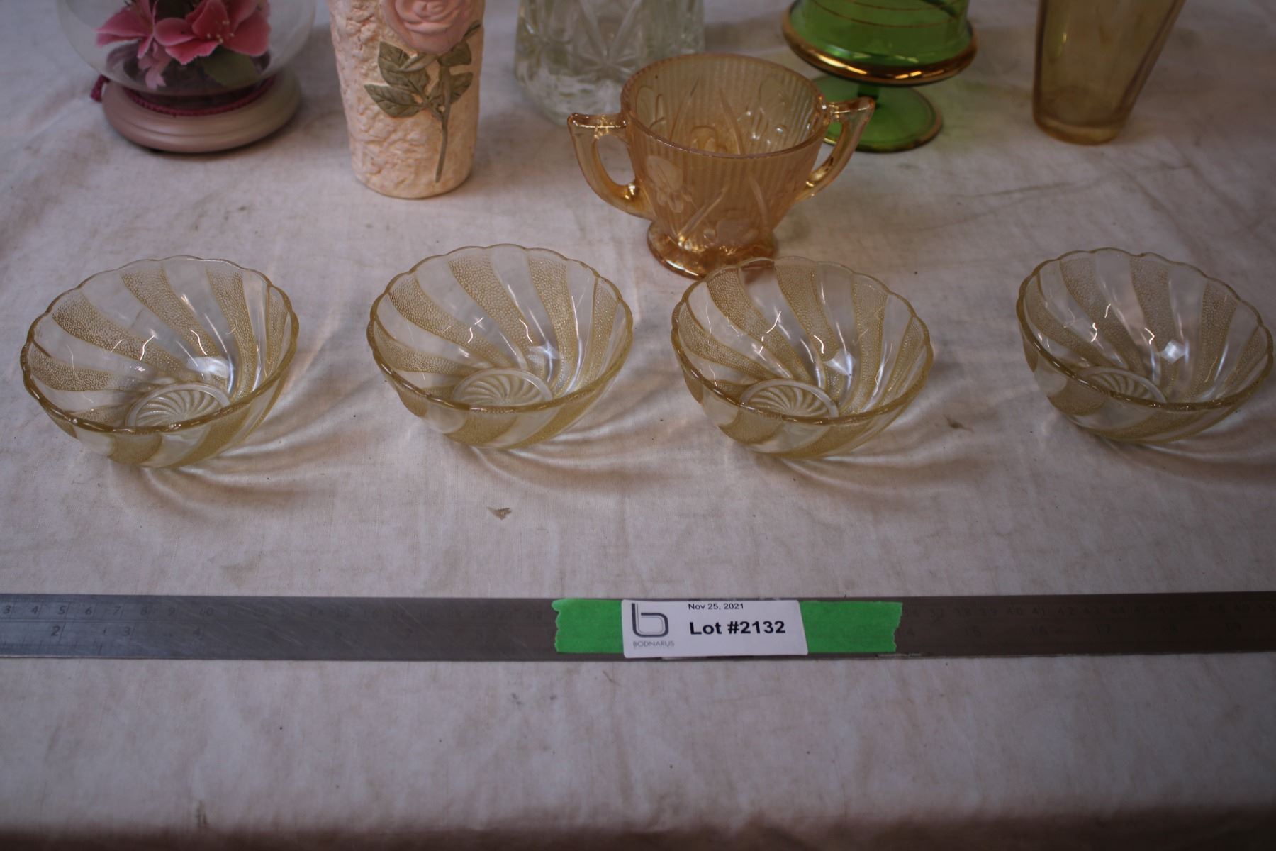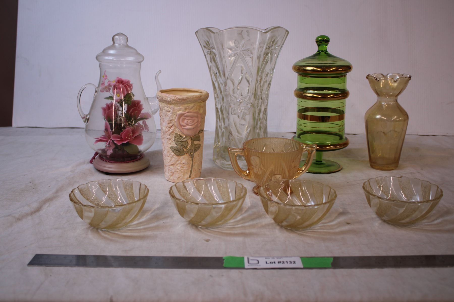 Peach Lustre colored glassware, green + gold tall candy dish?