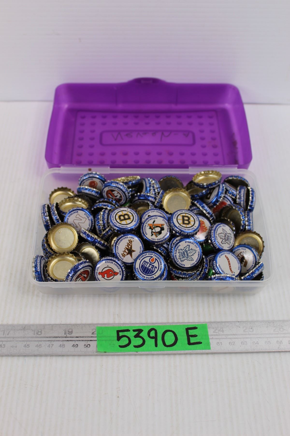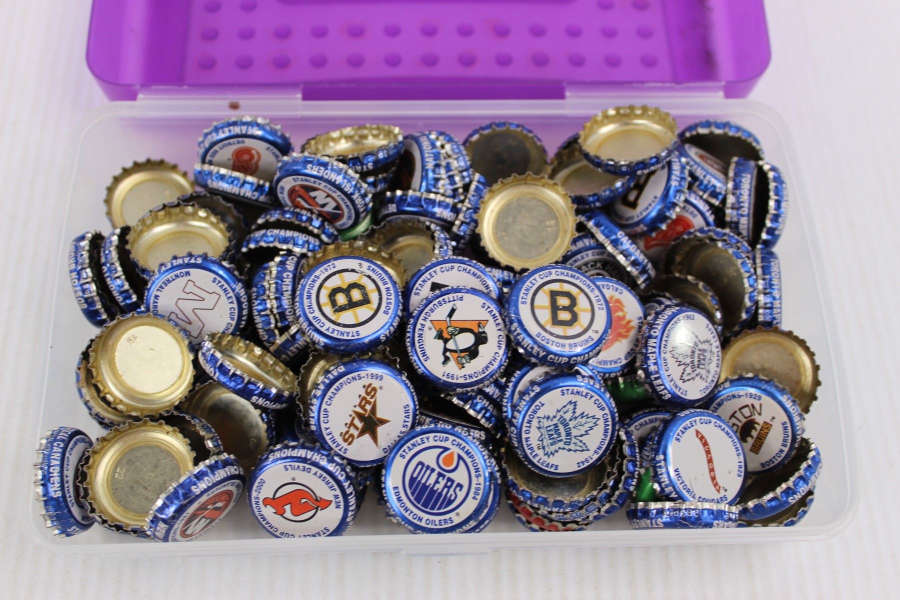 Pencil Case Full Of NHL Stanley Cup Champion Bottle Caps, Montreal Canadians, Boston Bruins, New Jersey Devils, Misc.
