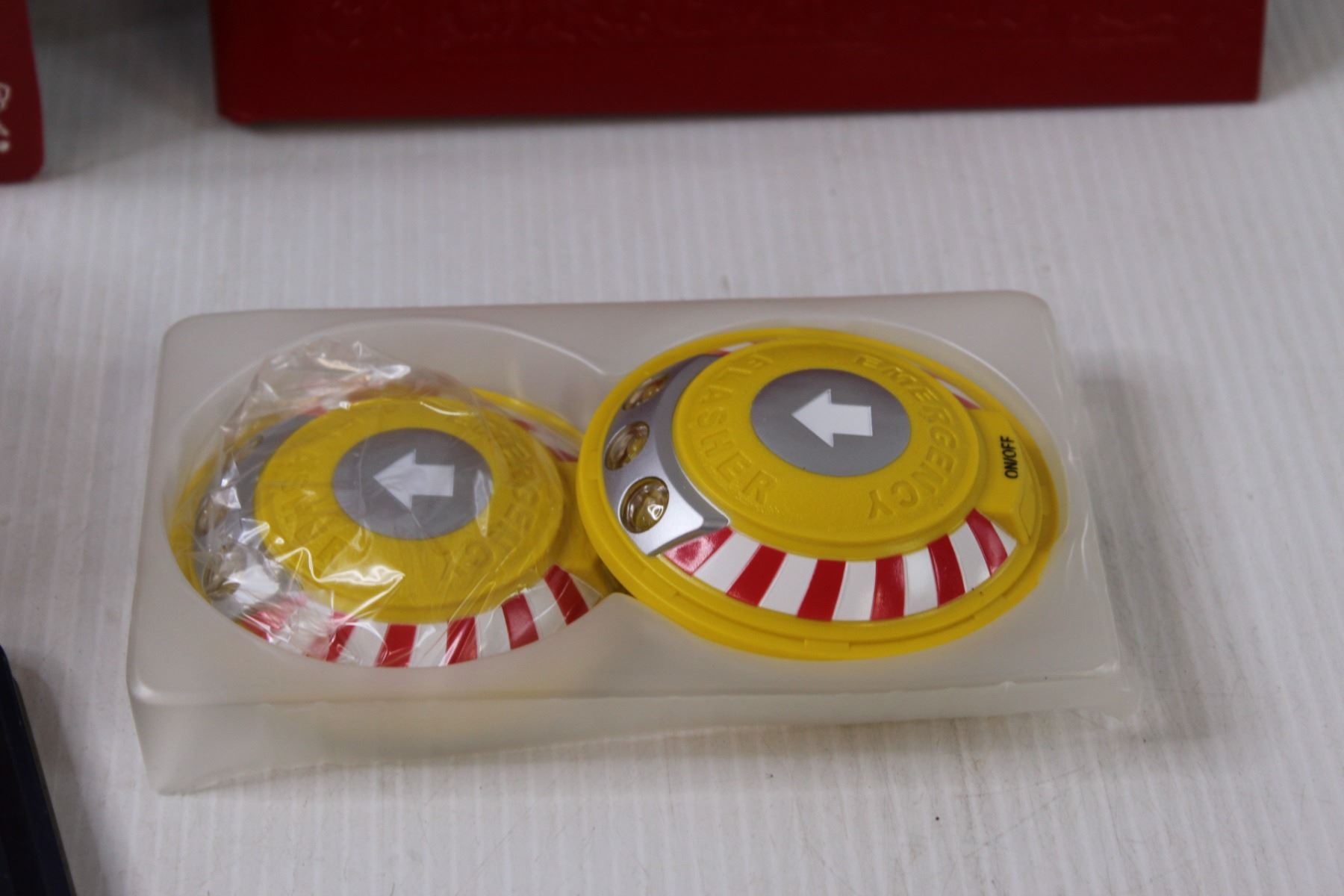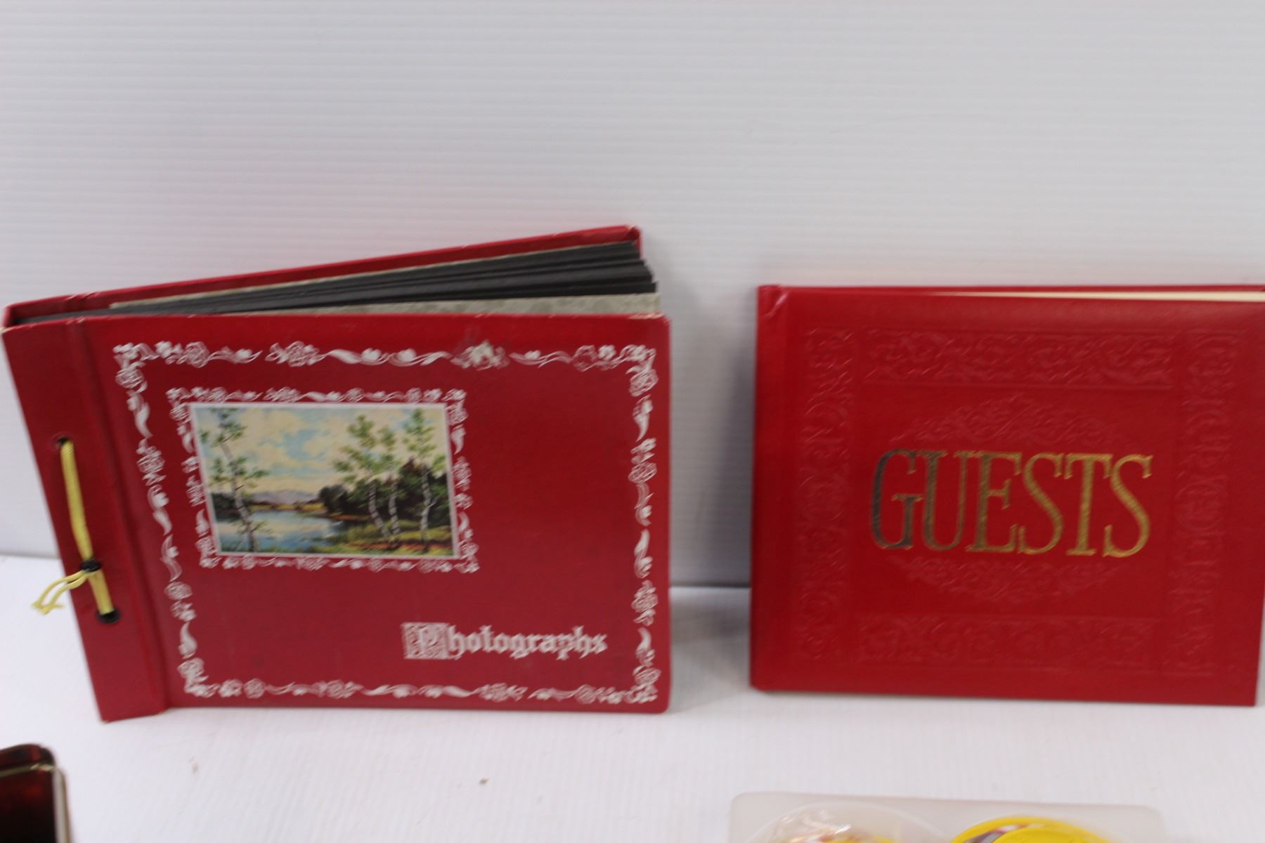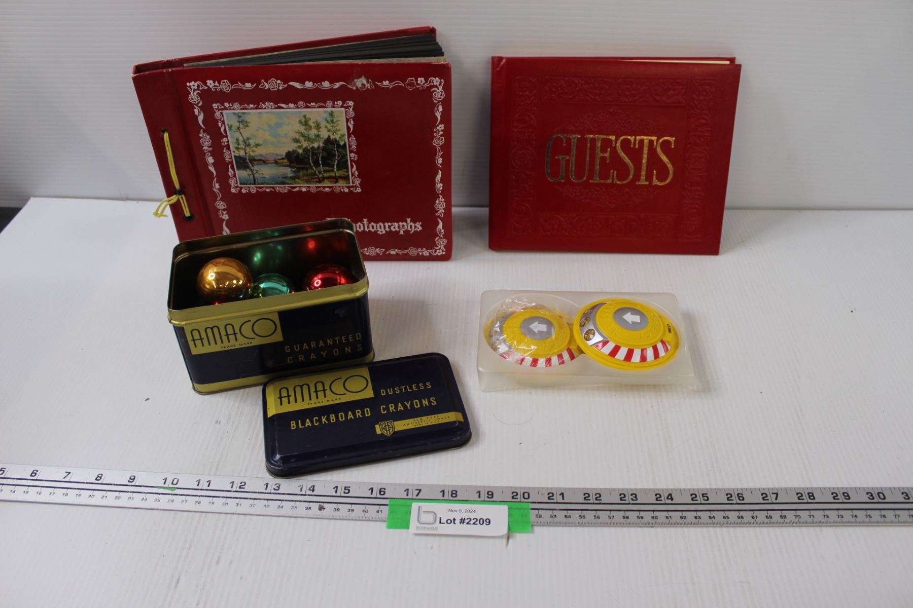 Photo Album, Guest Book, Amaco Blackboard Tin w/Ornaments, (2) Emergency Flashers