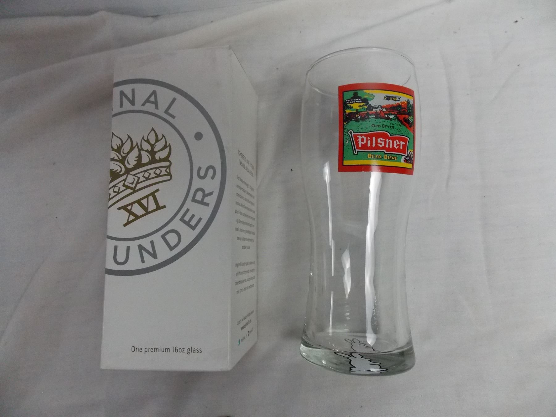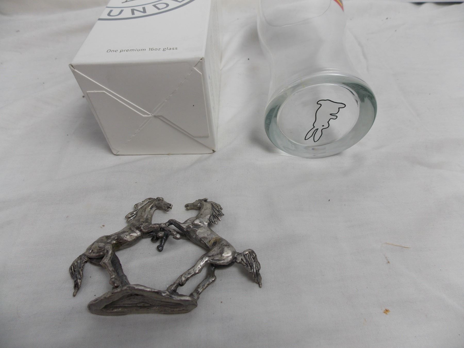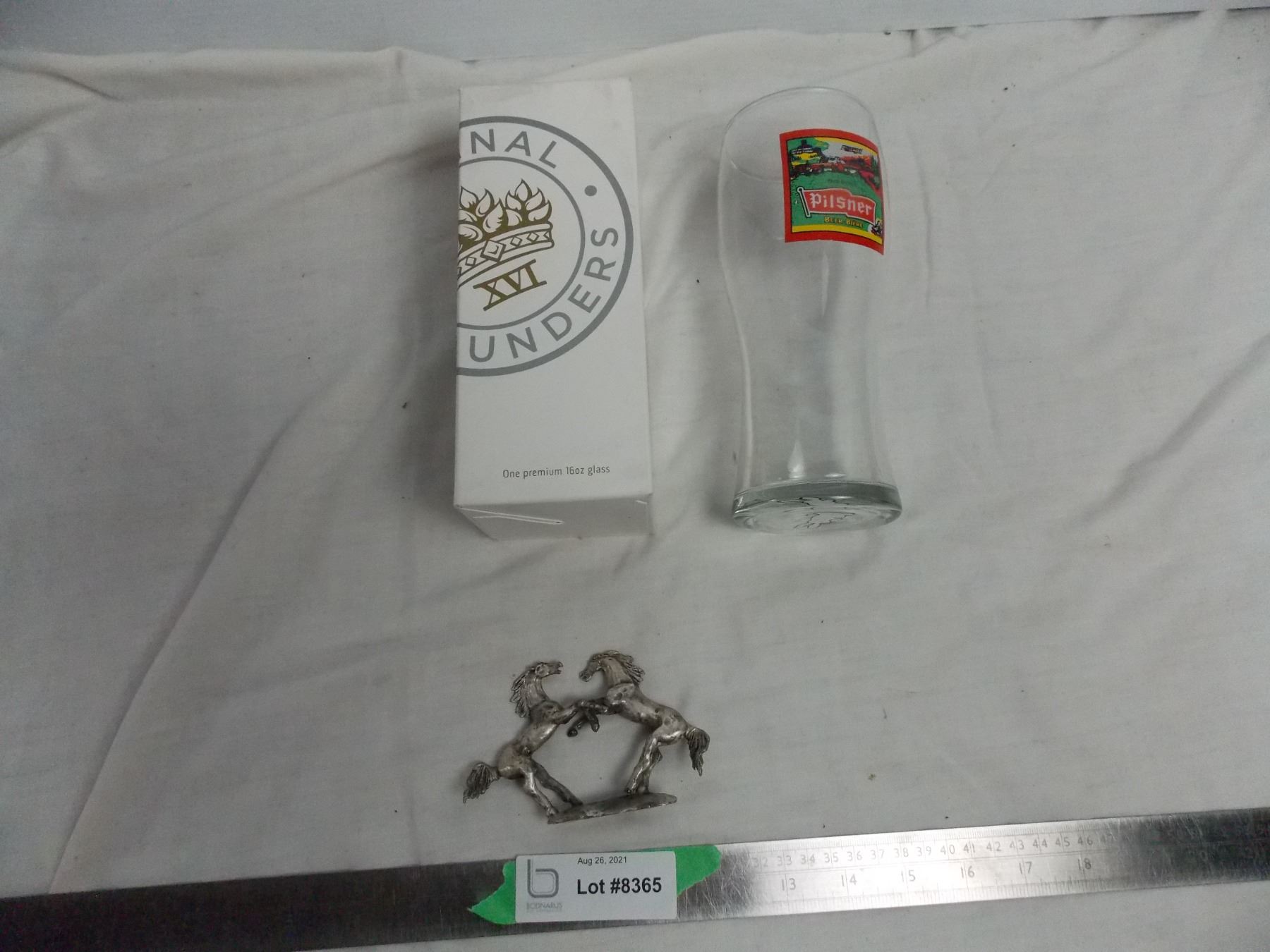 Pilsner + O-16 pint glasses + small pewter horse statue