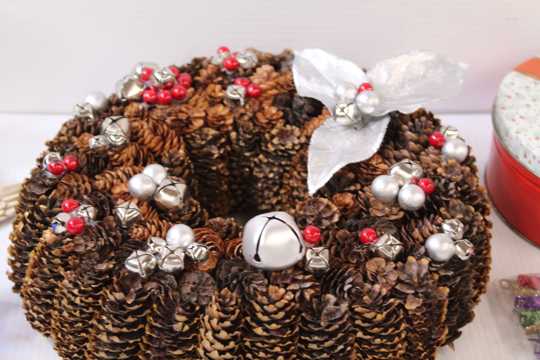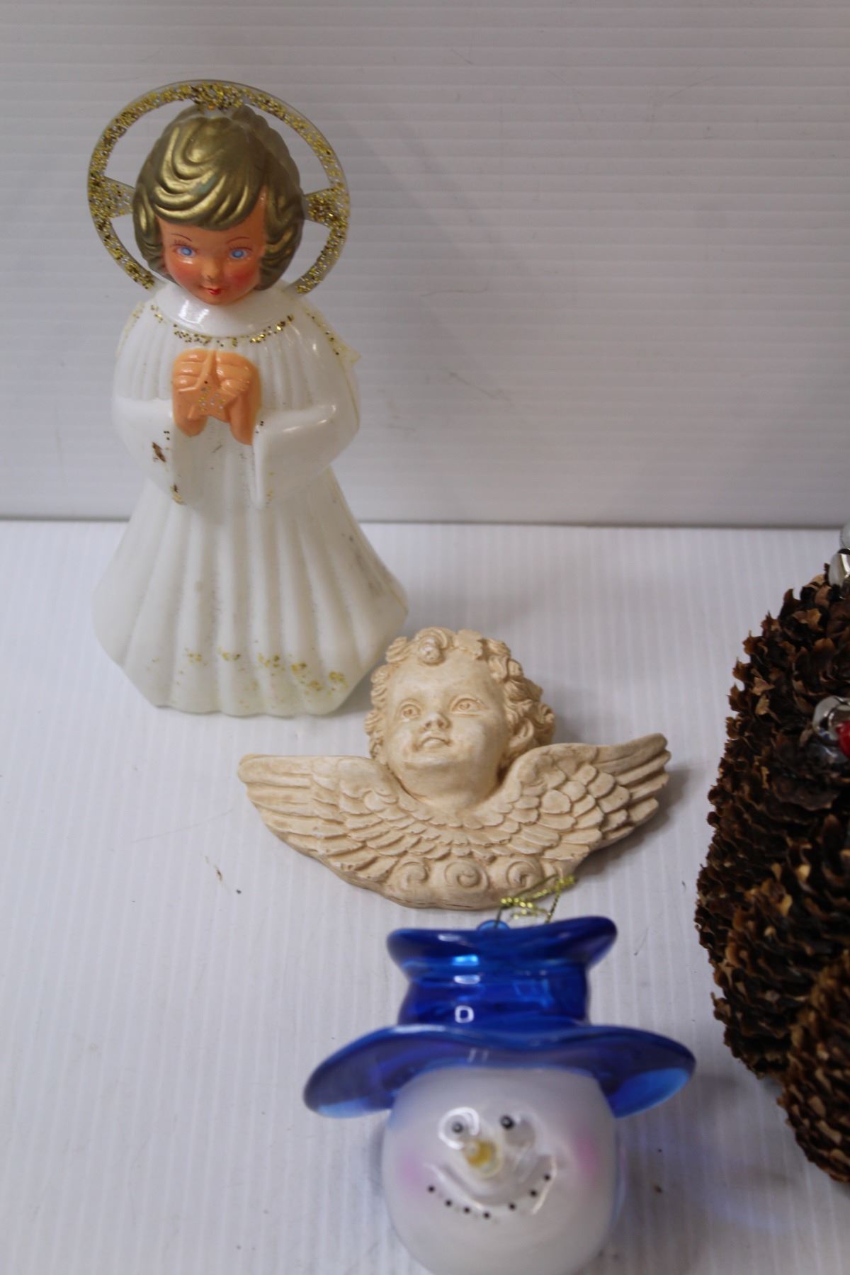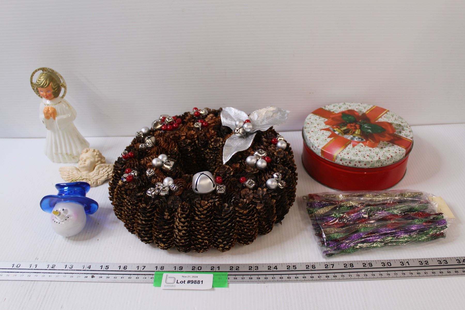 Pinecone Center Piece, Vintage Angel, Snowman Ornament, Spiral Ornaments, Christmas Tin, Misc.