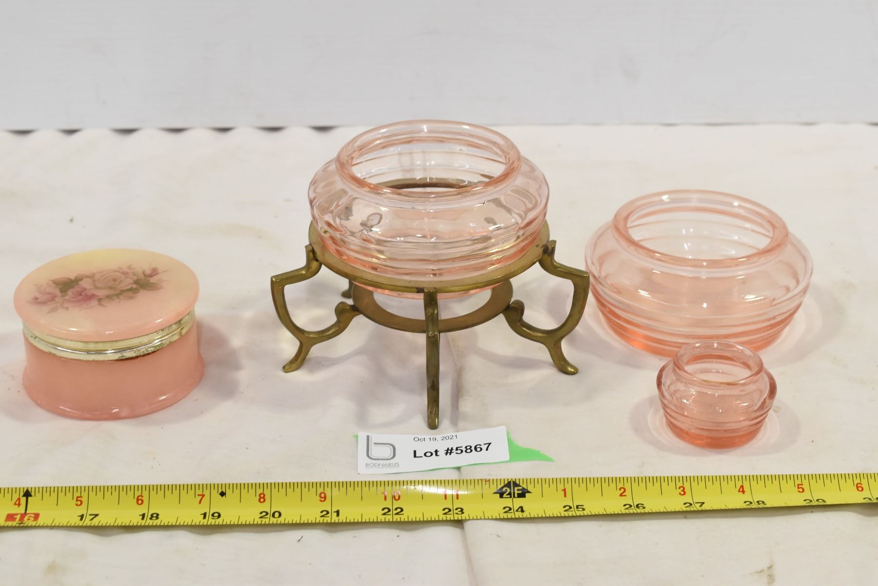 Pink Coloured Glass Trinket Jars, Brass Stand