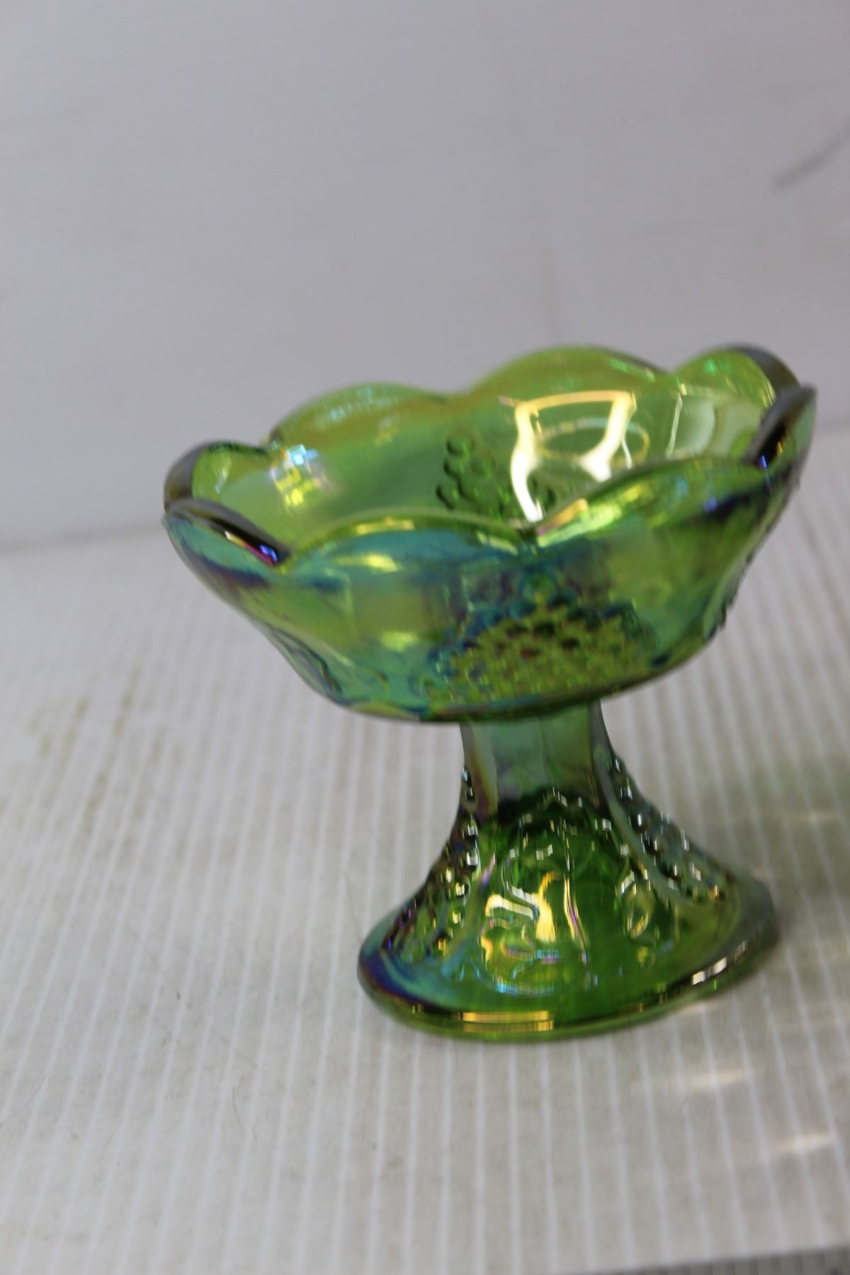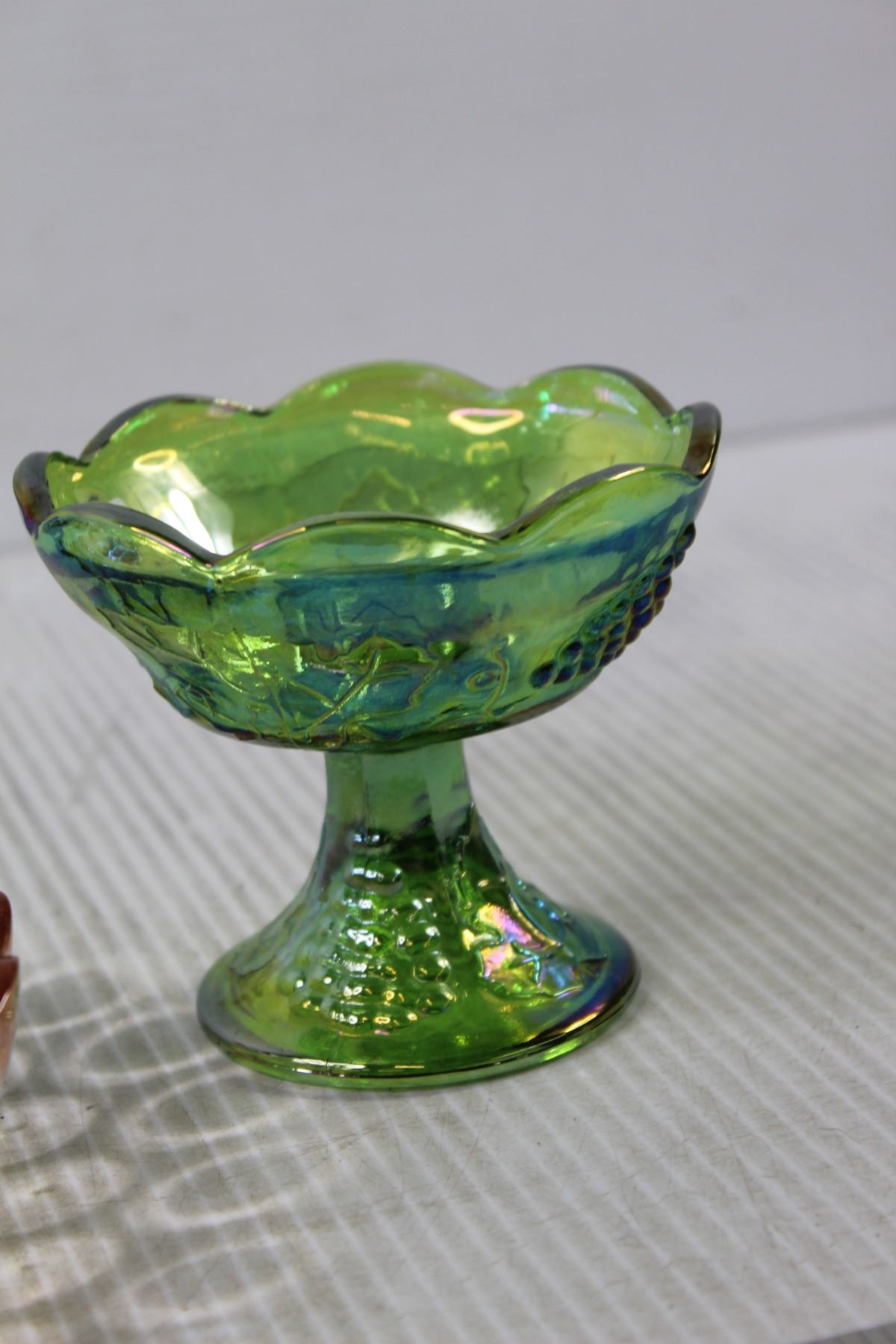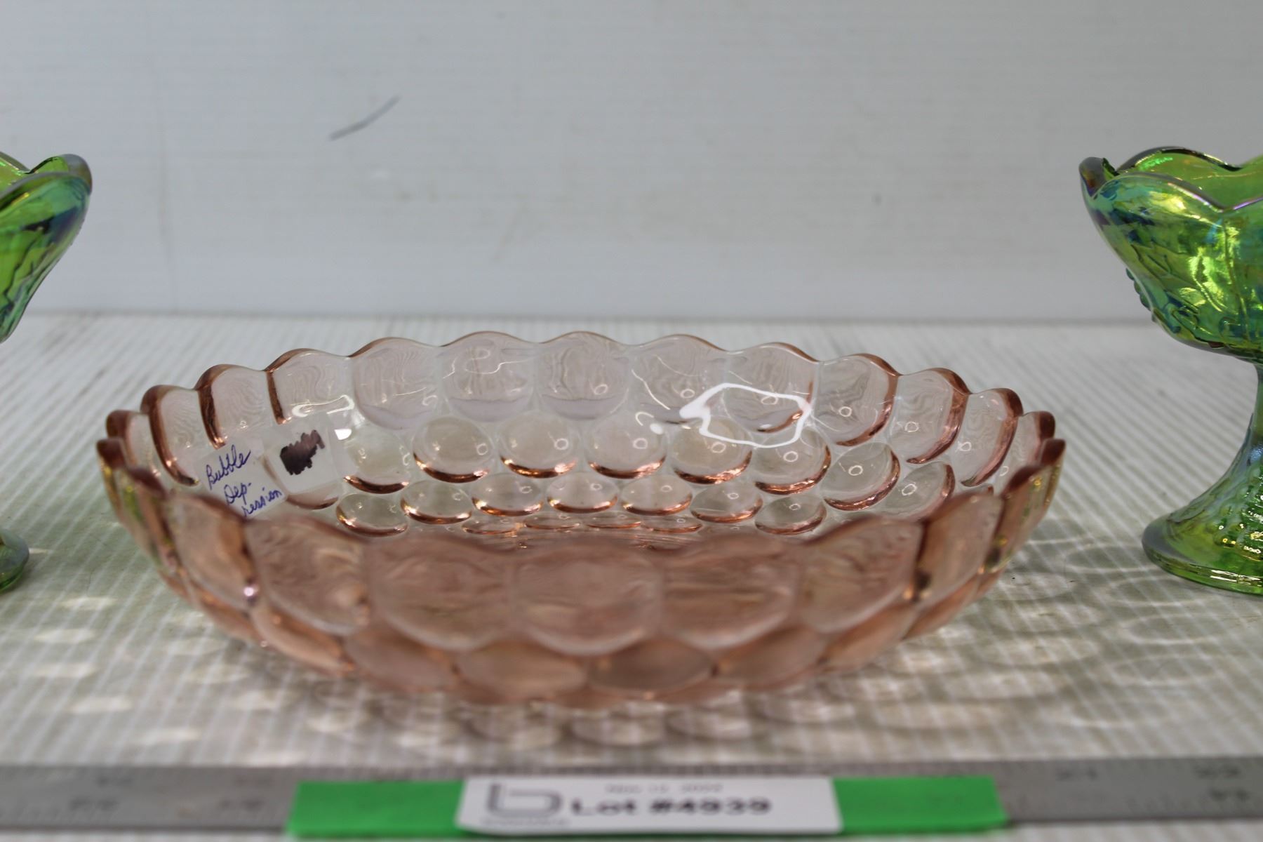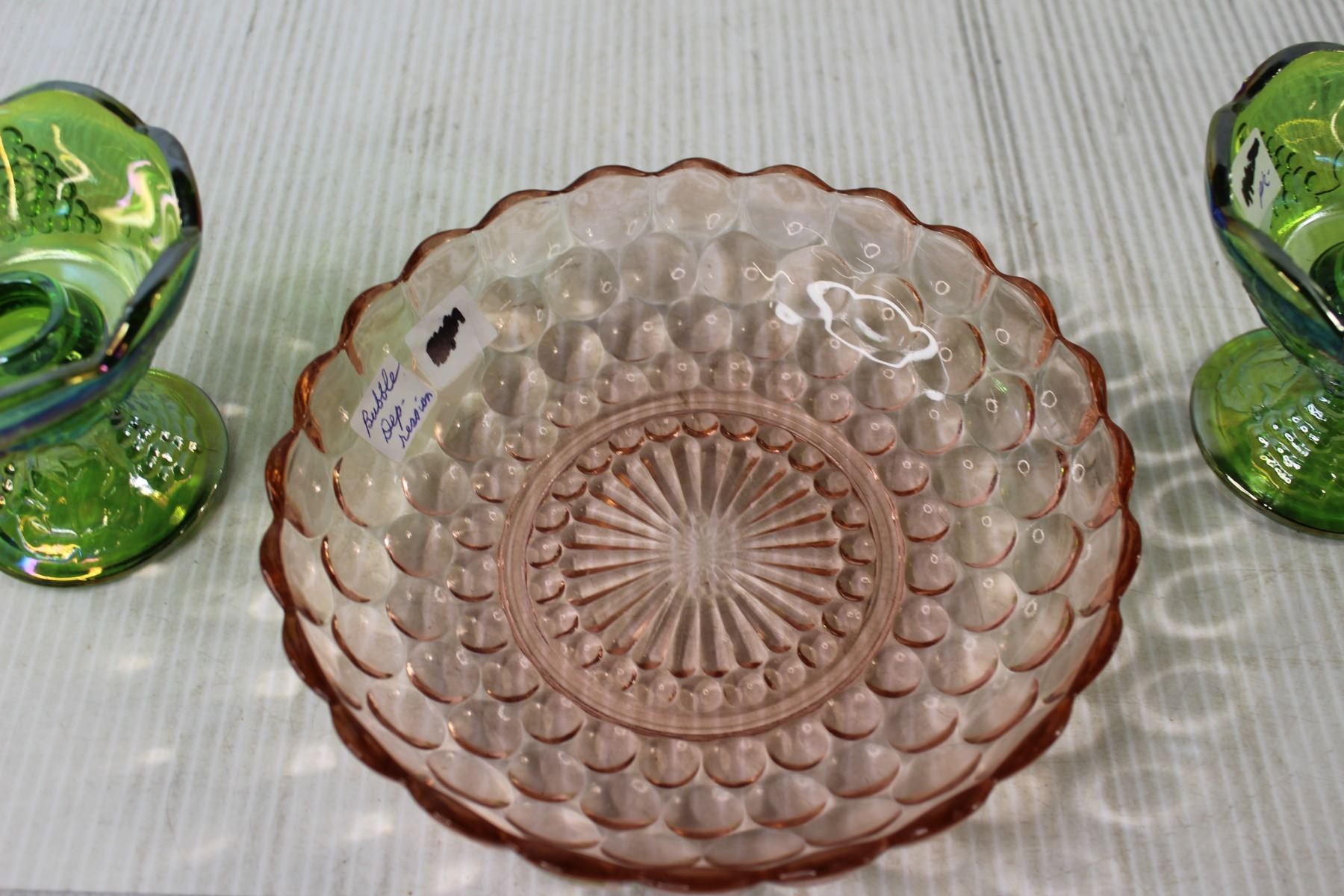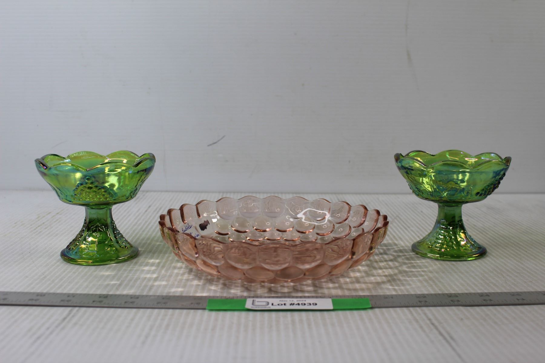 Pink Depression Glass Bowl, (2) Green Carnival Glass Candle Holders