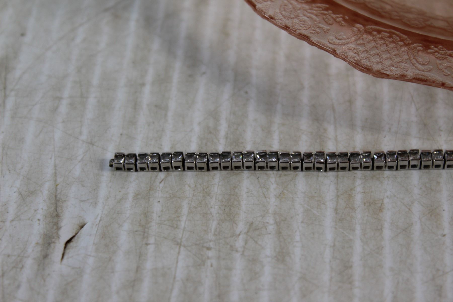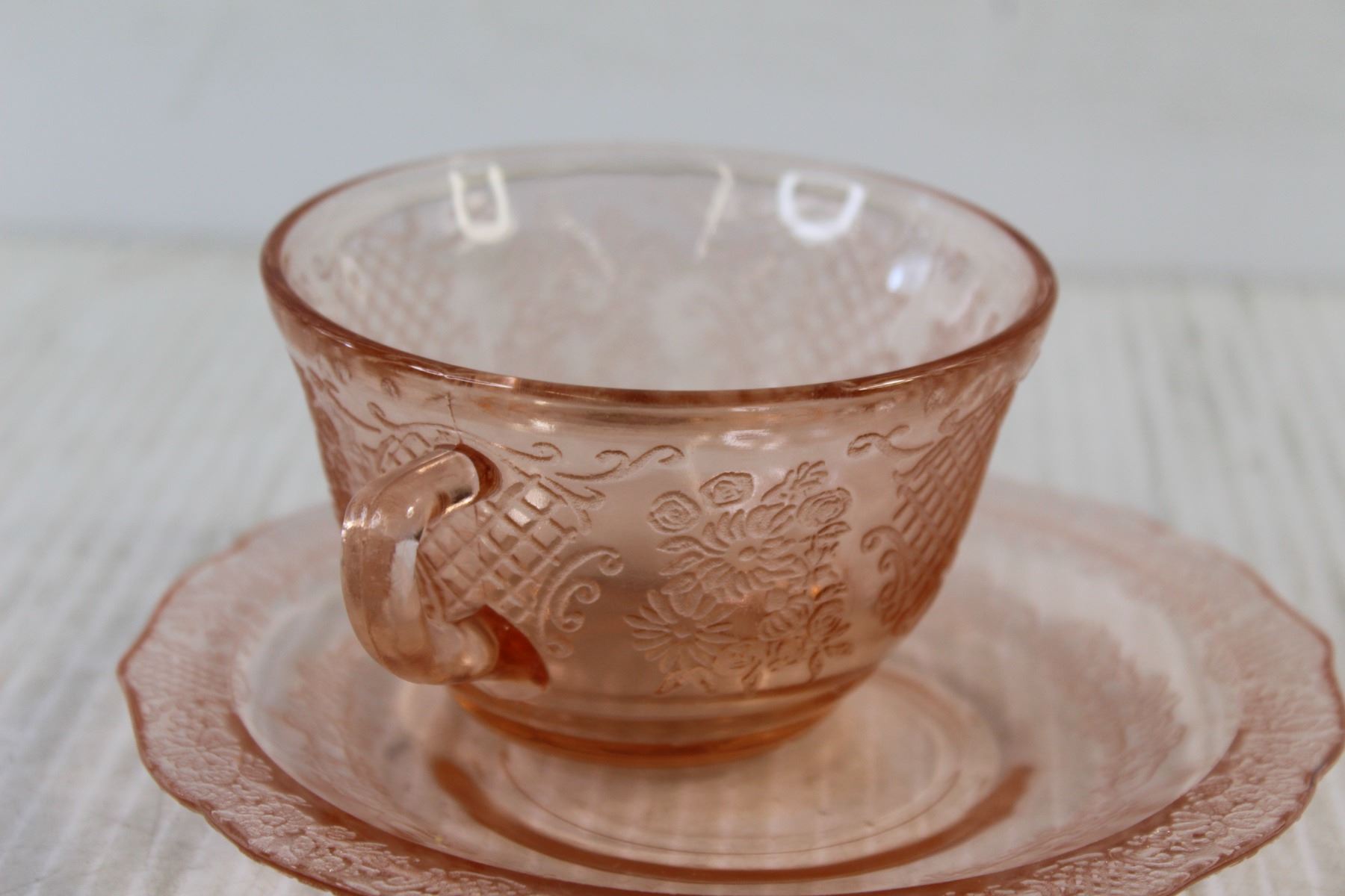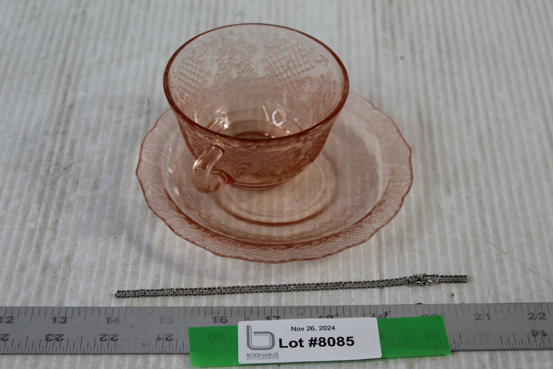 Pink Depression Glass Cup and Saucer, Costume Jewelry Chain