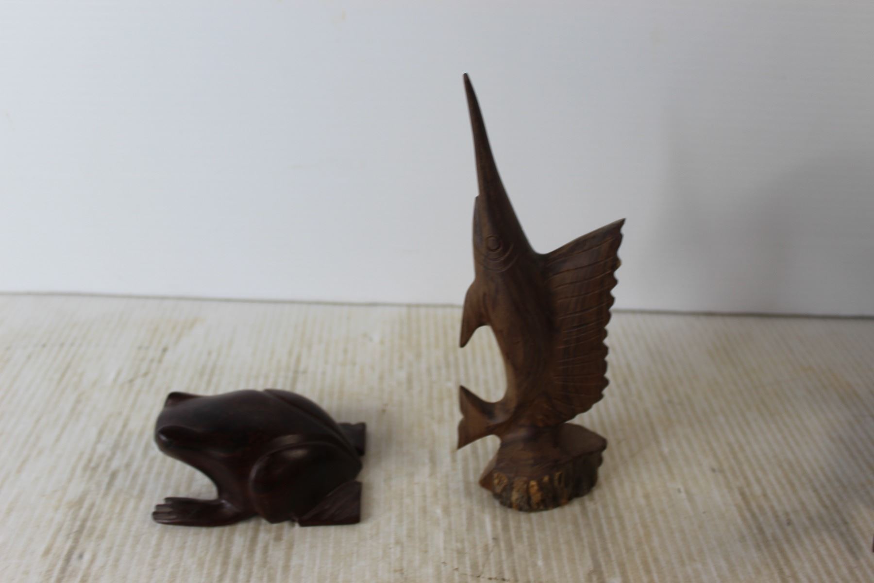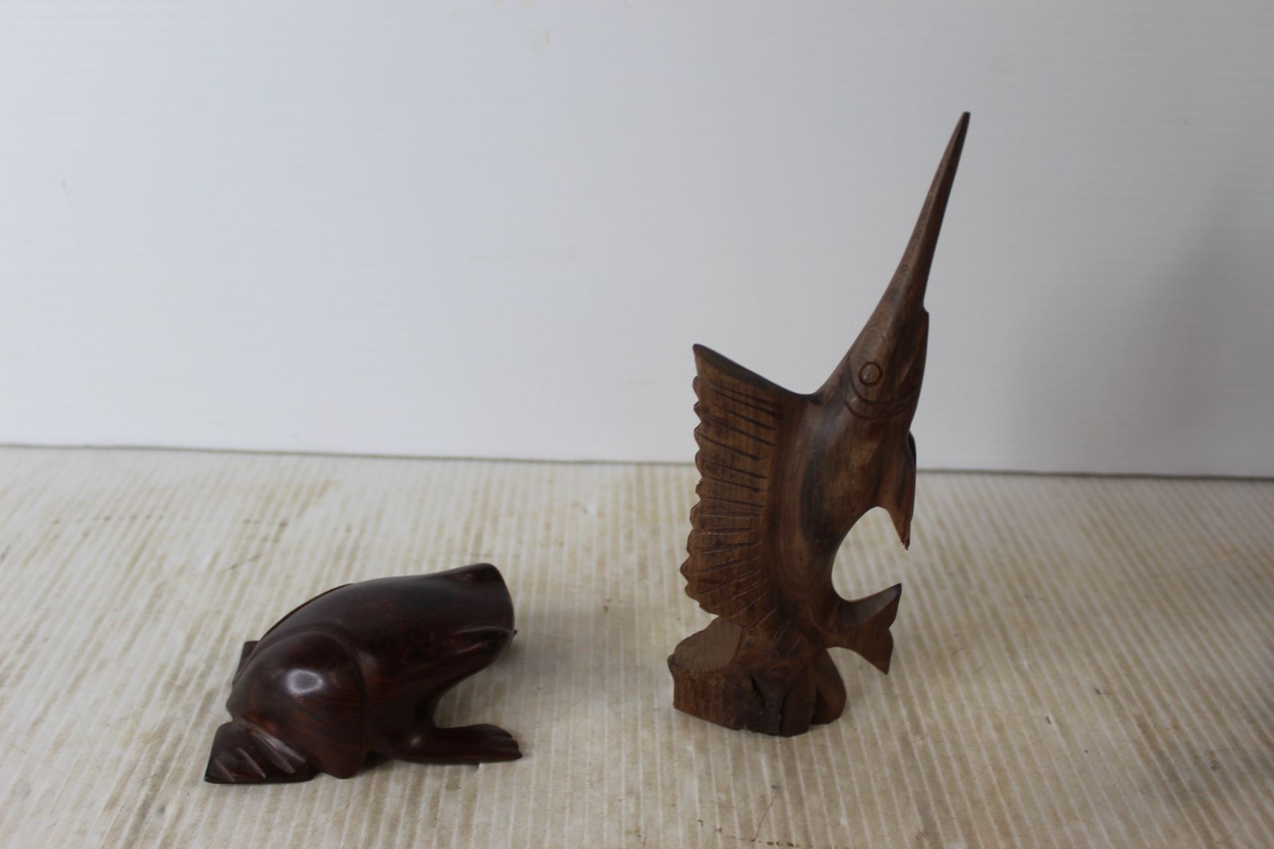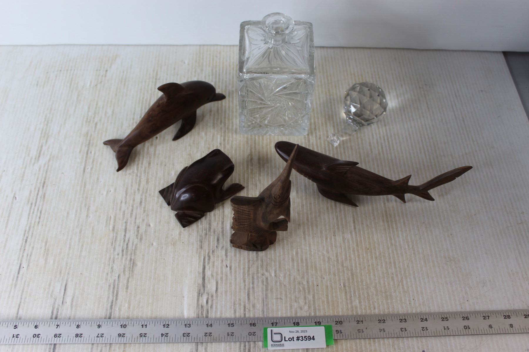 Pinwheel Crystal Decanter - Stopper is Broken, (3) Wood Fish Figures, (1) Wood Frog Figure