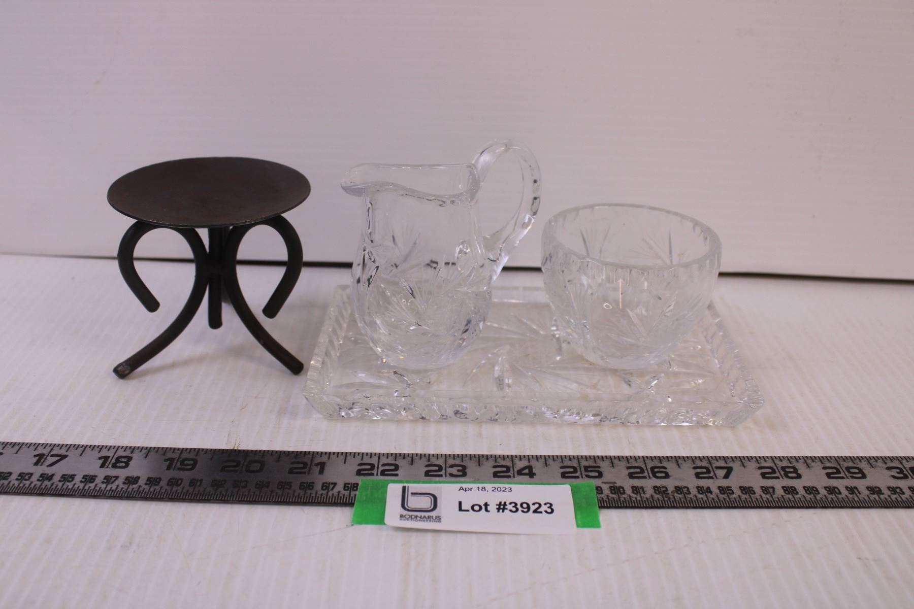 Pinwheel Crystal cream and sugar set, metal candle holder