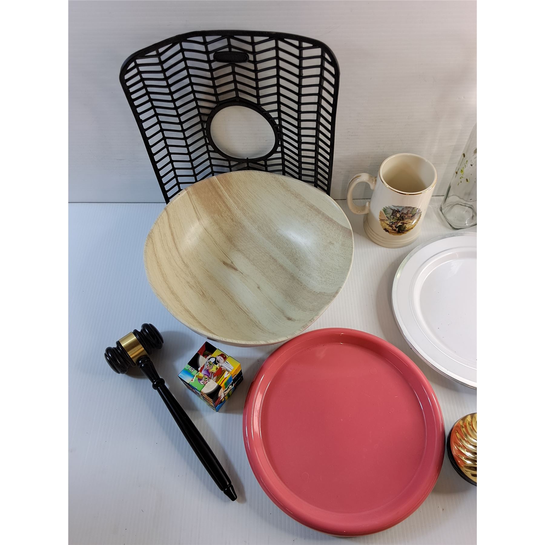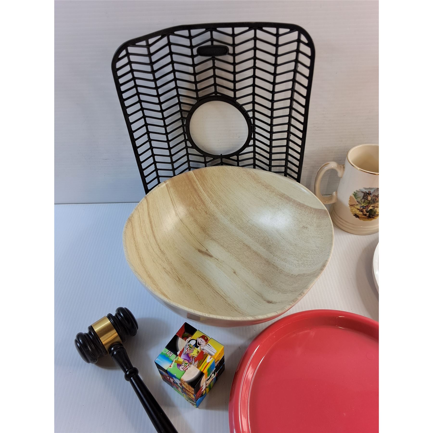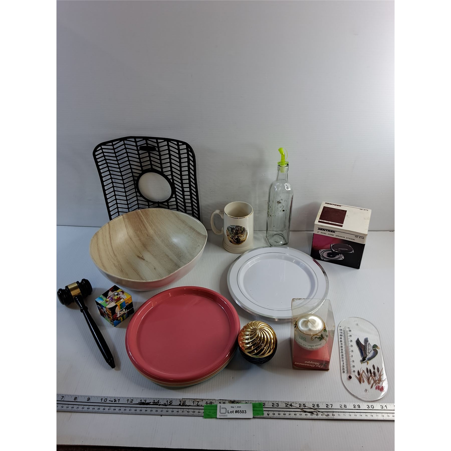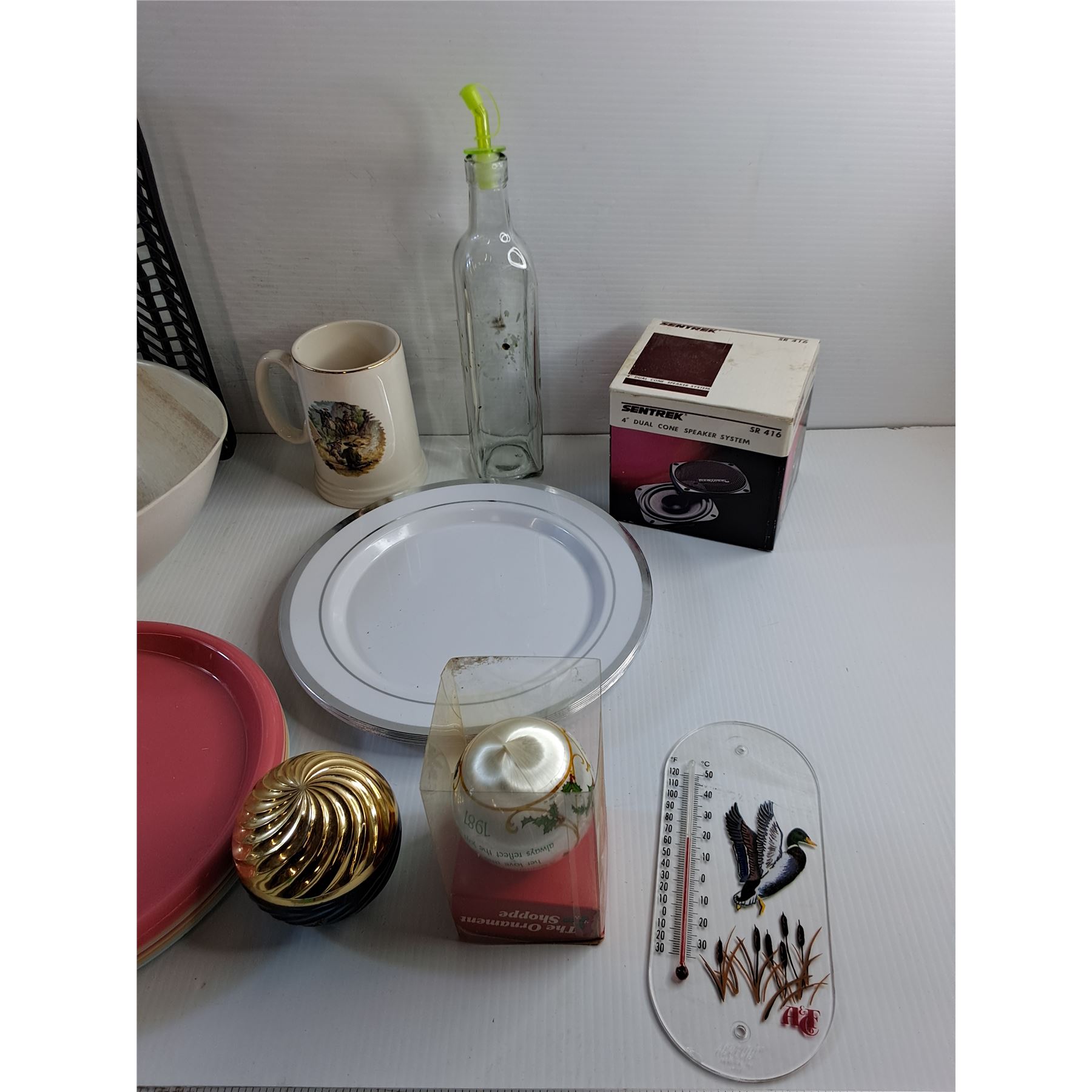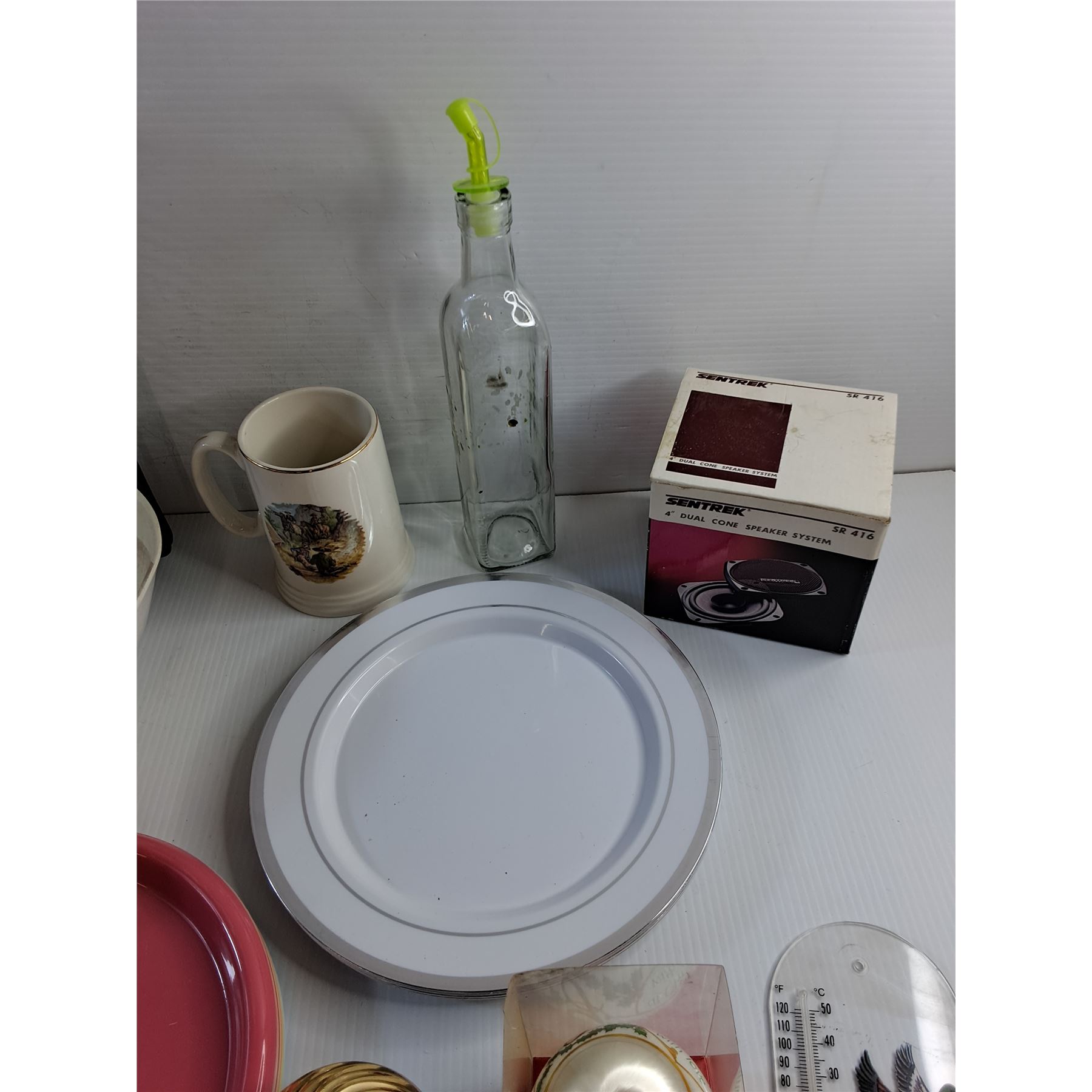 Plastic Bowl, Plates, Dual Cone Speaker System, Thermometer, Beerstein and Misc