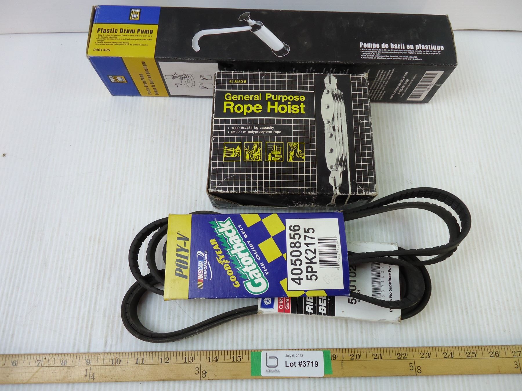 Plastic Drum Pump, Rope Hoist, and (2) Belts