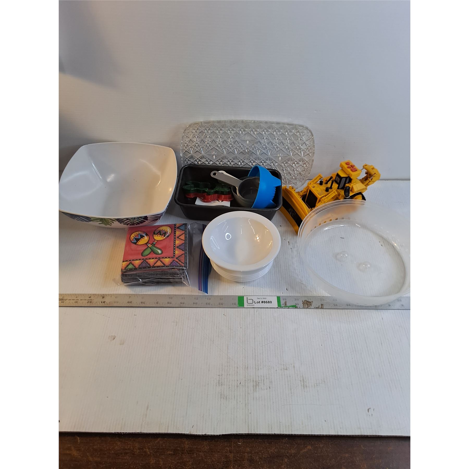 Plastic Salad Dish,Meatloaf Pan,Napkins,Toy Bulldozer and more as pictured