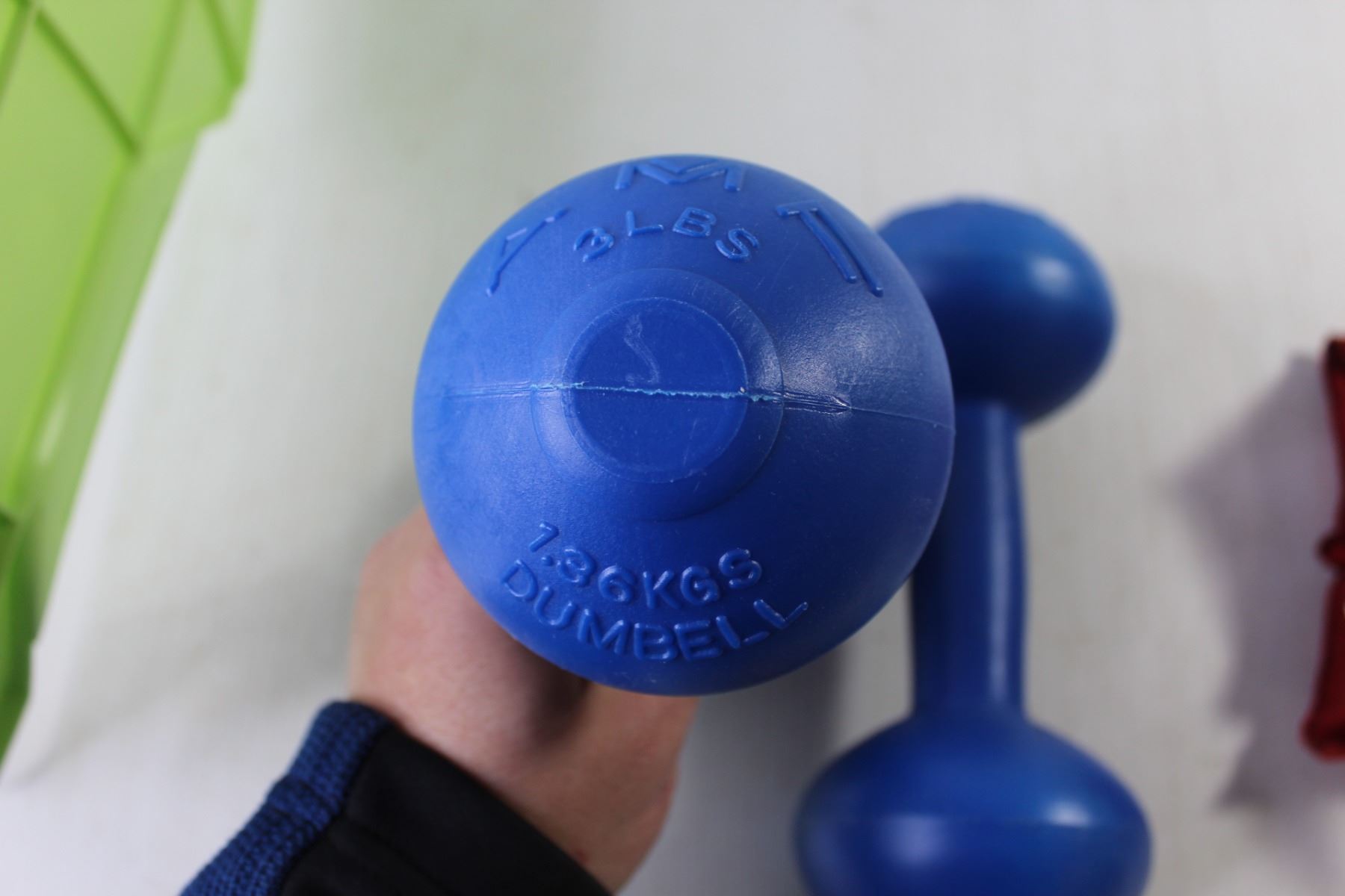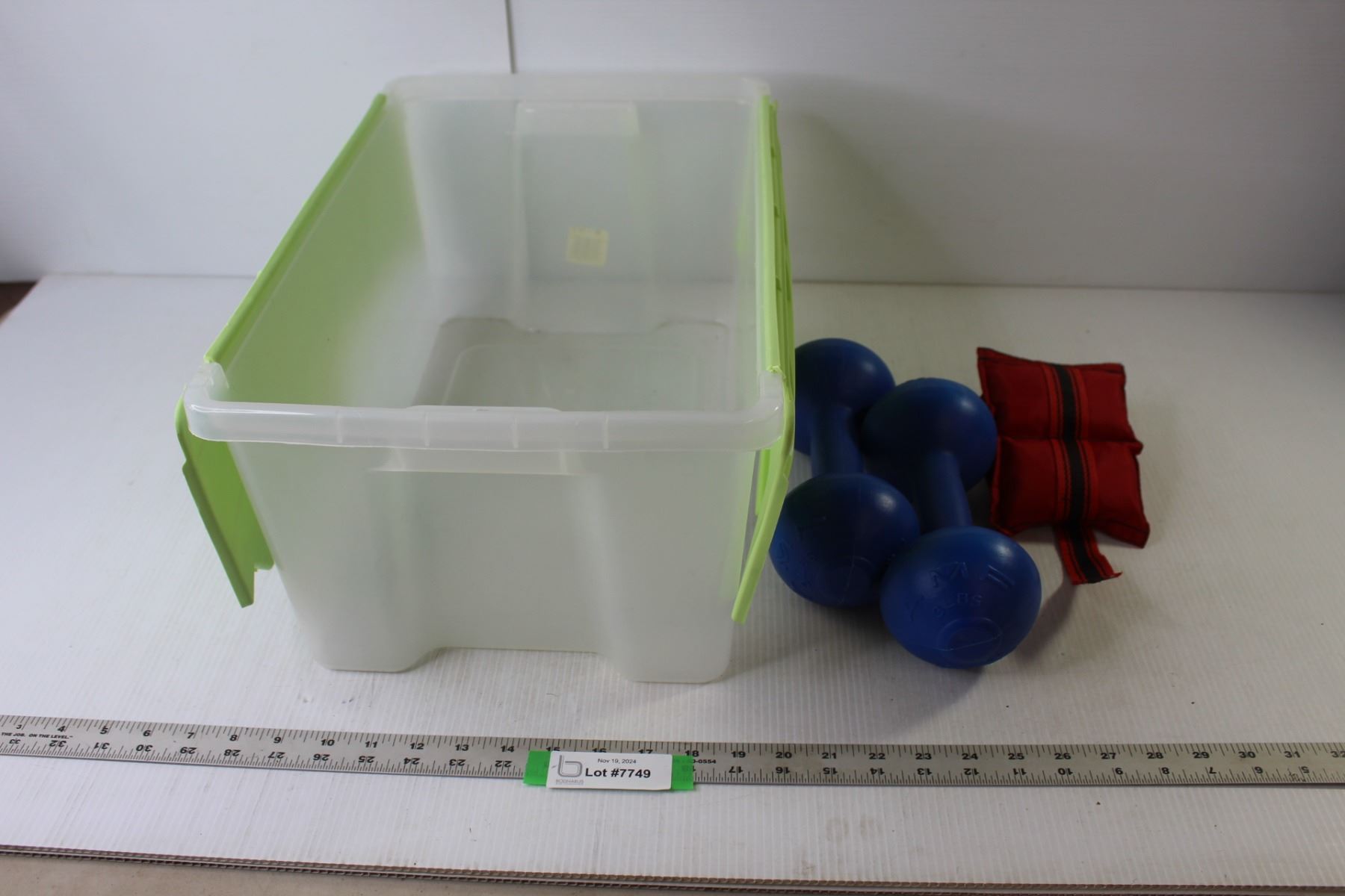 Plastic Storage Bin 18'5" x 12" x 8", Pair 3lb Dumbbells, Ankle Weight