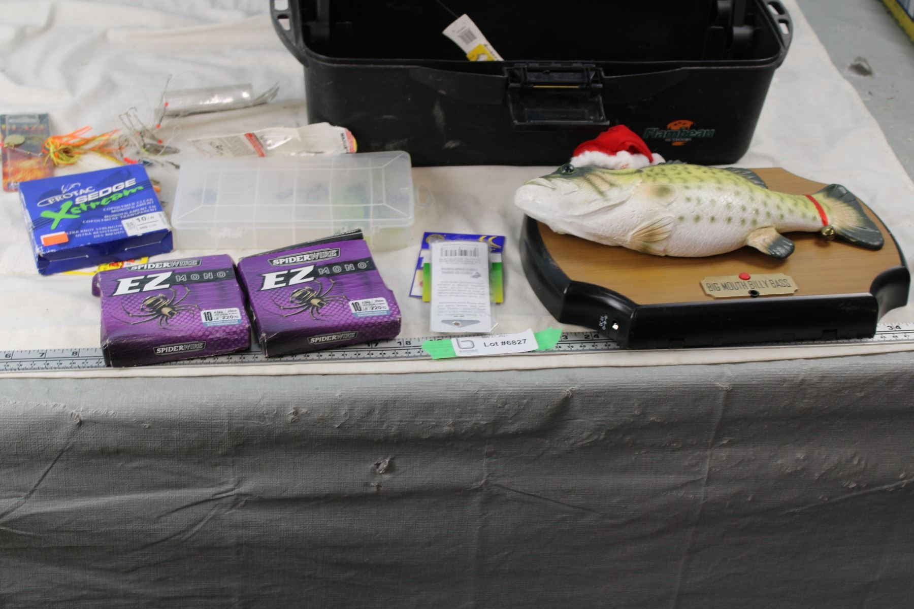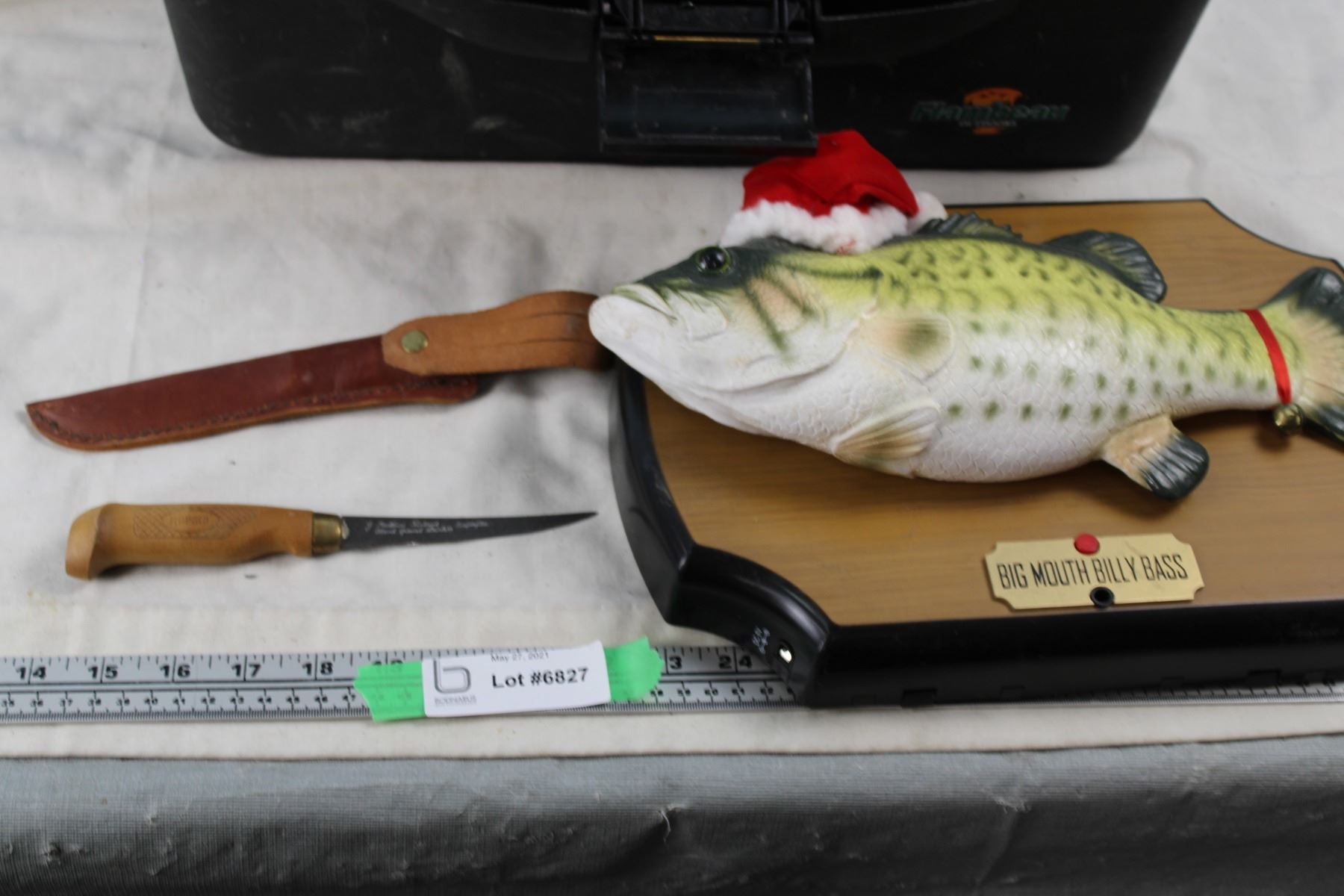 Plastic Tackle Box with Fishing Related Items and Big Mouth Bill Bass Toy Fish