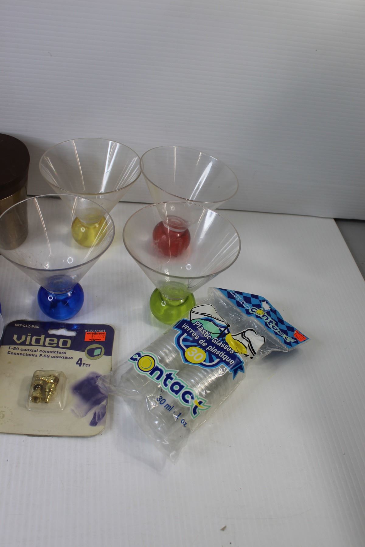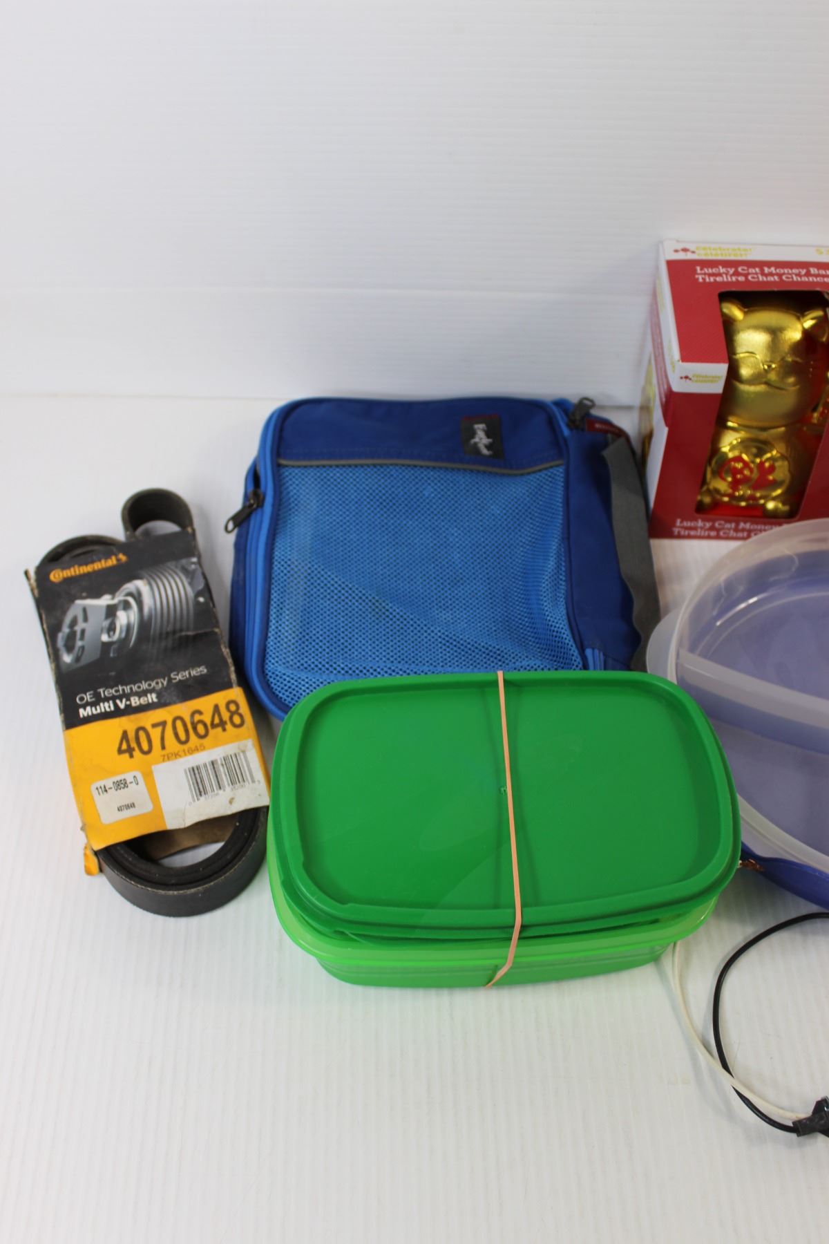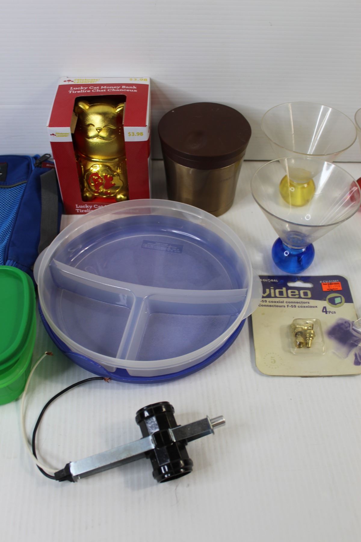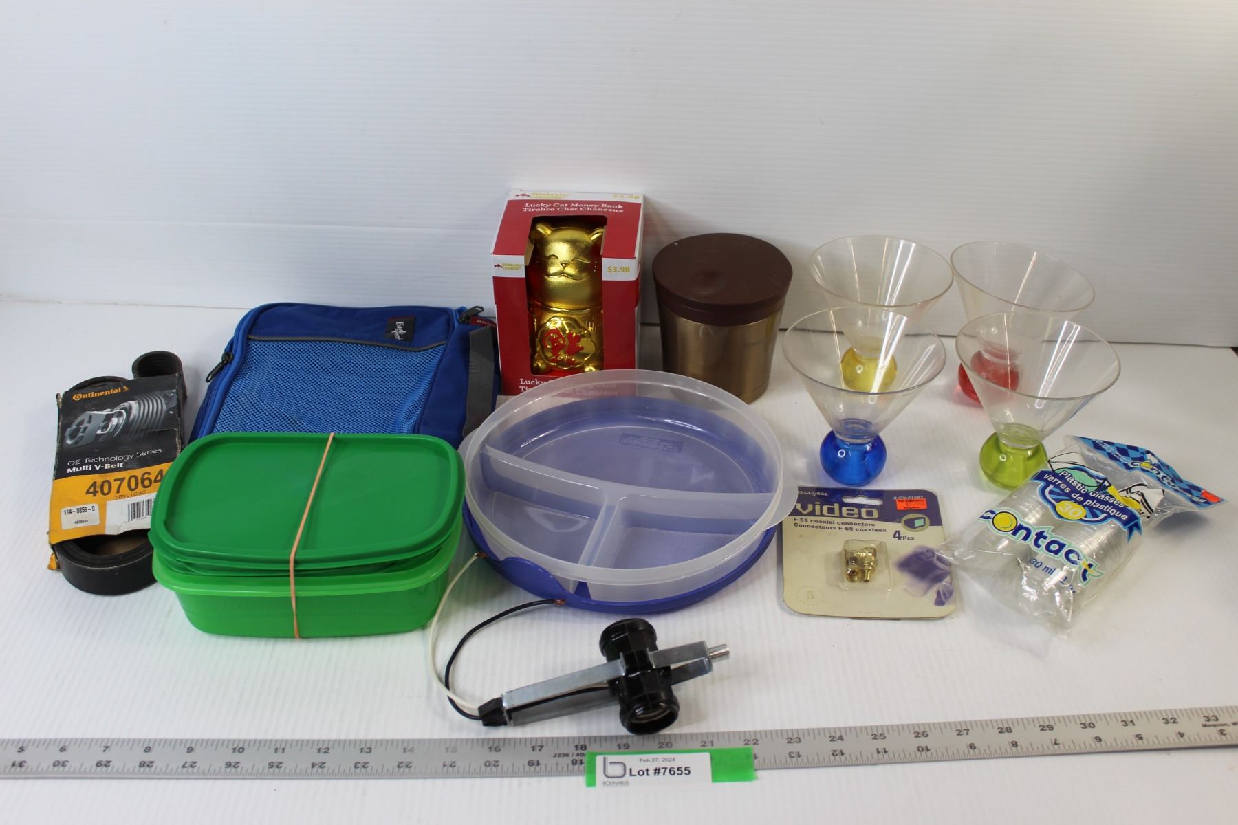 Plastic Wine Glasses & Shot Glasses, Lucky Cat Coin Bank, Food Containers, Motor Belt, Misc.