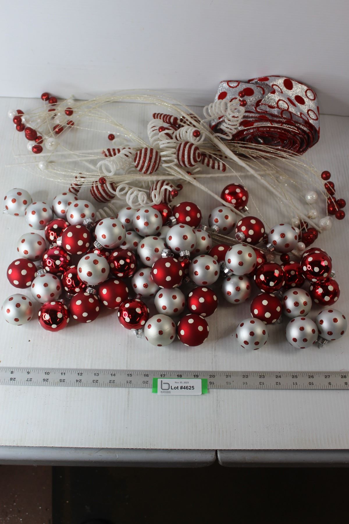 Polka-Dotted Christmas Tree Ornaments, Red & White Spiral Ornaments, Polka-Dotted Ribbon