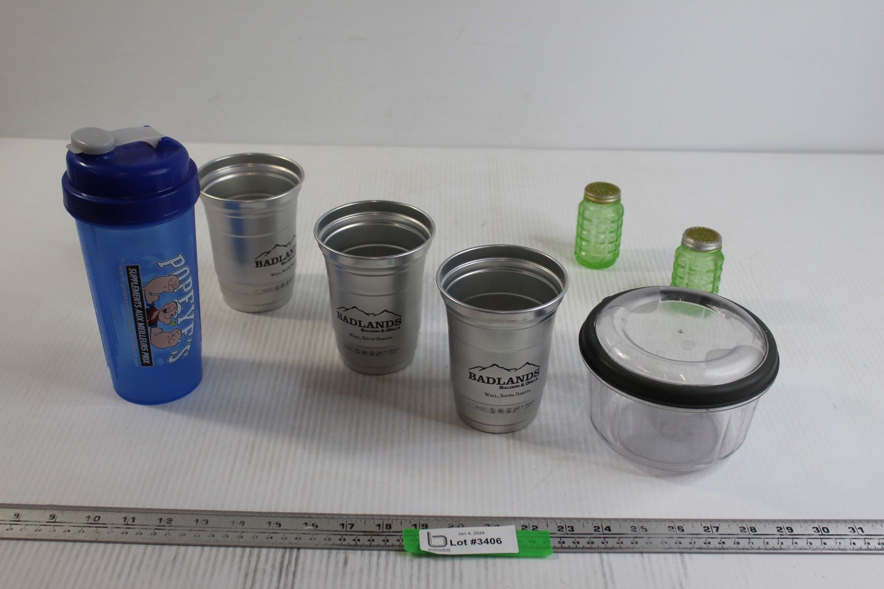 Popeyes Water Bottle, (3) Badlands Cups, Misc.