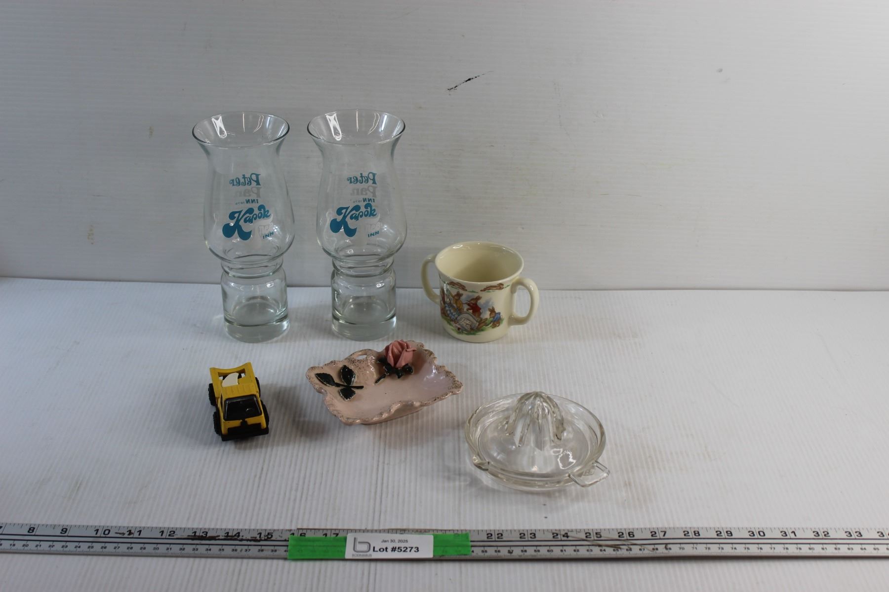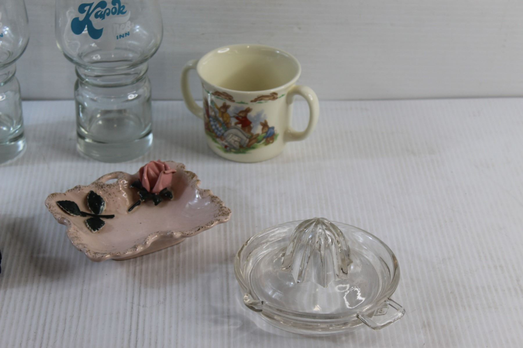 Porcelain Cup and Ashtray, Glass Cups, Juicer and Toy Truck