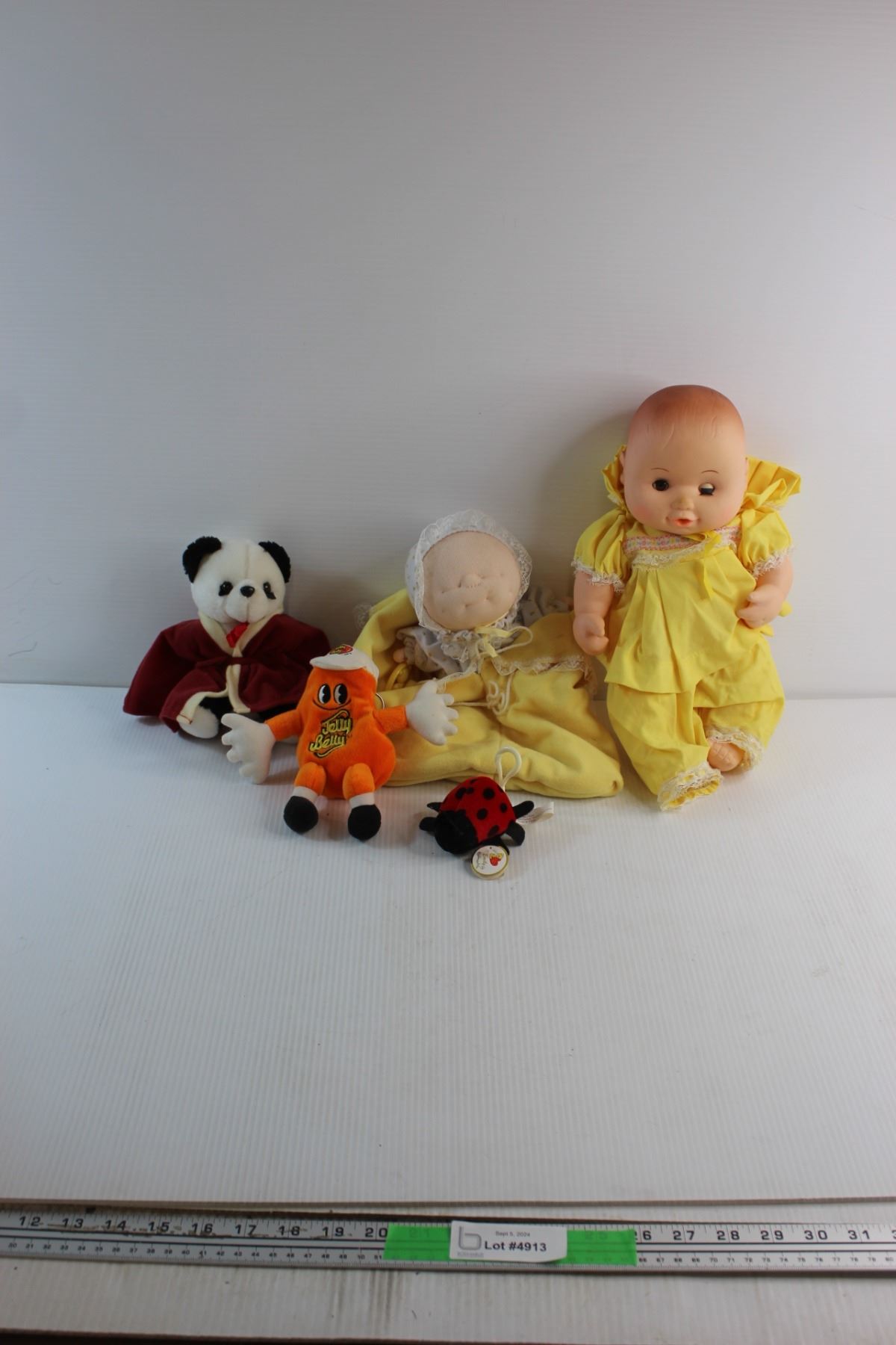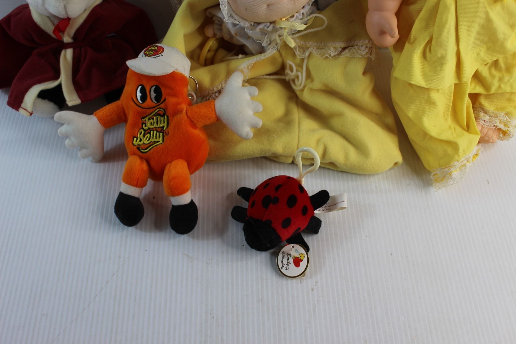 Porcelain Doll and (4) Assorted Plush Toys - Panda, Jelly Belly and Doll