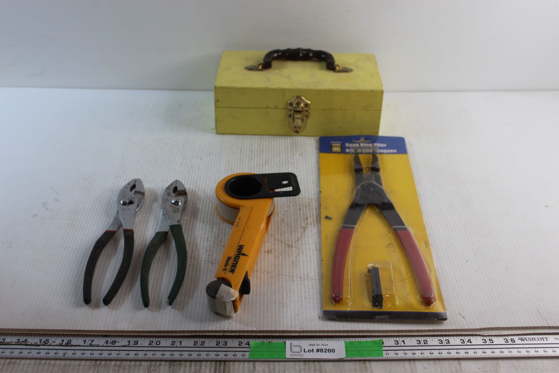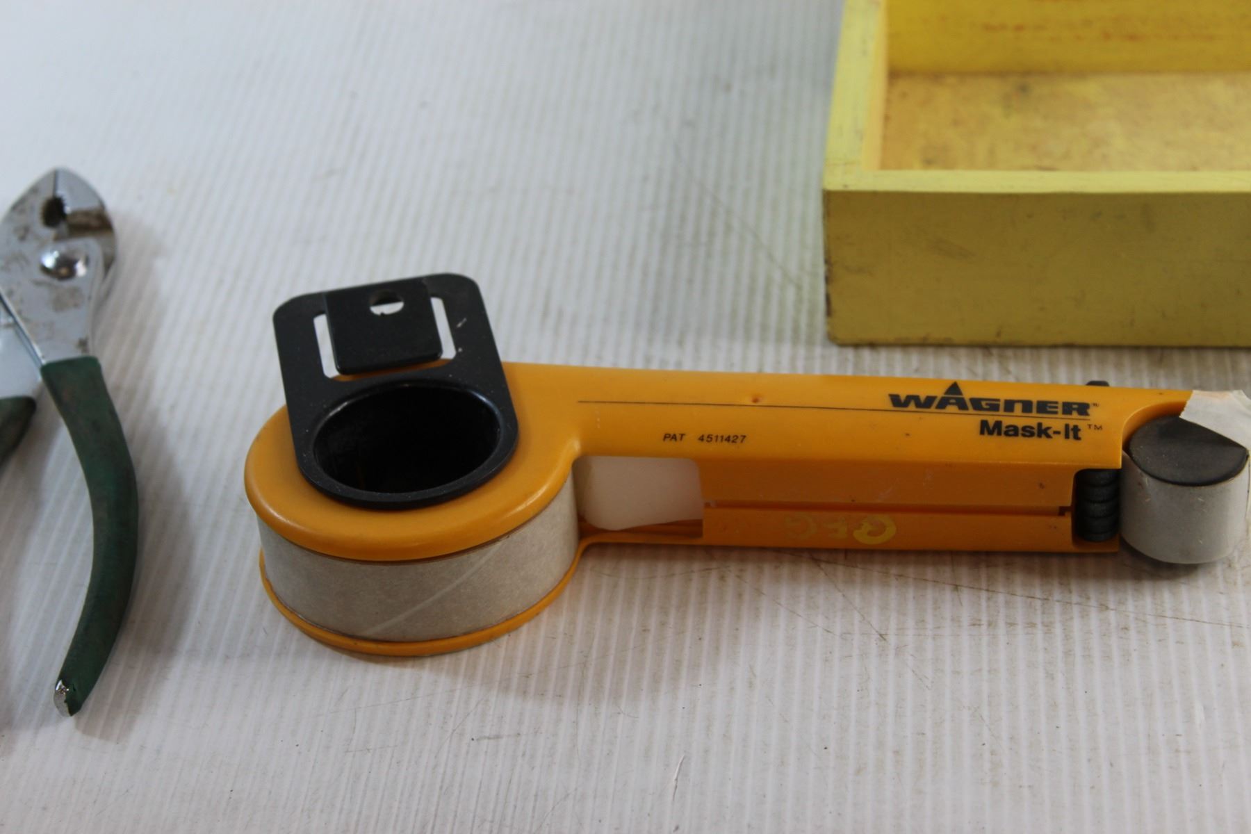 Power Fist Snap Ring Plier, (2) Unmarked Pliers, Wooden Tool Box and Wagner Mask It Tape Dispenser