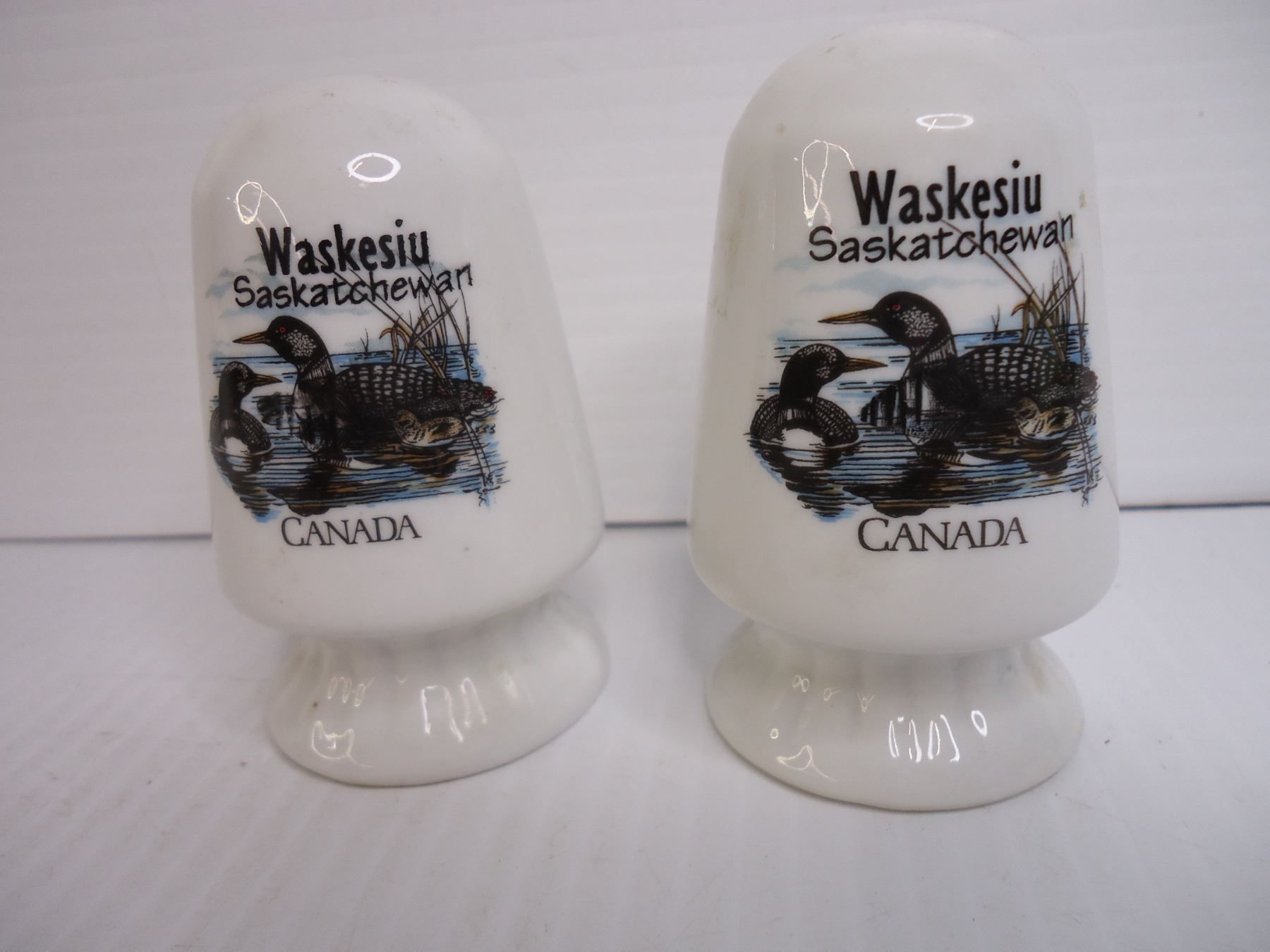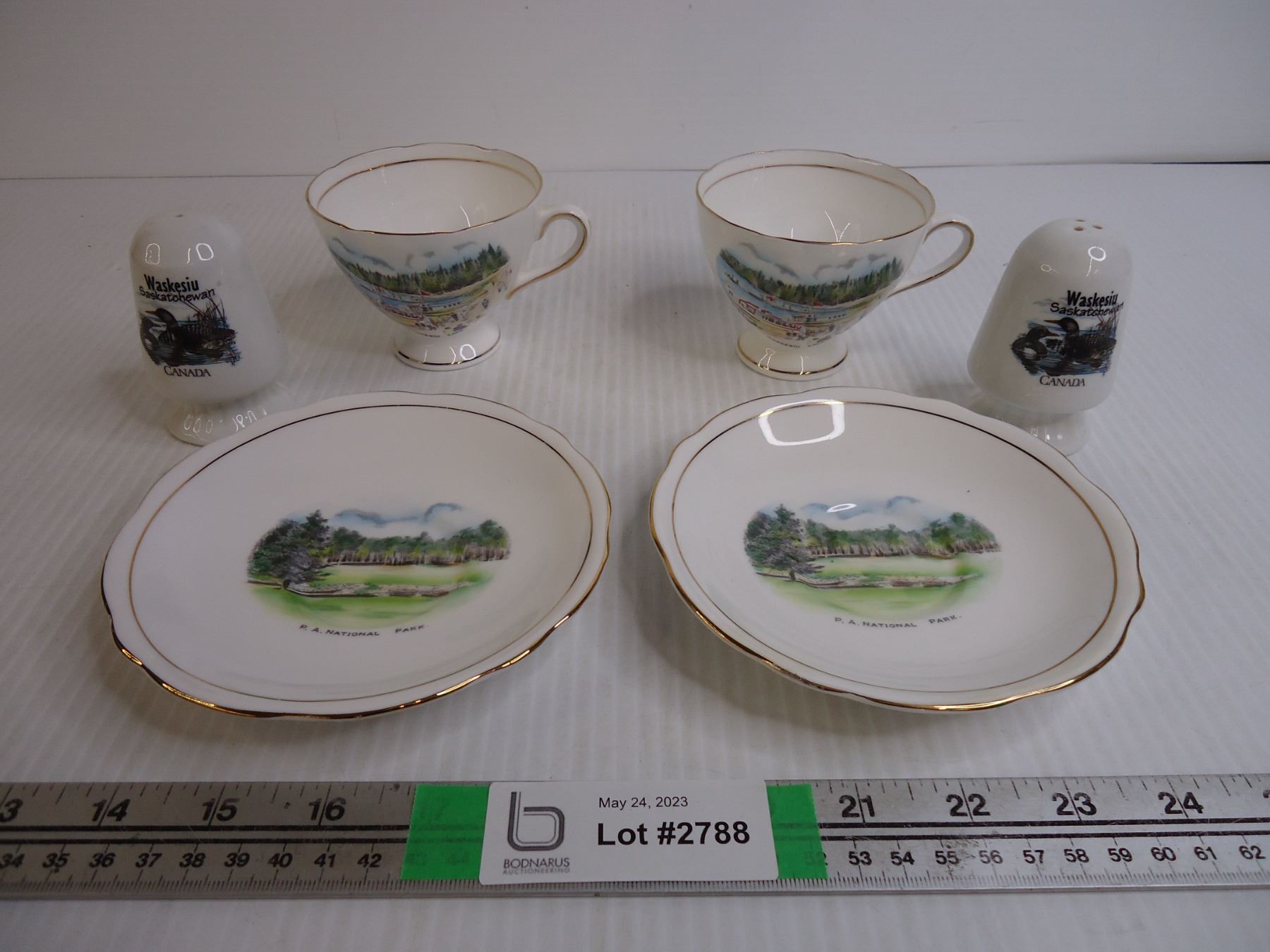 Prince Albert National Park-Waskesiu-Vintage Matching Tea Cups and Saucers-Gladstone, England and Pair of Waskesiu Salt/Pepper