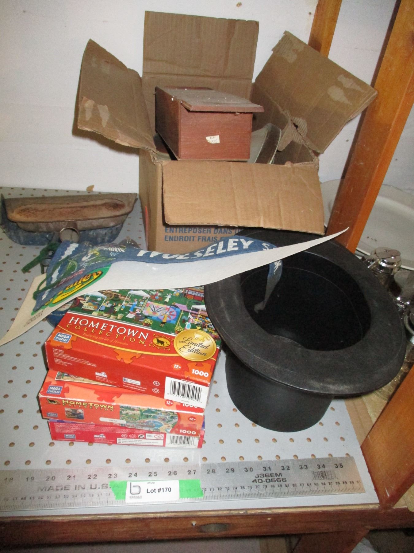 Puzzles, top hat, ice bucket, wooden shoes, misc