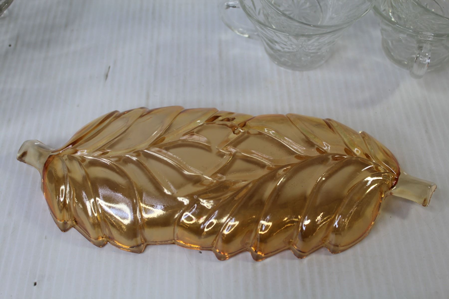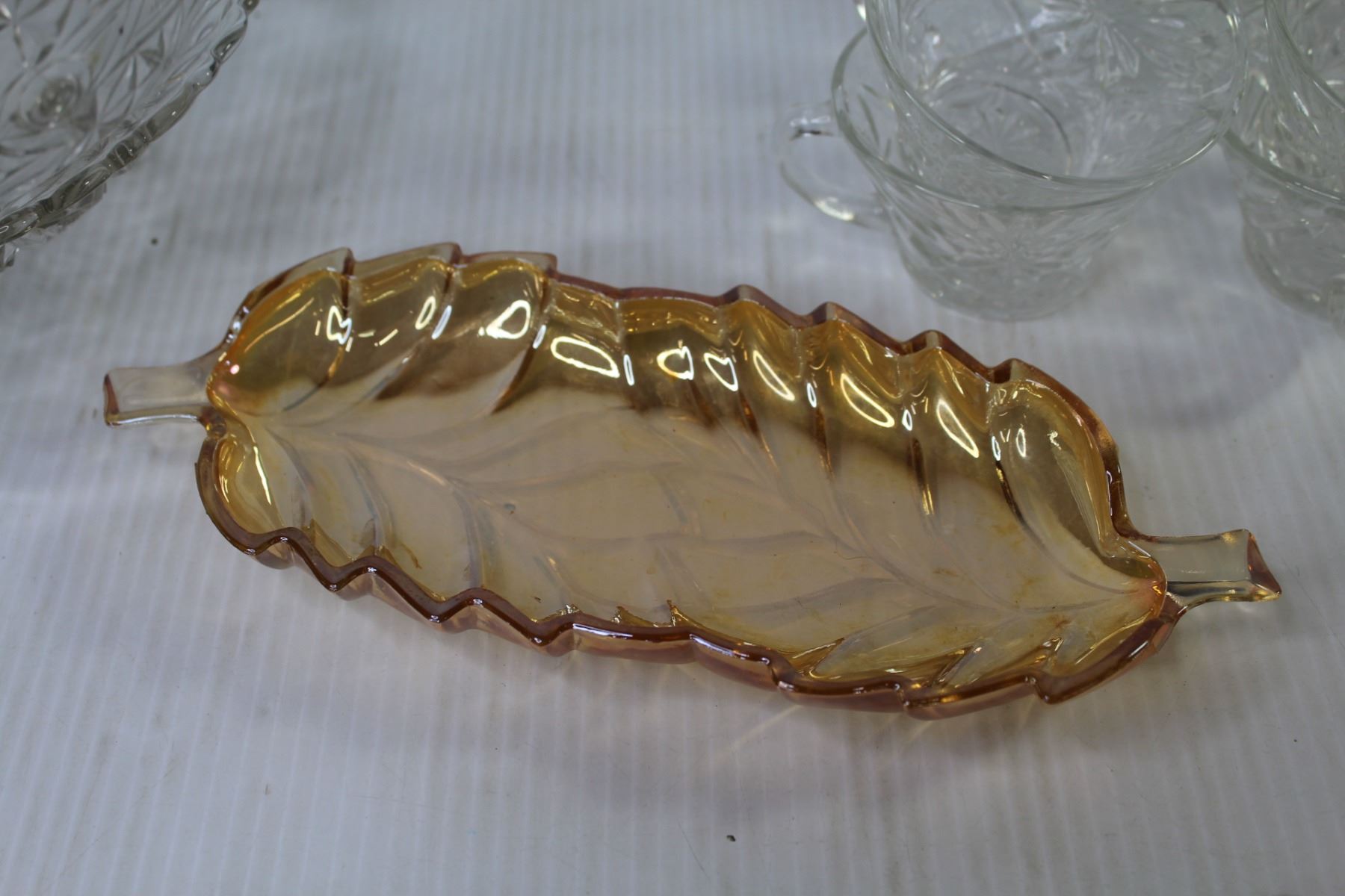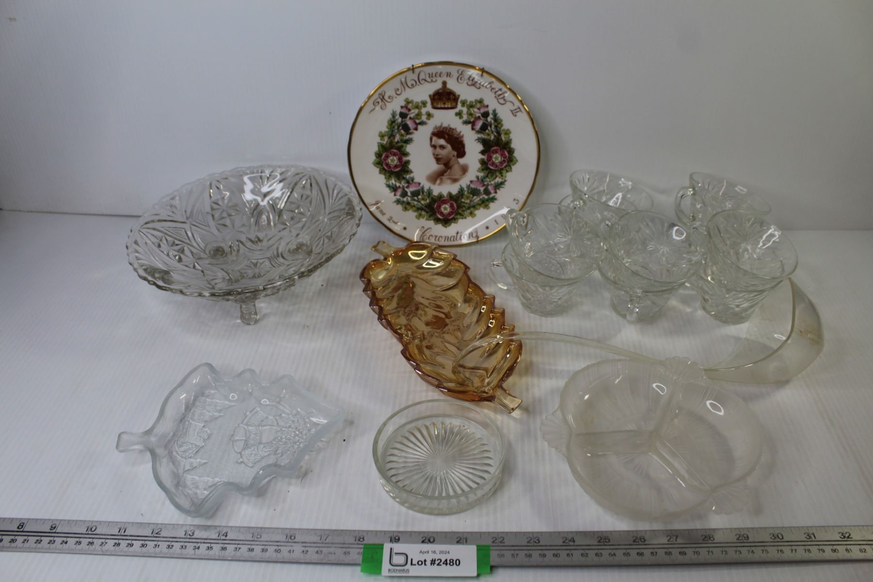 Queen Elizabeth 1955 Coronation Plate - (10) Punch Bowl Glasses - Plastic Ladle - Iridescent Gold Dish - Misc. Glass Dishes