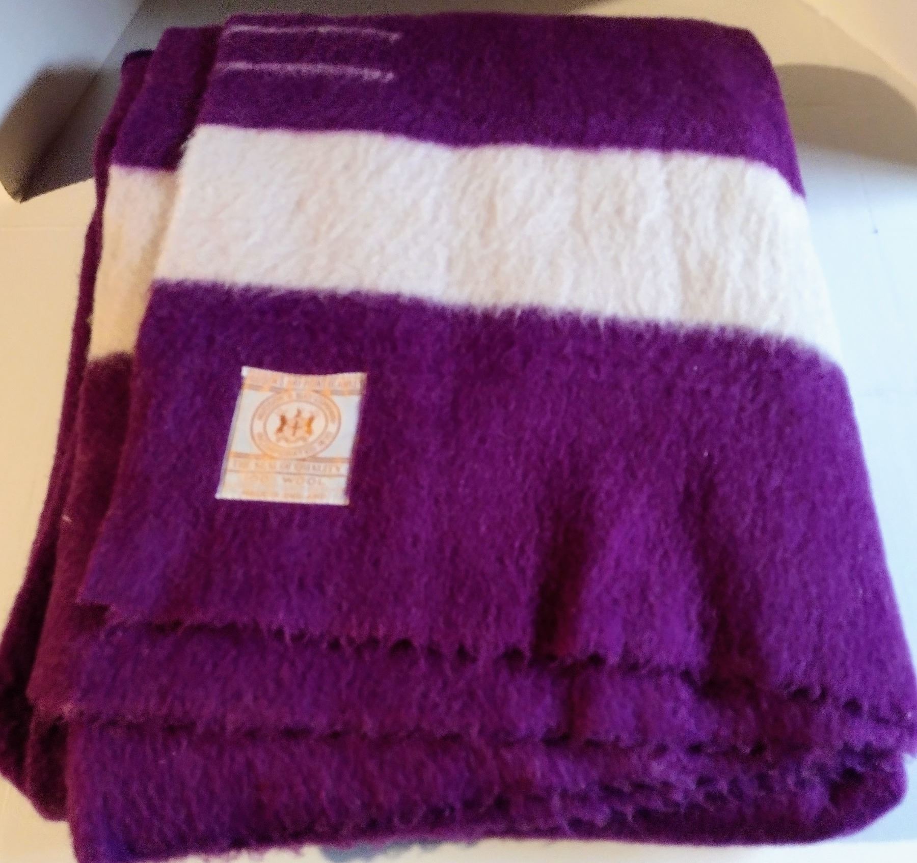 Queen Elizabeth Hudson Bay Company coronation blanket, 1953. Royal Purple with white stripes, 4 point blanket. One of the rarest HBC blankets looked for by collectors. In mint condition. Blanket is 70 years old