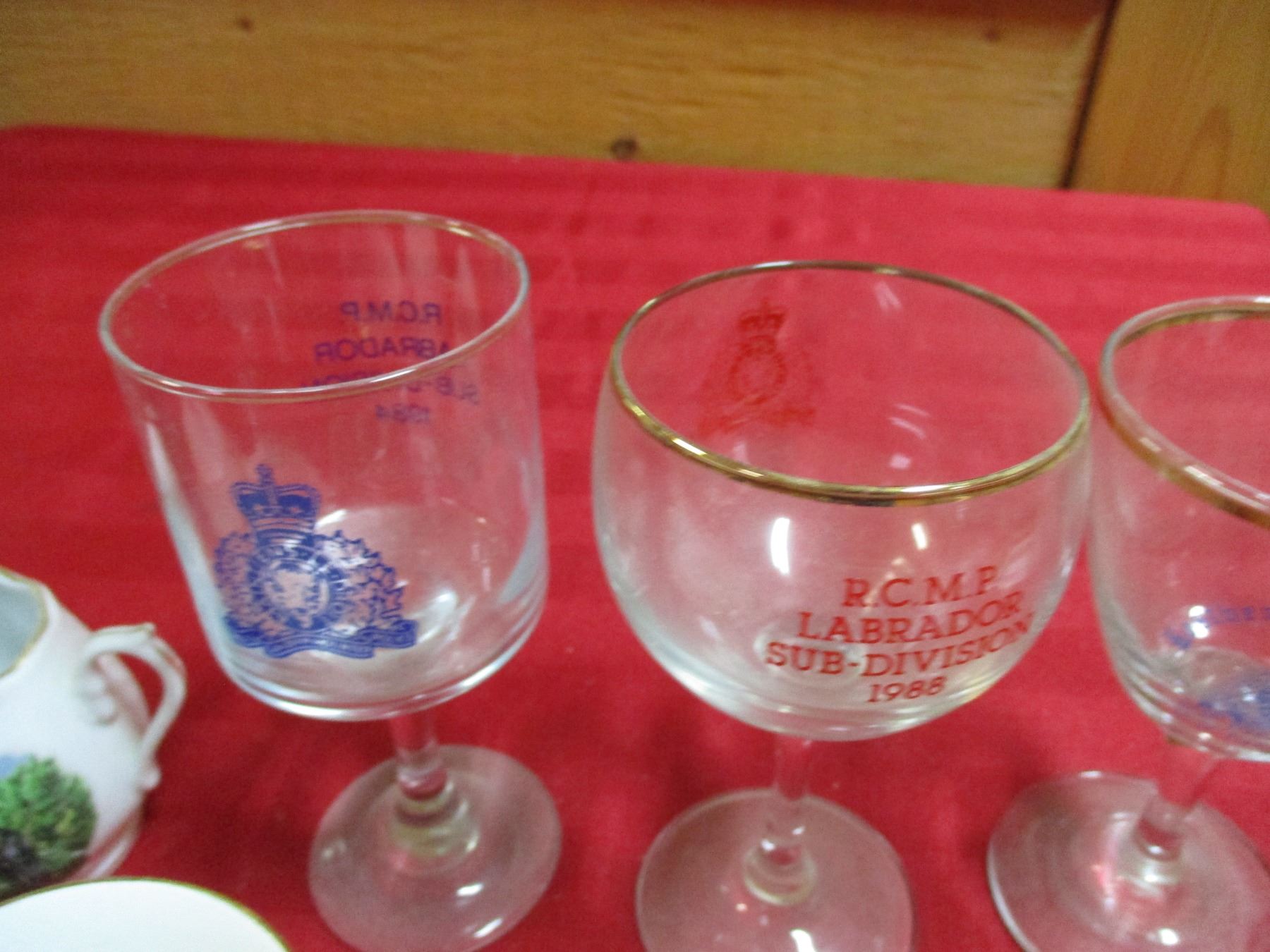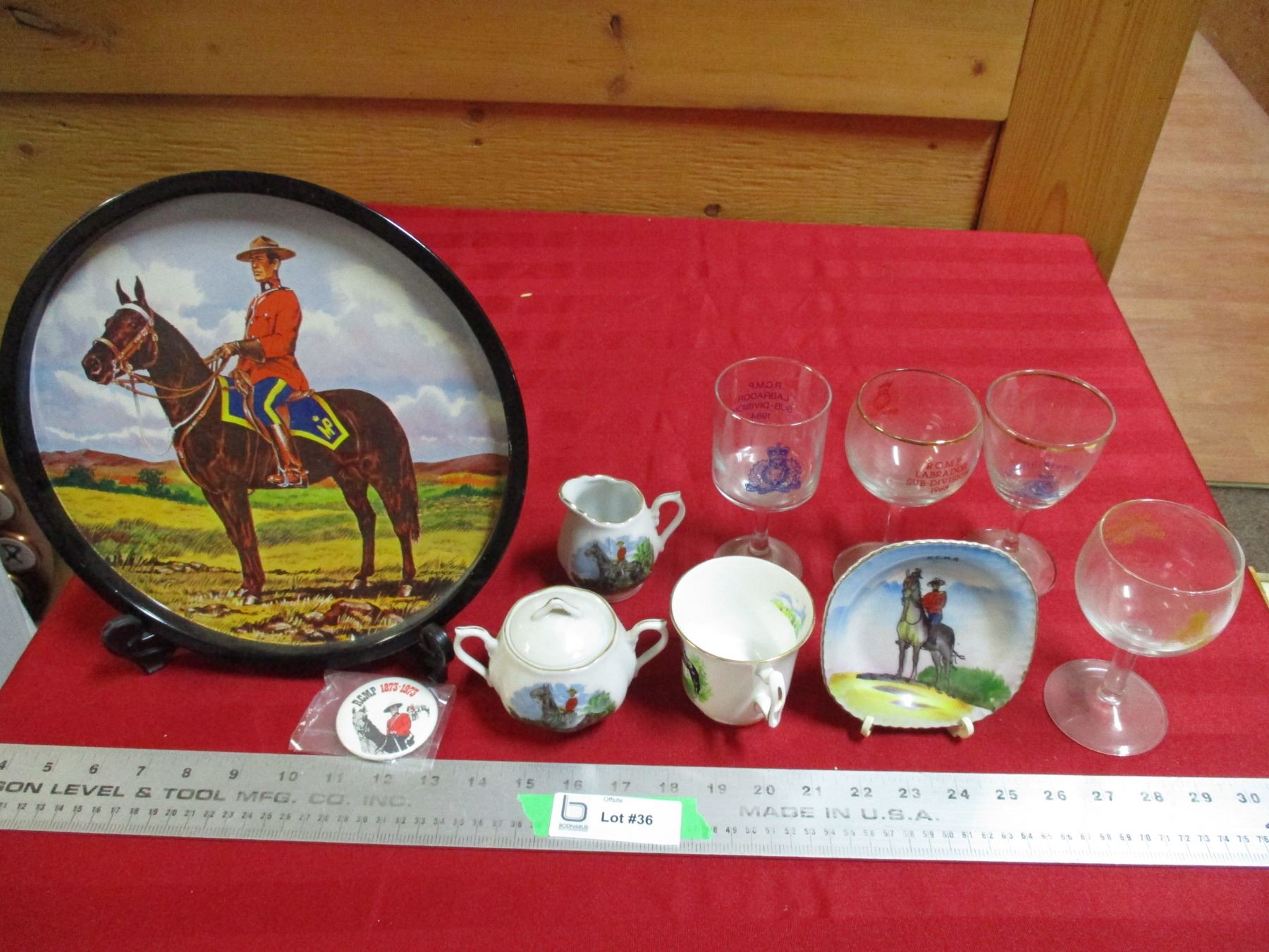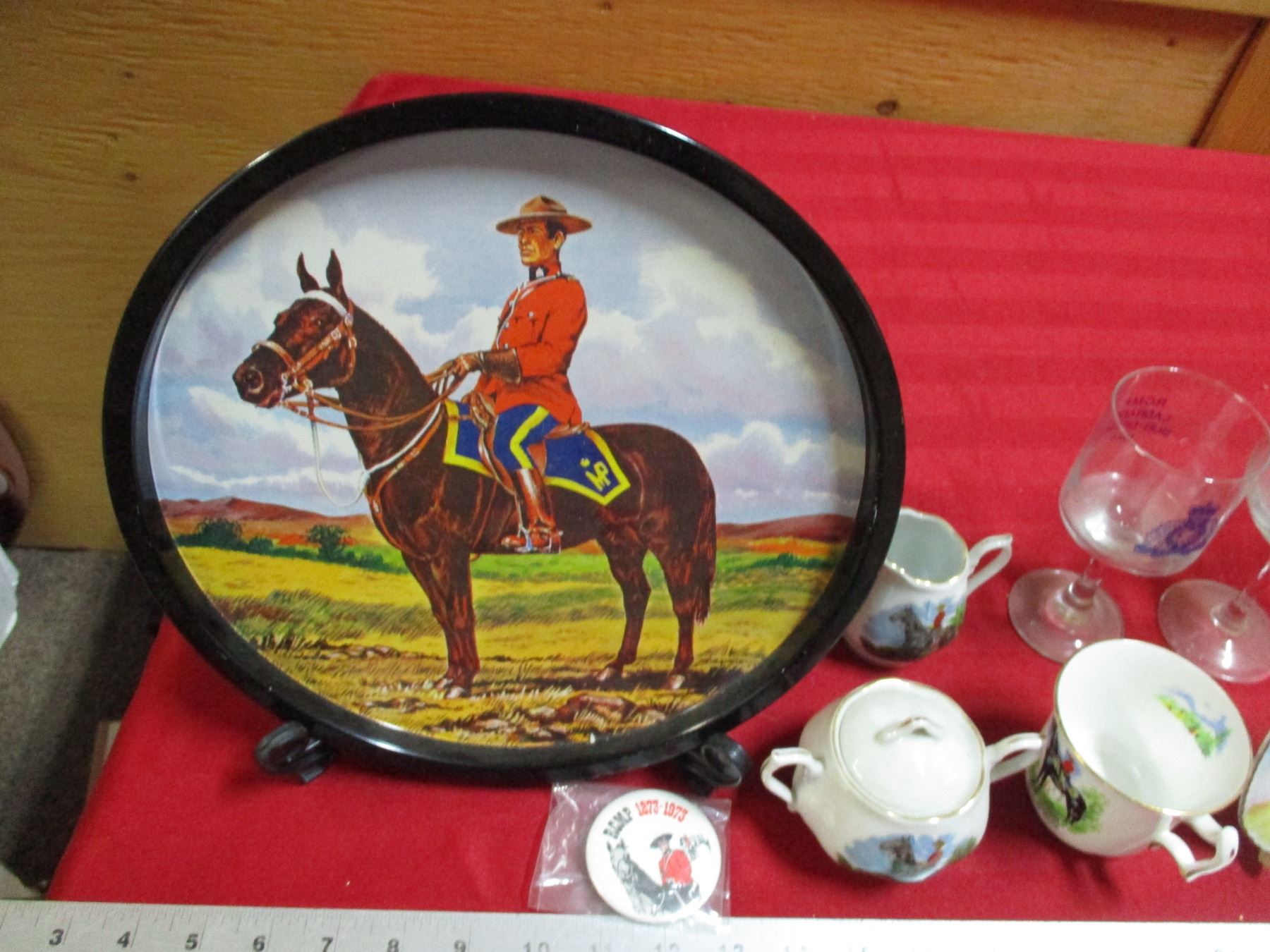 RCMP memorabilia lot - Tray, Cream + Sugar dishes, wine cups