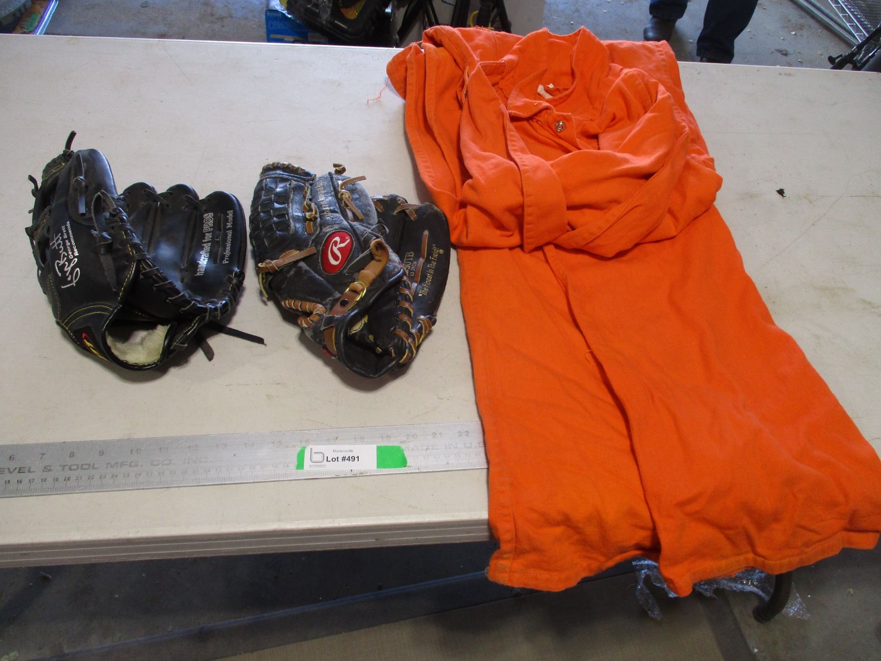 Rawlings & Brett Left Handed (Right Hand Throw) Baseball Gloves, & Orange Hunting Coveralls (Size 48 Reg)