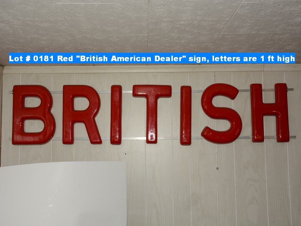 Red "British American Dealer" sign, all 21 letters, letters are 1 ft high