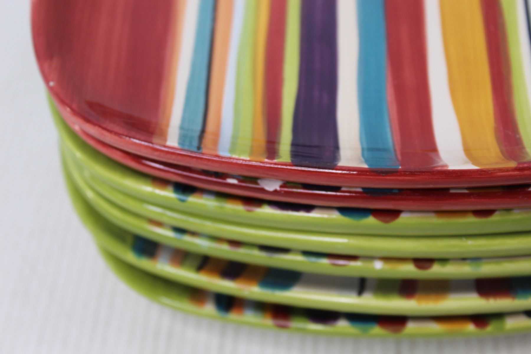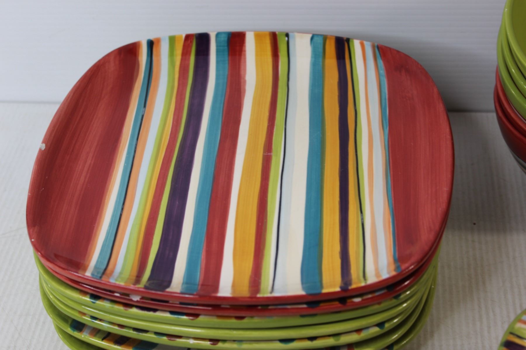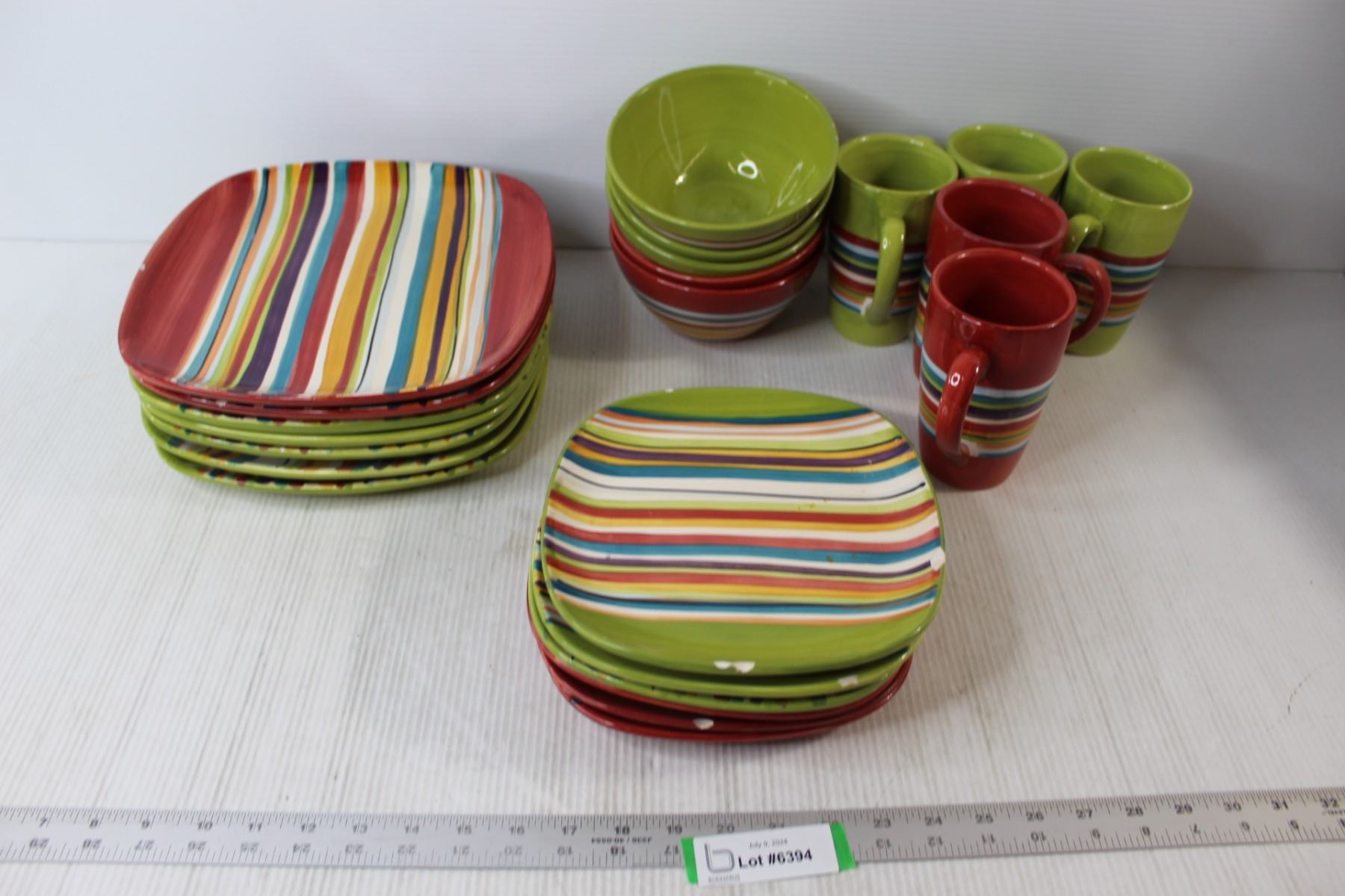 Red & Green Striped Dish Set - As Is - Some Chipping