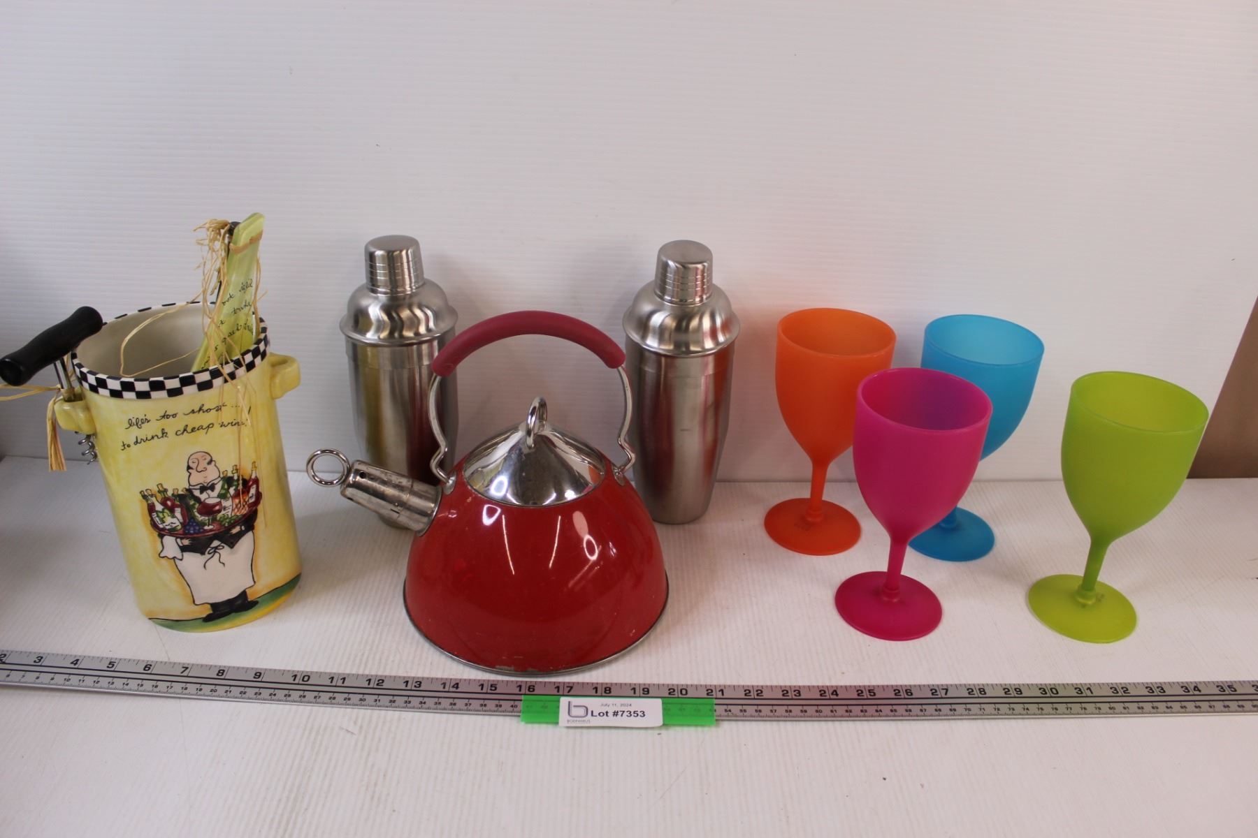Red Kettle, (2) Margarita Shakers, (4) Plastic Wine Glasses, Wine Ice Bucket & Cheese Board