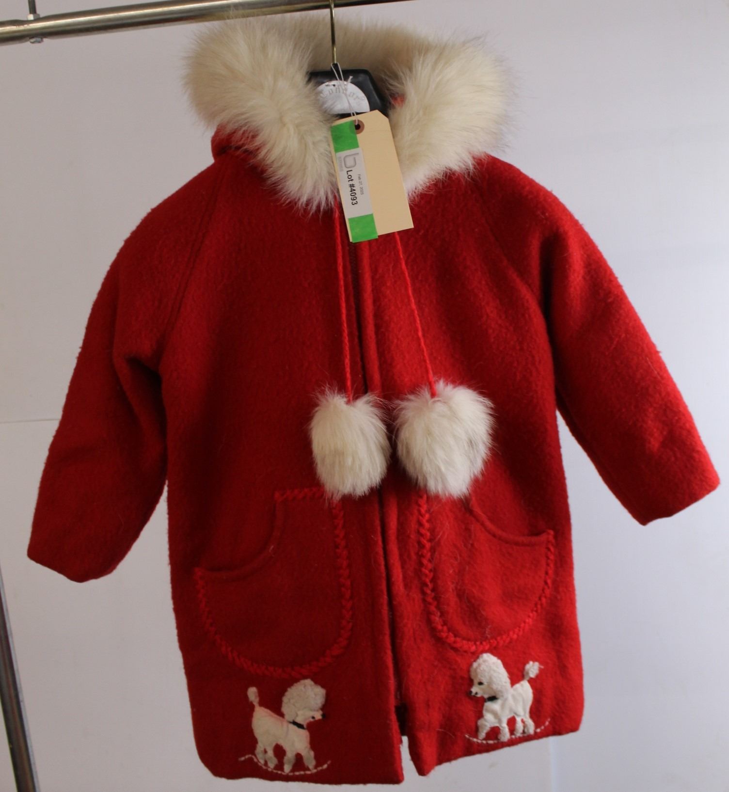 Red Wool Parka with Real Fur Collar and Pom Poms 24" Long x 17.5" Wide