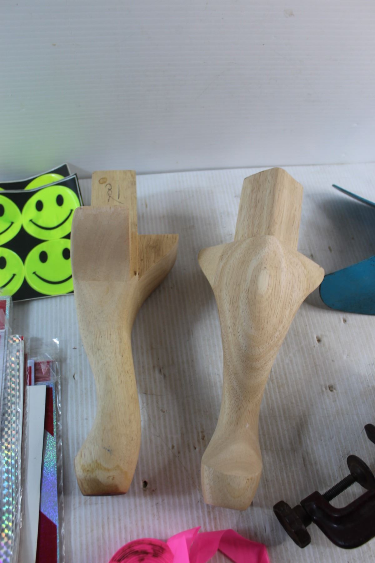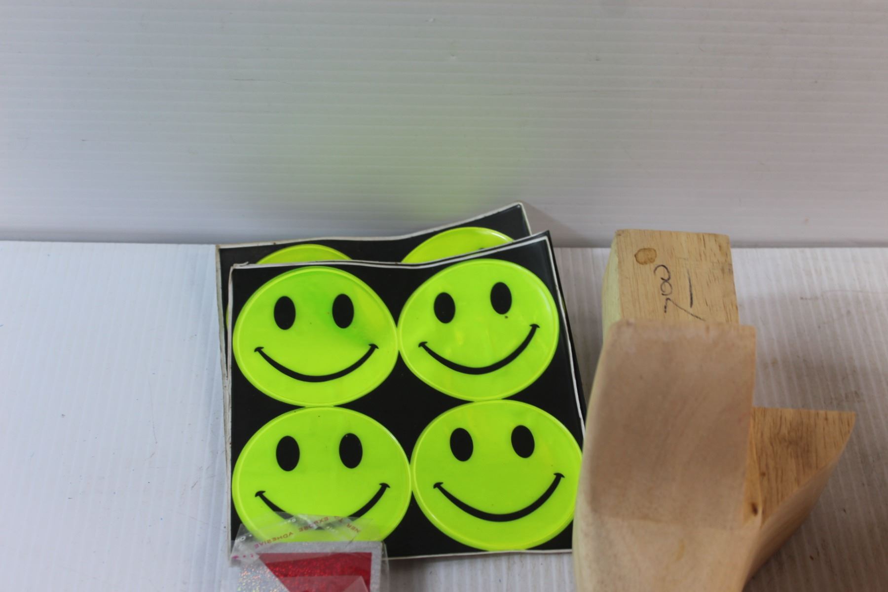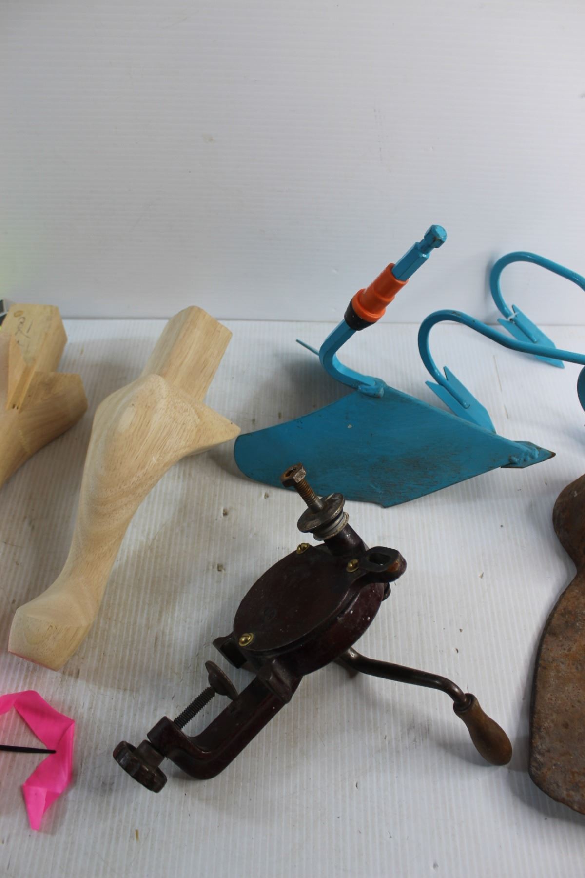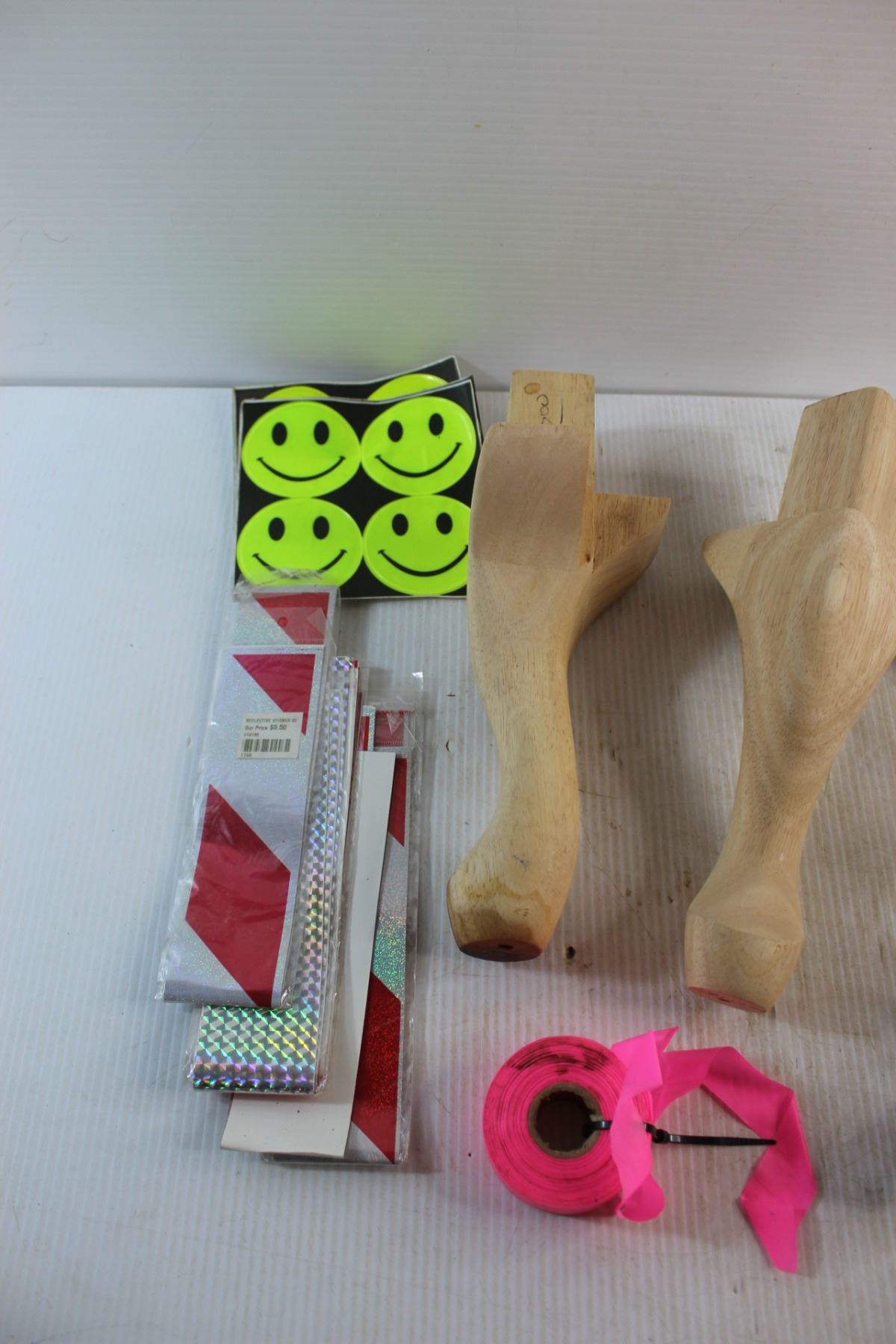 Reflective Stickers. Garden Attachments, Bench Malt Grinder, Wooden Table Legs and Assorted Items