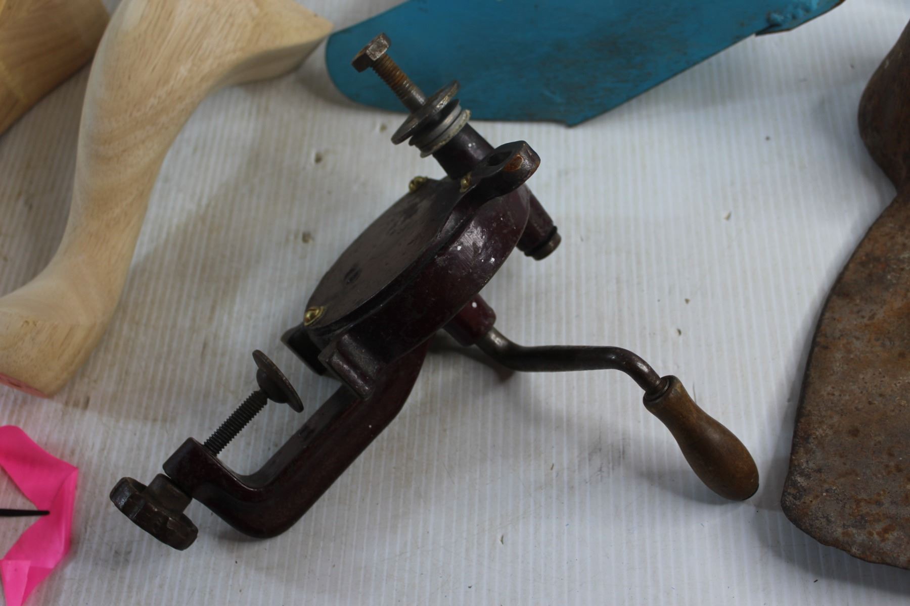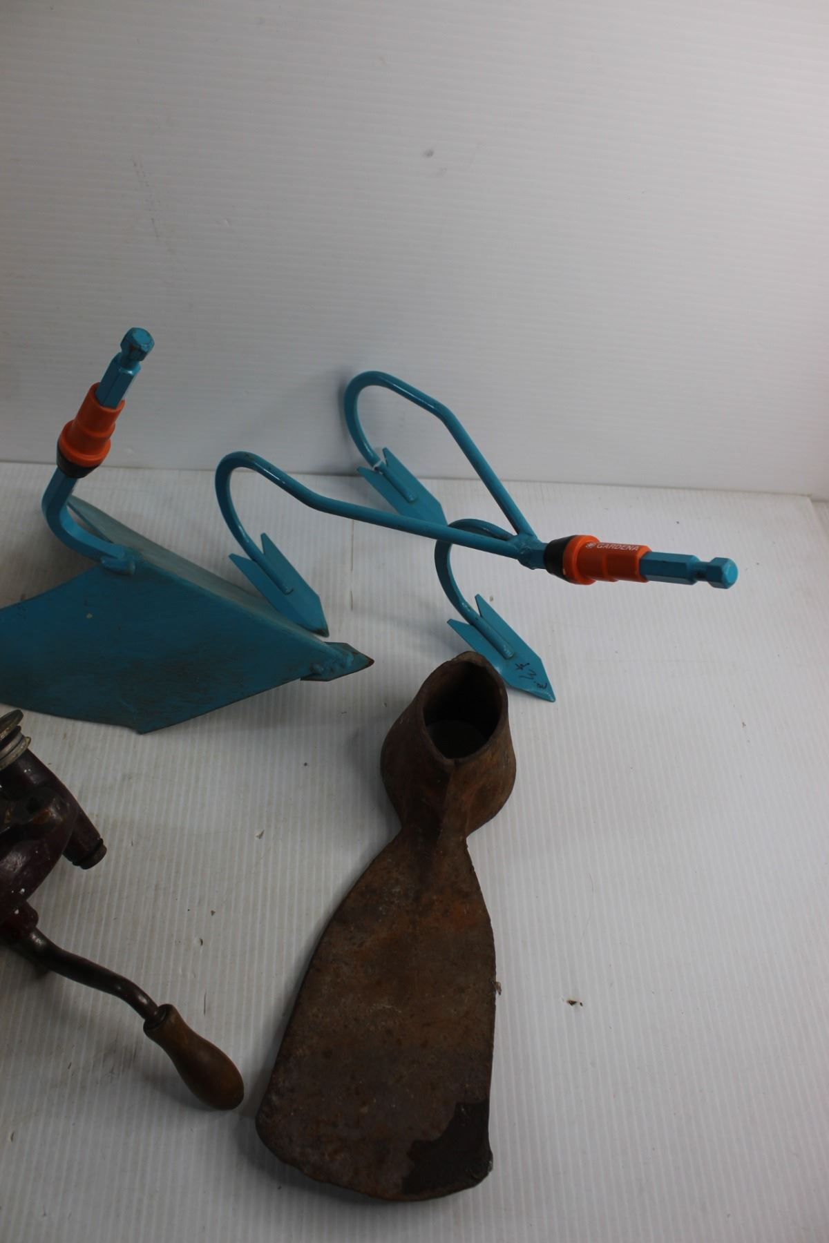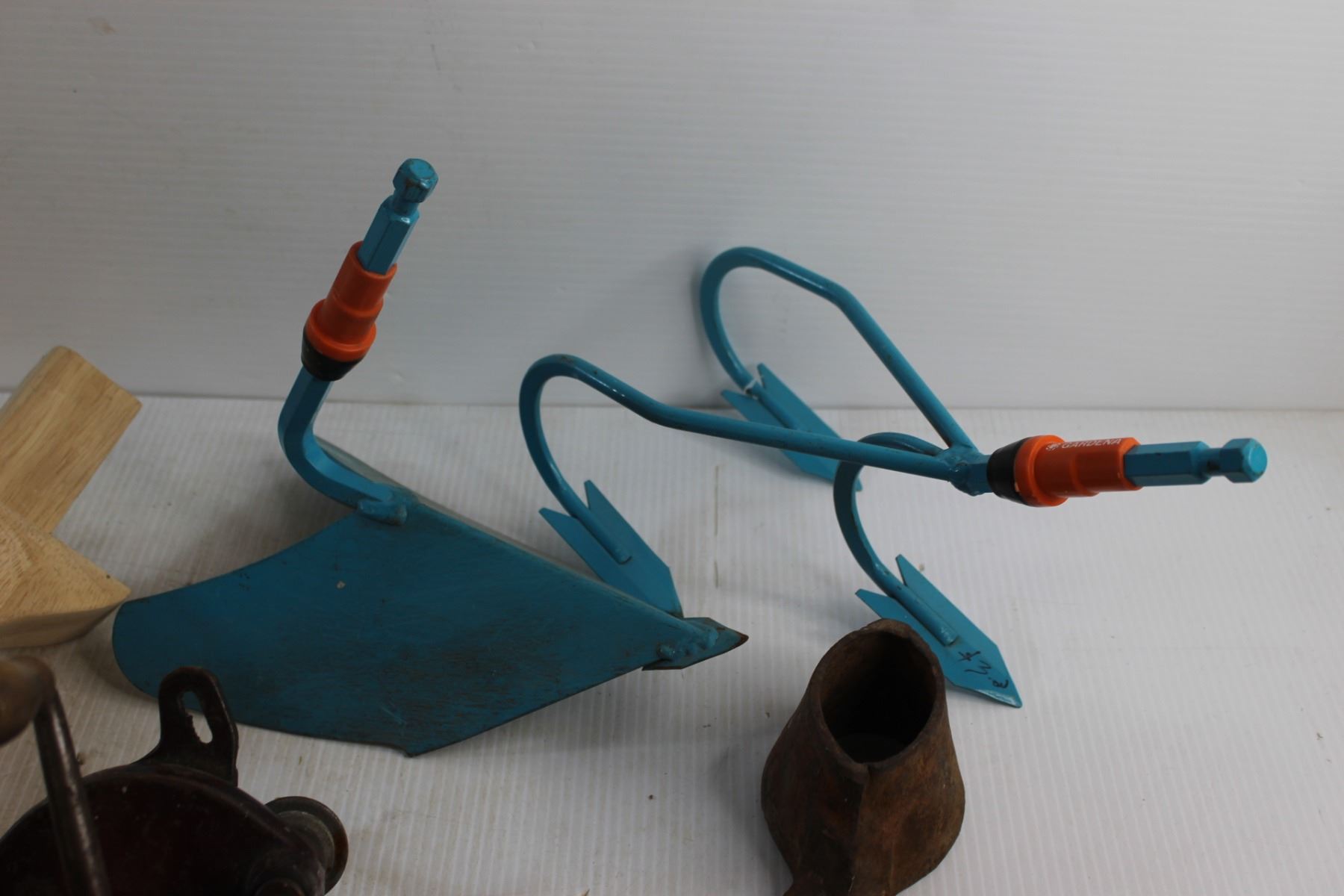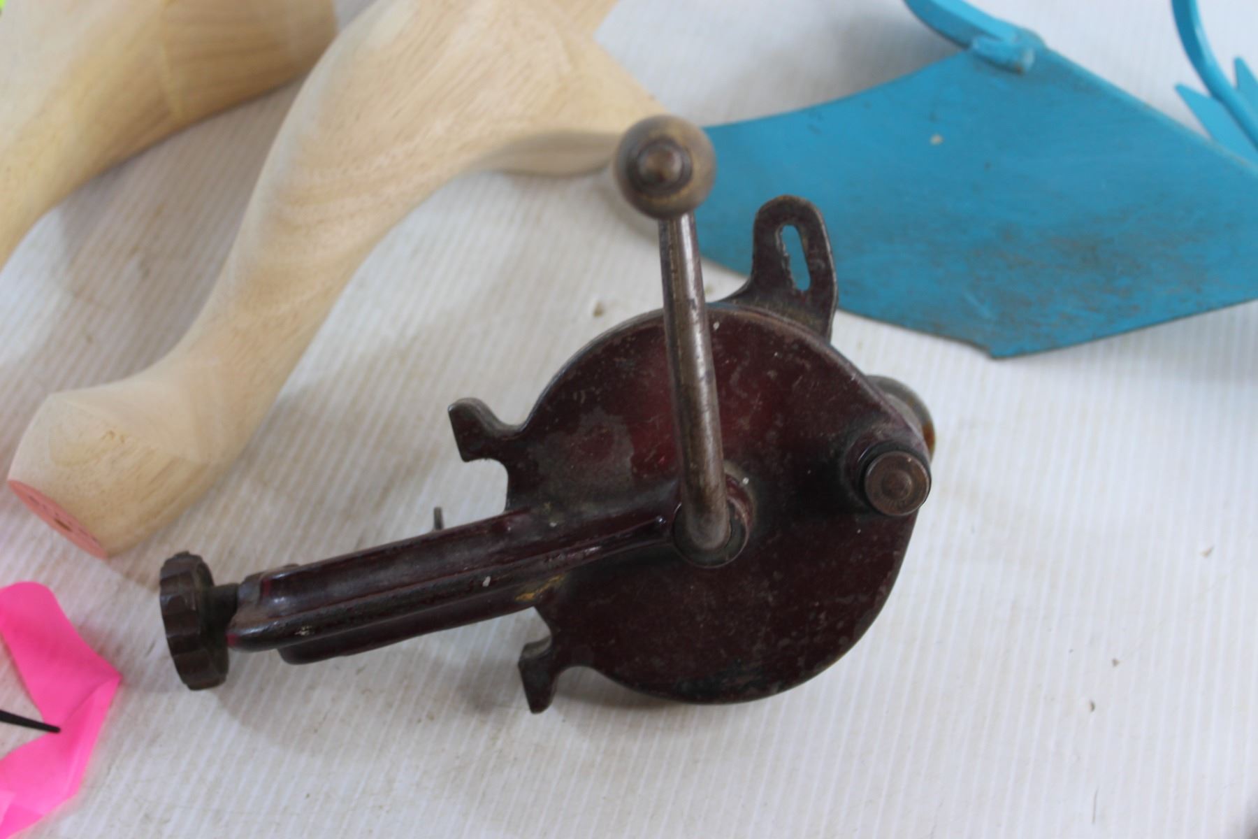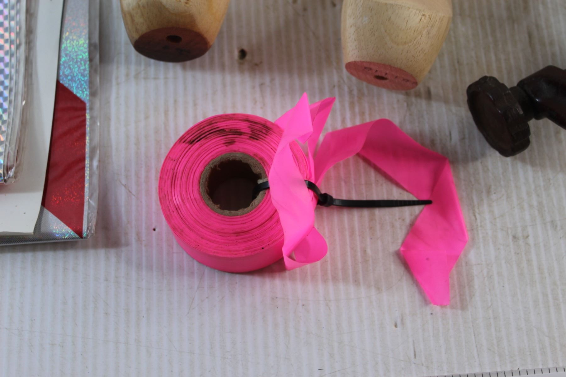 Reflective Stickers. Garden Attachments, Bench Malt Grinder, Wooden Table Legs and Assorted Items