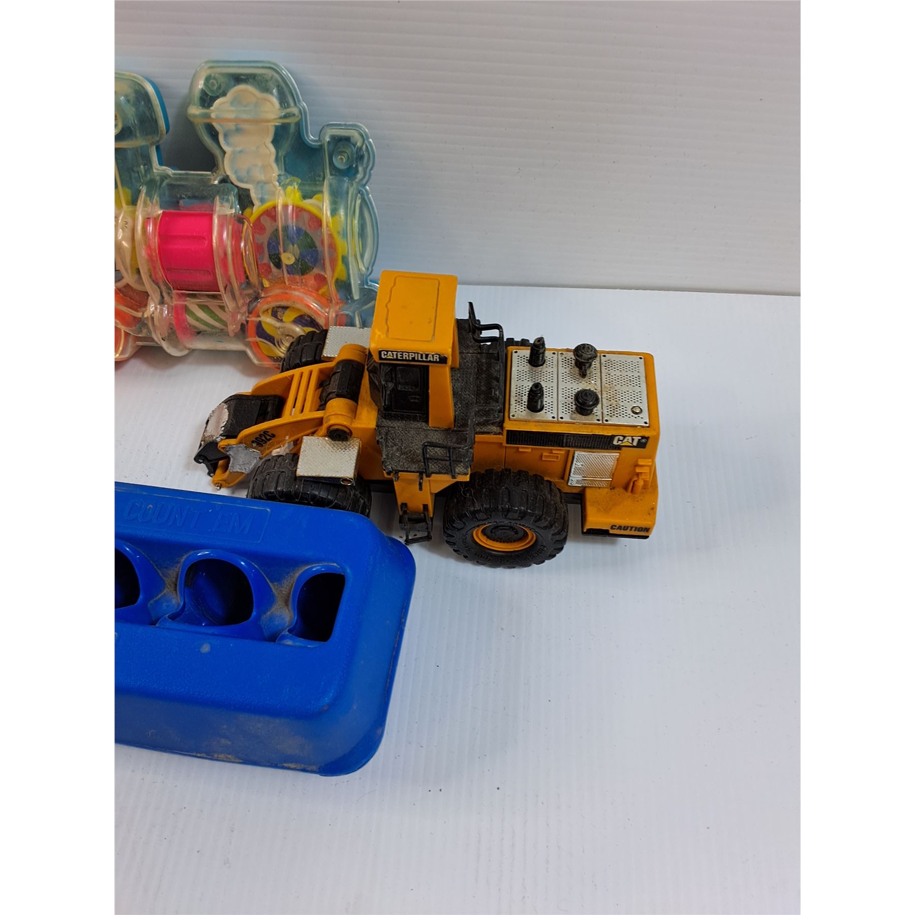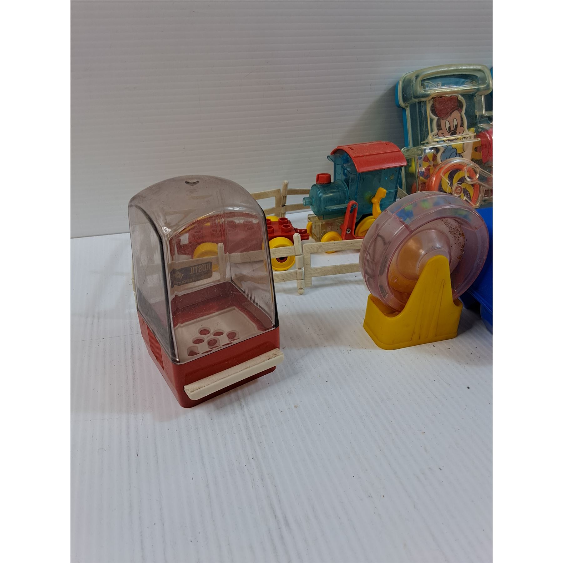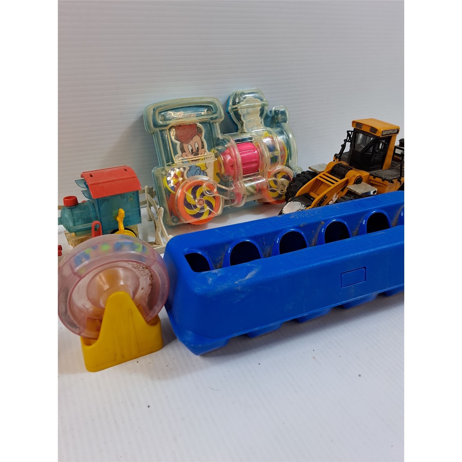 Retro Toy Lot: Duplo Car, Farm Fence, Mickey Mouse, Caterpillar Construction Truck, Egg Caton, Misc