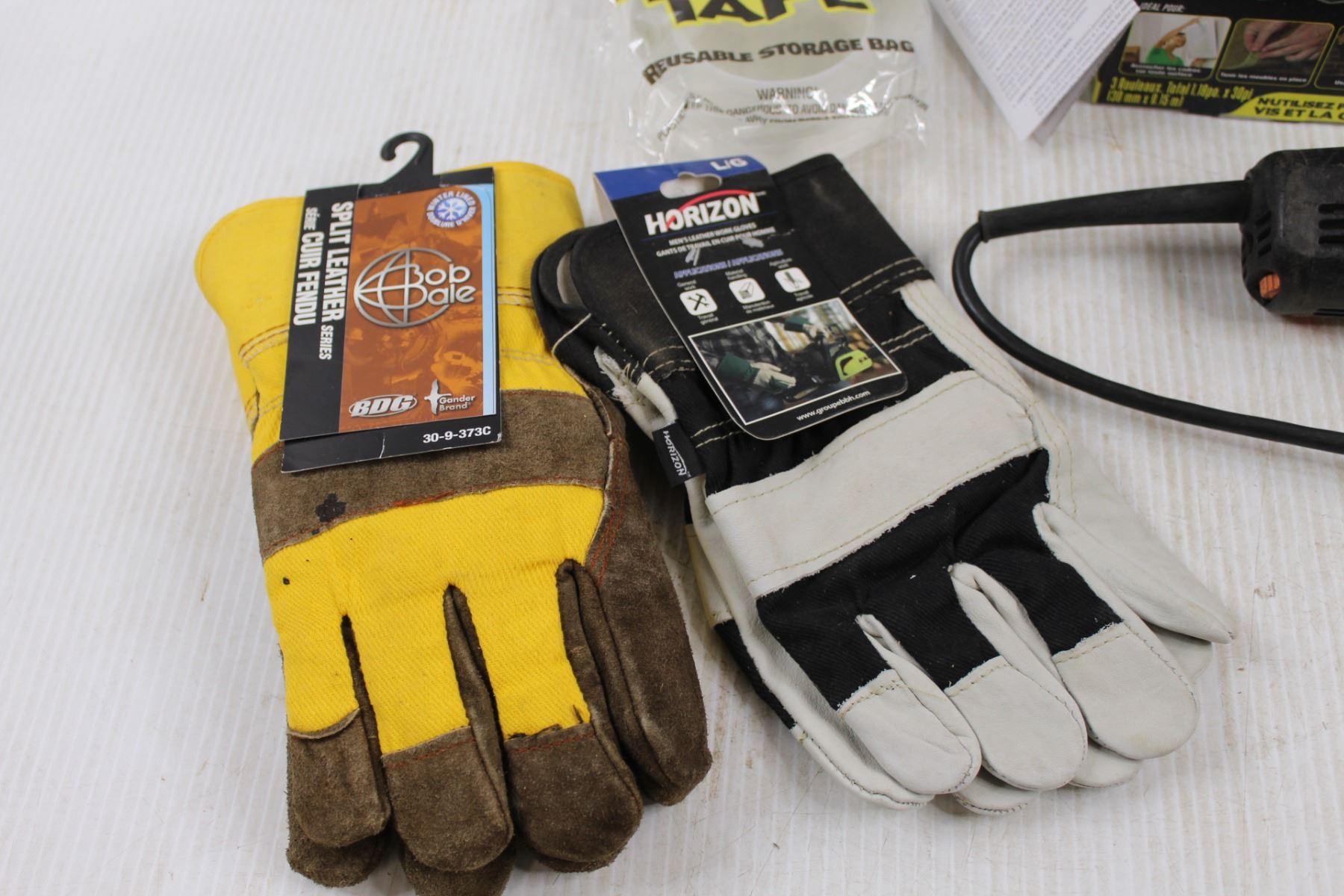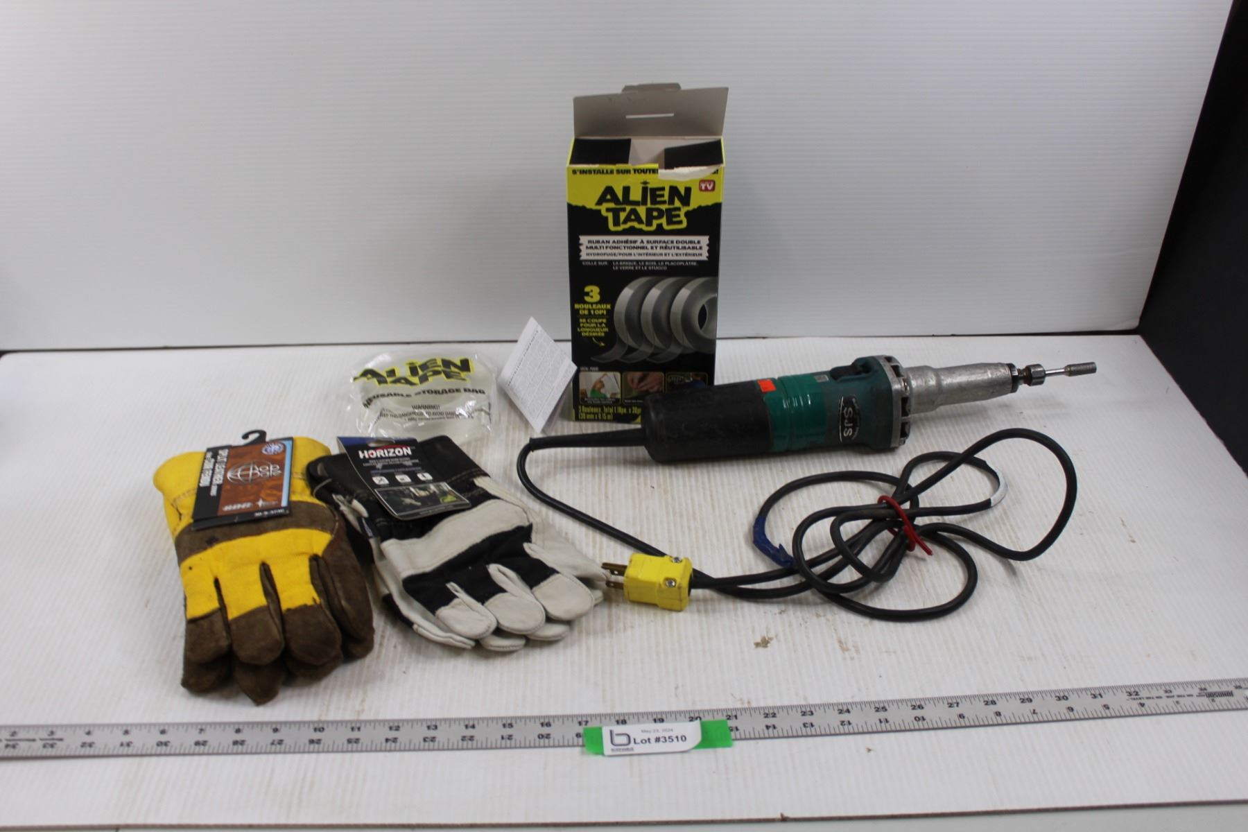 SJS Electric Cored Die Grinder w/Bit (Working, Trigger Doesn't Work, Starts as Soon As Plugged In, Cord Damage), (2 pr)Size Large Work Gloves (One Insulated, One Not) & (1) Roll Alien Tape