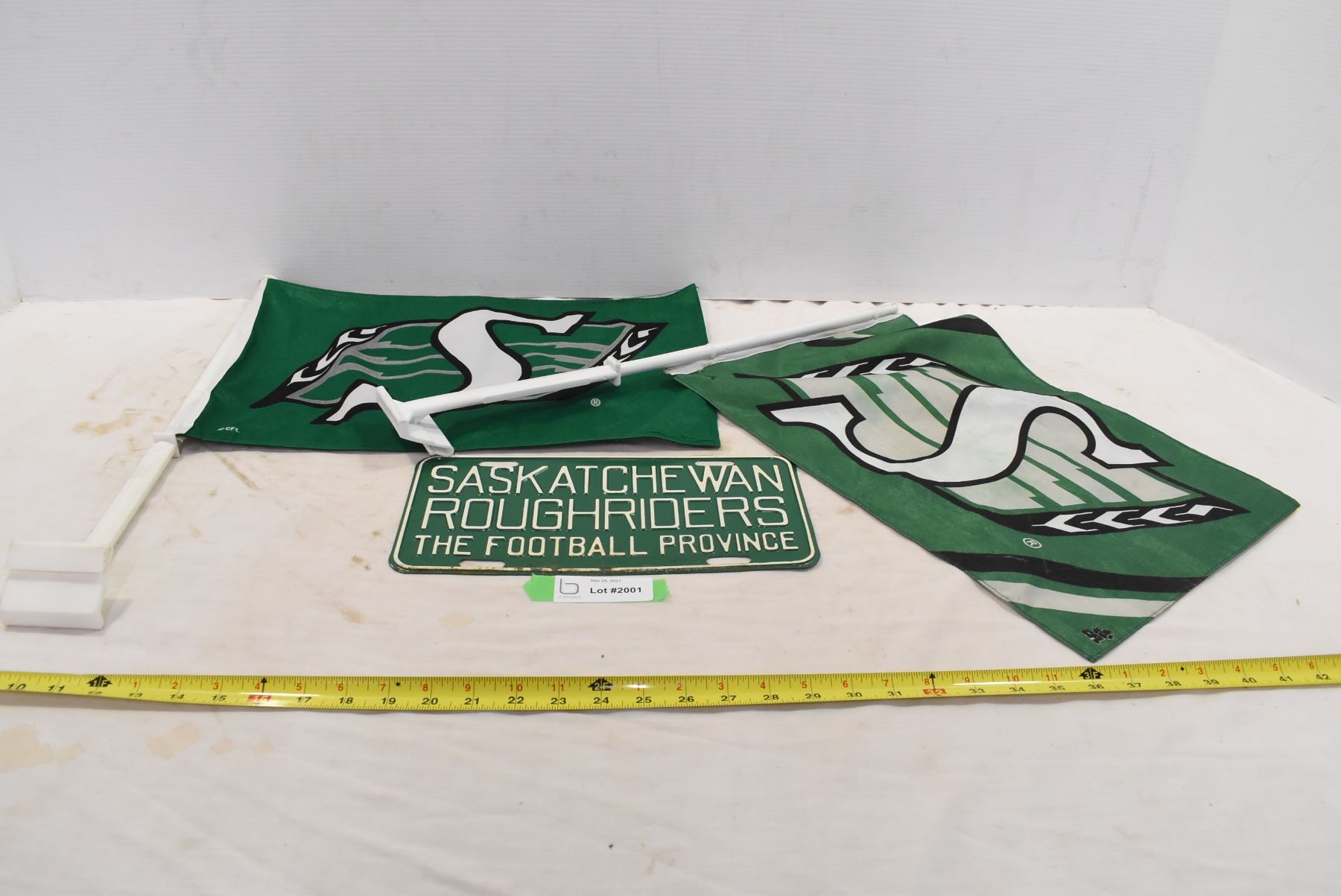 Sakatchewan Roughriders Staff Parking Plate (1980?) with Rider Flags