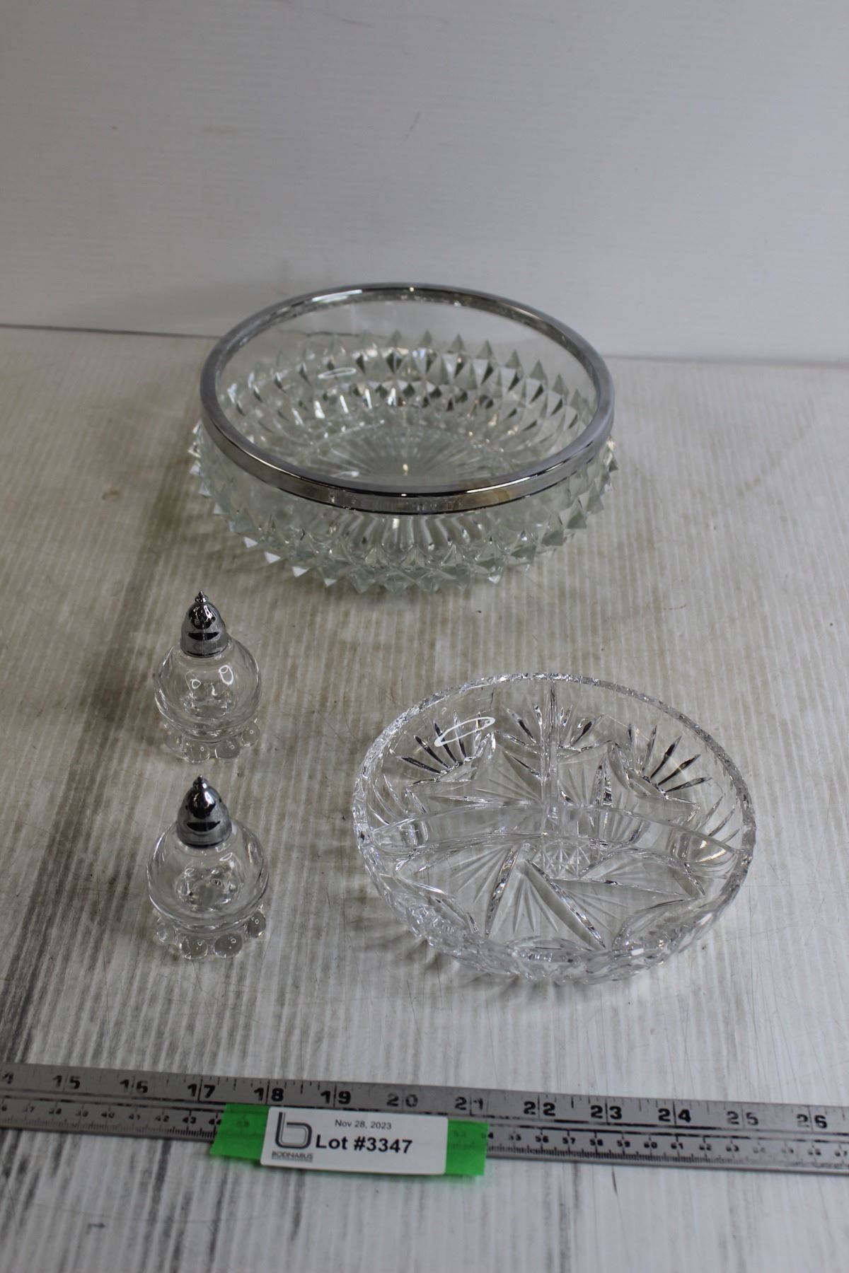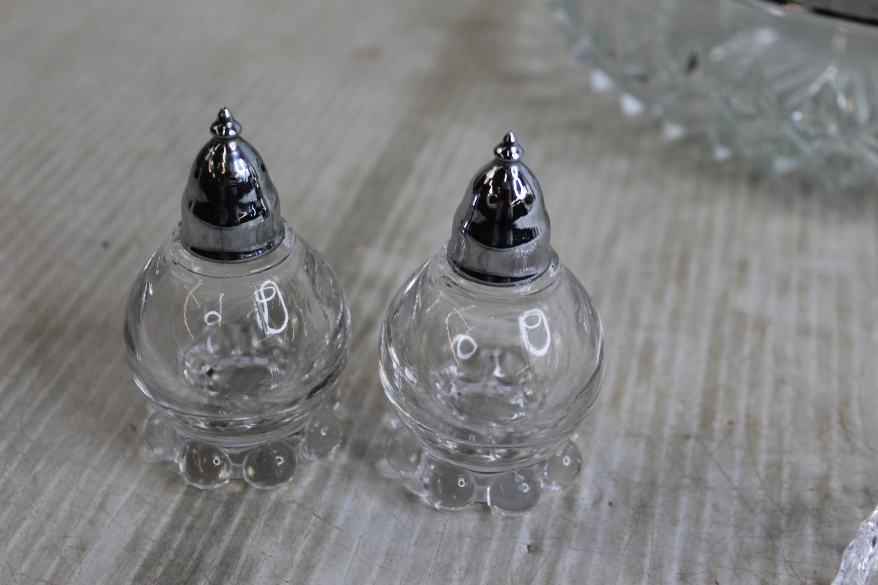 Salt and Pepper Shakers + Large Bowl + Crystal Divided Dish