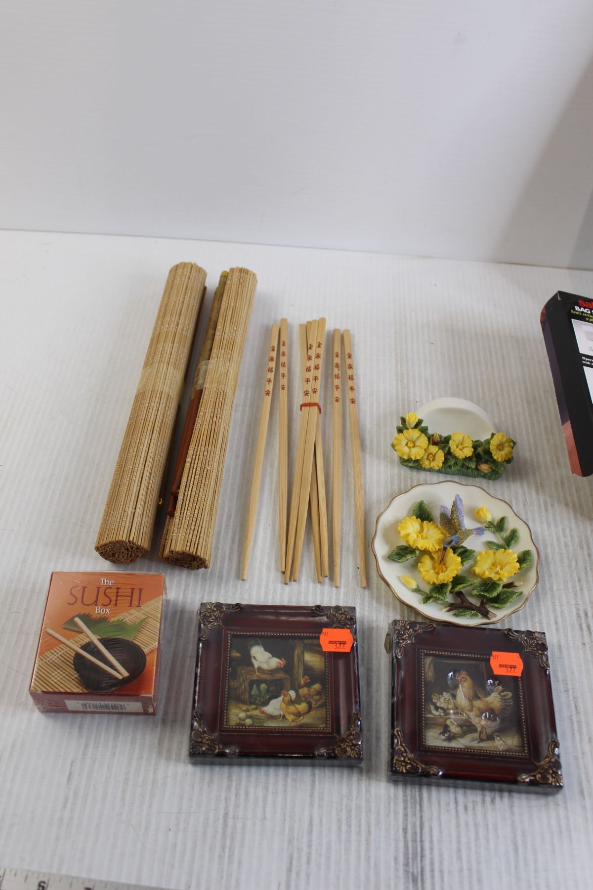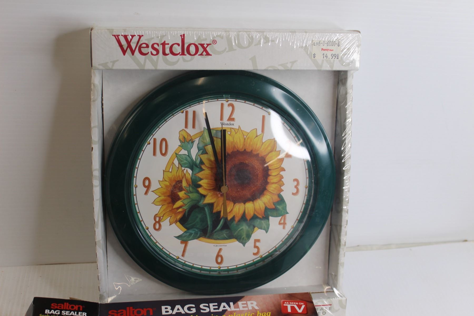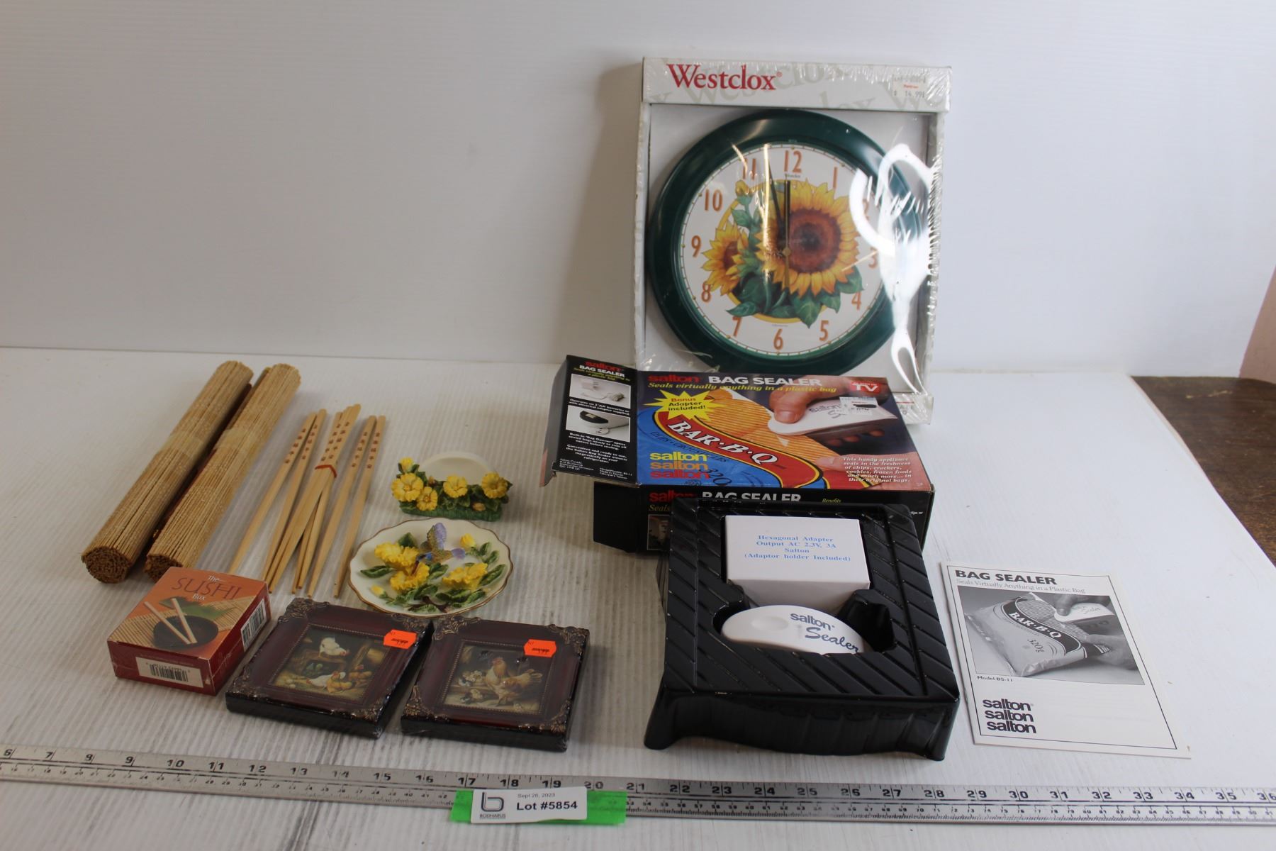 Salton Bag Sealer, Sunflower Clock - Sealed, (8) Chopsticks, Misc