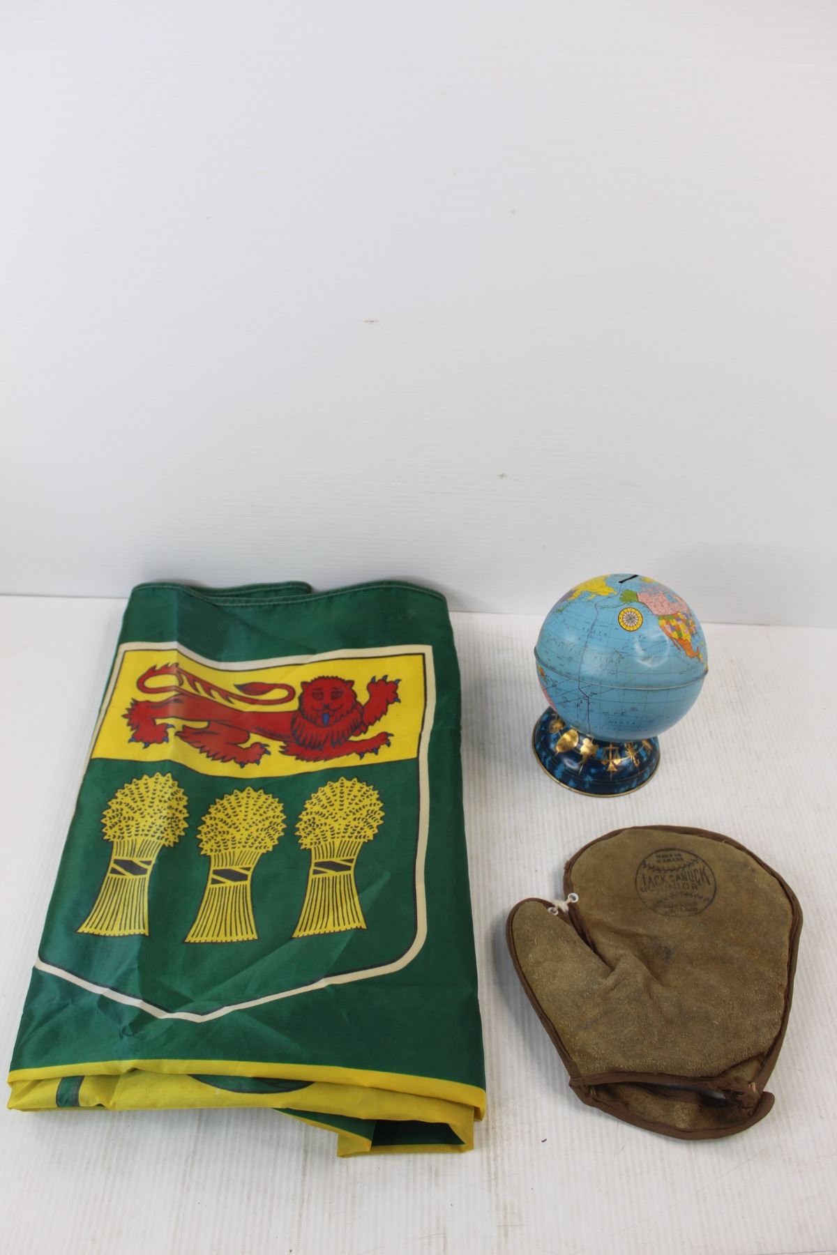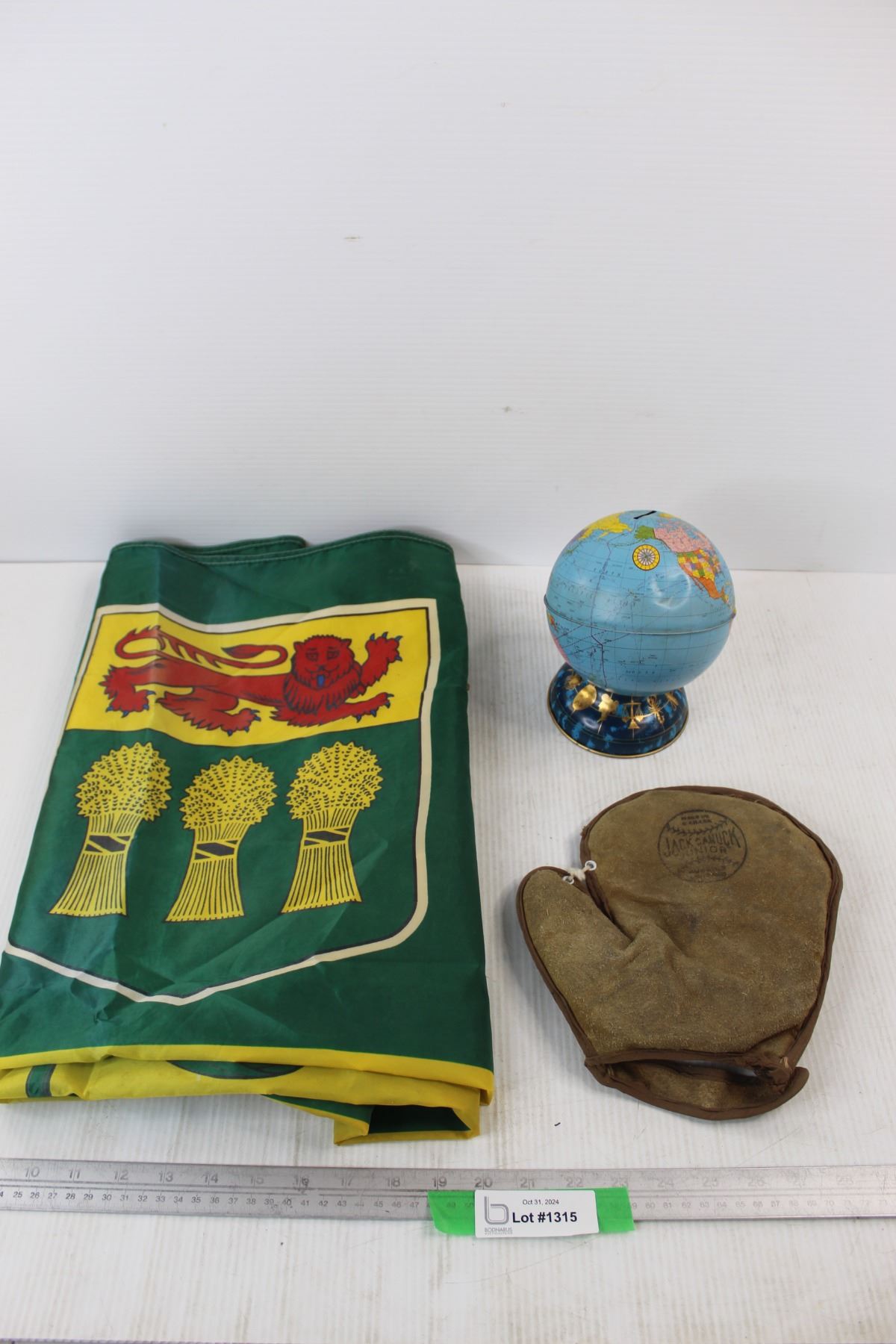 Saskatchewan Flag- 72'' x 36'', World Globe Piggy Bank, Vintage Very Old Jack Canuck Junior Baseball Glove